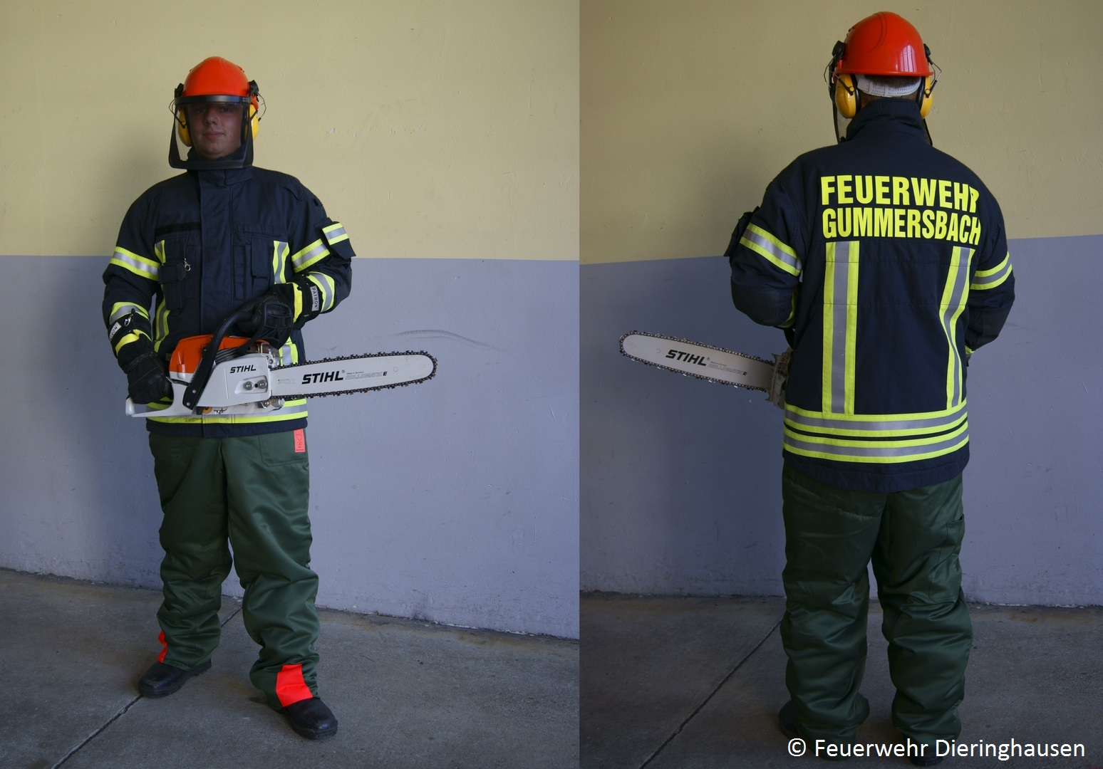 Die Forstausrüstung besteht aus: Schnittschutzhandschuhen, Schnittschutzhose, Schutzhelm mit Gehörschutz und speziellem Visier, ansonsten Feuerwehrschutzjacke und Feuerwehrstiefeln. |