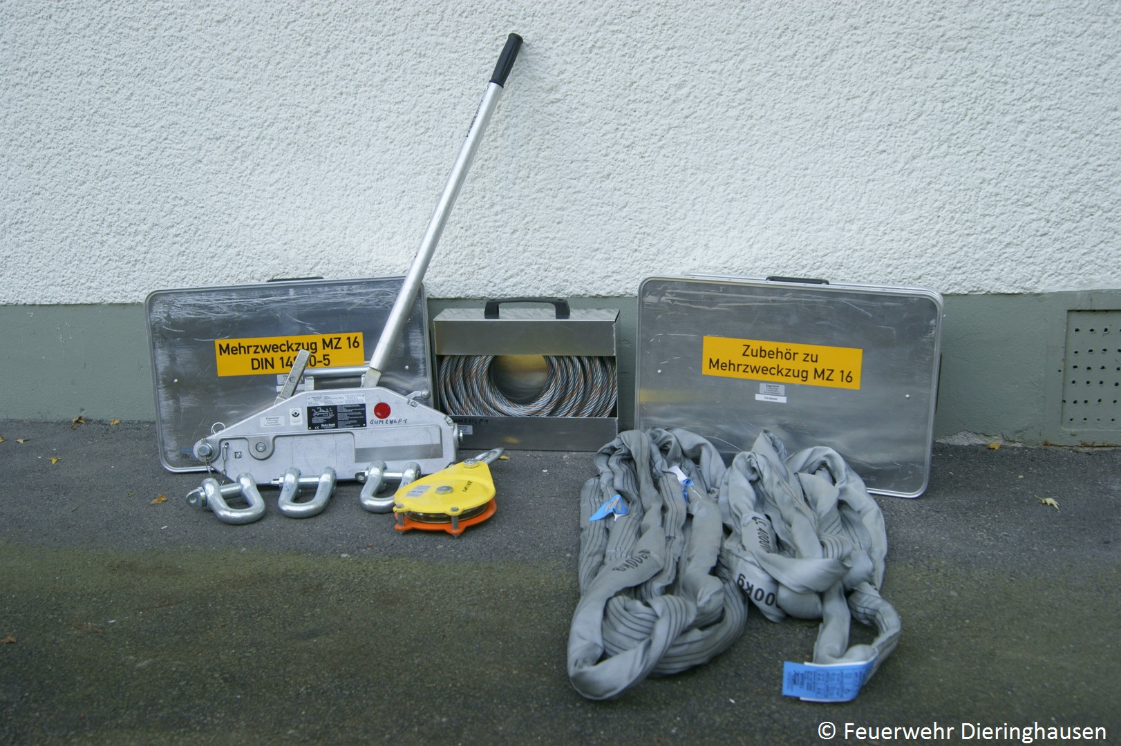 Mehrzweckzug Mit dem Mehrzweckzug kann man Lasten heben, ziehen und sichern. Zum Zubehör gehören Schäkel, Rundschlingen und eine Umlenkrolle. Die Zugkraft beträgt 1,6 Tonnen (16KN). |