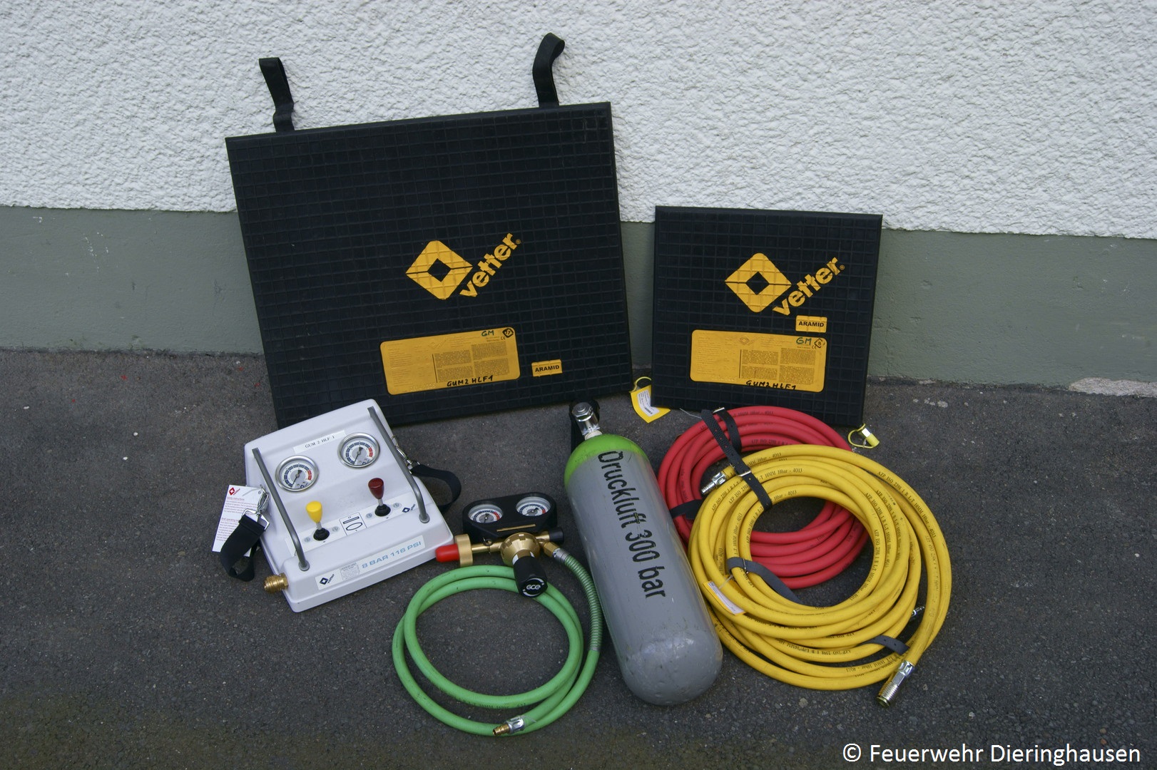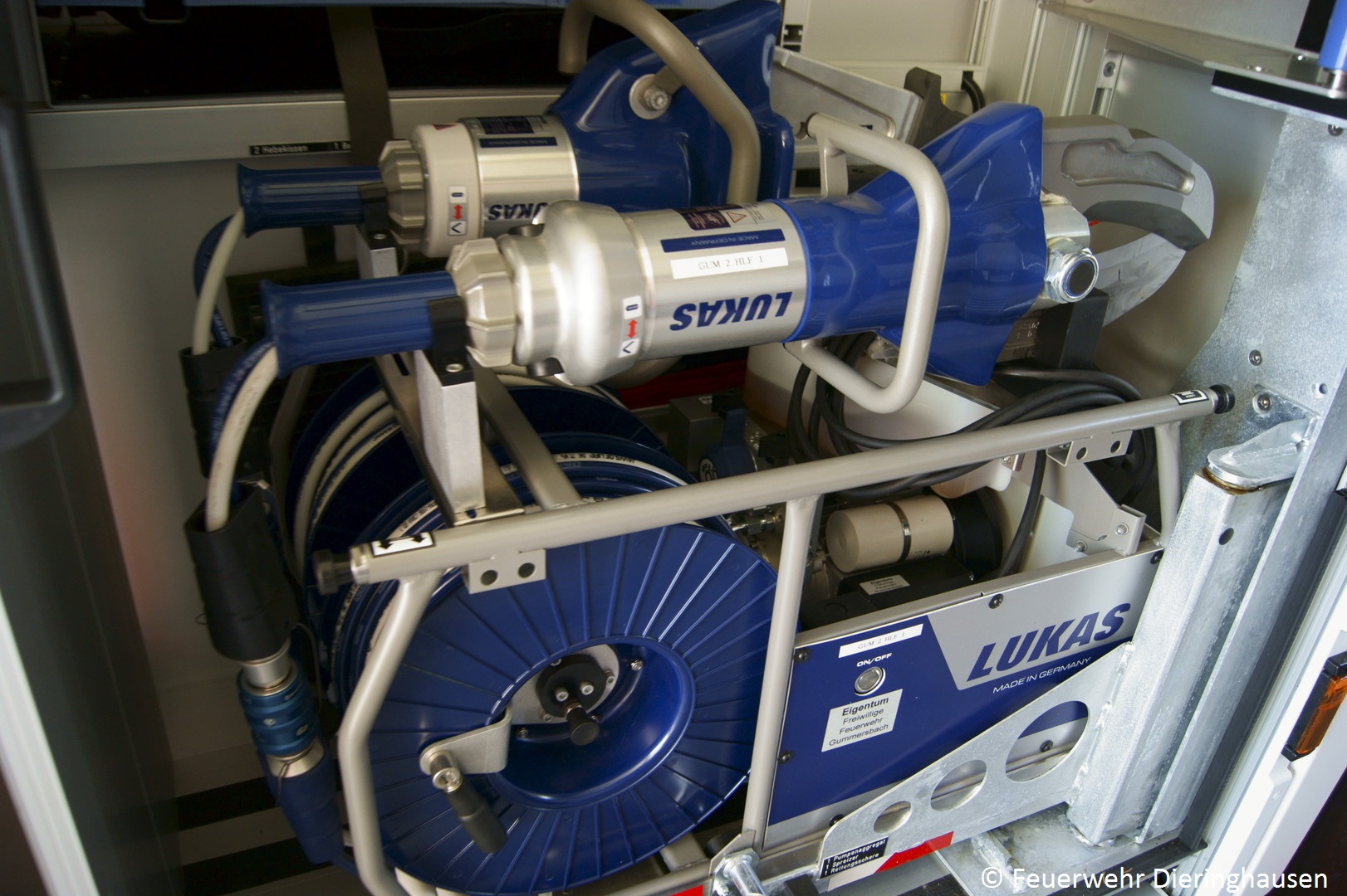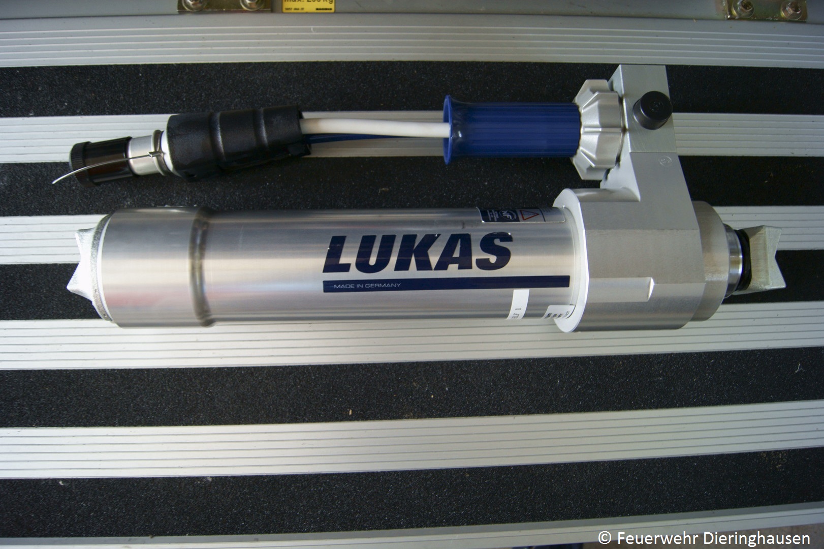 Hydraulischer Rettungssatz Der Rettungssatz besteht aus einem Hydraulikaggregat, einer Schere und einem Spreizer. Dieses Rettungsgerät wird eingesetzt um beispielsweise eingeklemmte Personen aus verunfallten Fahrzeugen zu befreien. Die Schere (Lukas S510) hat eine Schneidkraft von 98 t. Der Spreizer (Lukas SP310) hat eine Spreizkraft von 31 t. |