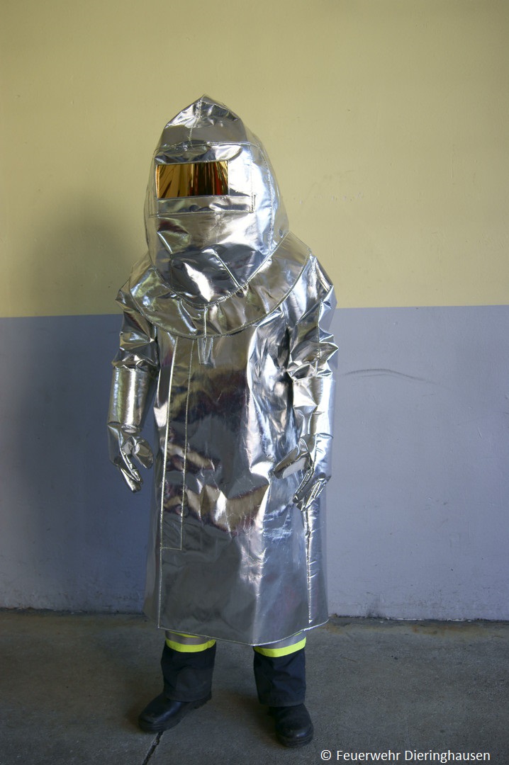 Hitzeschutzanzug Die Hitzeschutzkleidung ermöglicht dem Träger längere Zeit im Bereich größerer Hitzestrahlung zu arbeiten. |