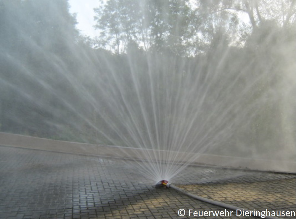 Hydroschild C Mit dem Hydroschild wird eine Wasserwand erzeugt. Eingesetzt wird es zur Abschirmung gegen Rauch, Flammen und Wärme, zum niederschlagen von giftigen Dämpfen und zum Schutz von Objekten. |