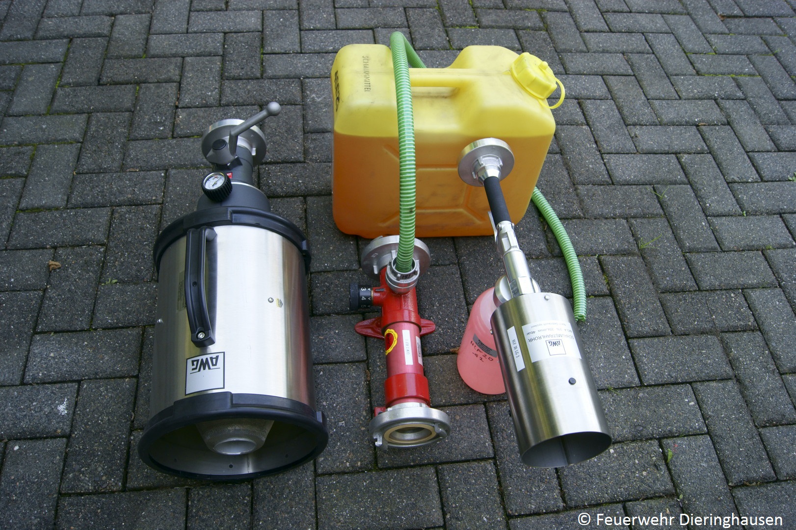 Schaummittel Bei manchen Bränden ist der Einsatz von Löschschaum nötig. Neben dem Mittelschaumrohr verfügen wir über eine handliche Schaumpistole. Der Löschschaum wird an der Einsatzstelle mit dem Zumischer, welcher dem Löschwasser das Schaummittel beifügt, und dem Schaummittel erzeugt. Damit Schaum entstehen kann fehlt dem Wasser-Schaummittel Gemisch Luft. Dafür werden spezielle Schaumrohre verwendet. Auf beiden Löschfahrzeugen führen wir jeweils 120L Schaummittel mit. |