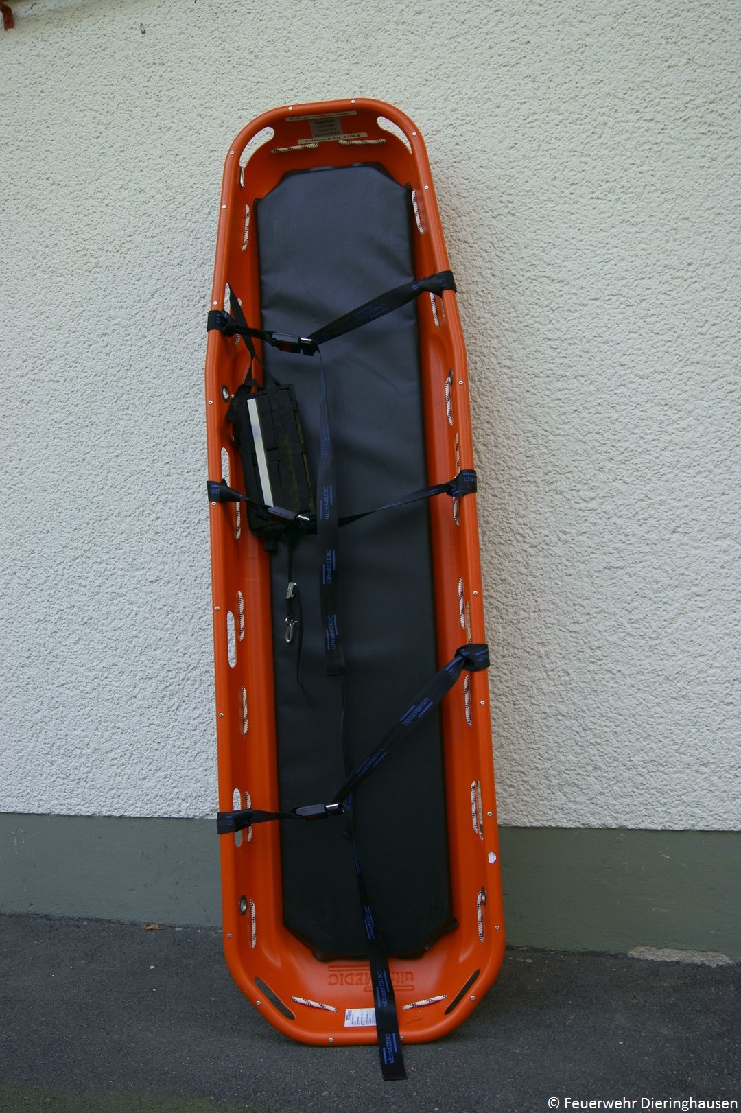 Die Schleifkorbtrage ermöglicht den Transport von Verletzten aus unwegsamen Gelände oder engen Gebäuden und Schächten. Sie kann von mehreren Kräften getragen und gesichert werden. So kann eine patientengerechte Rettung durchgeführt werden. |