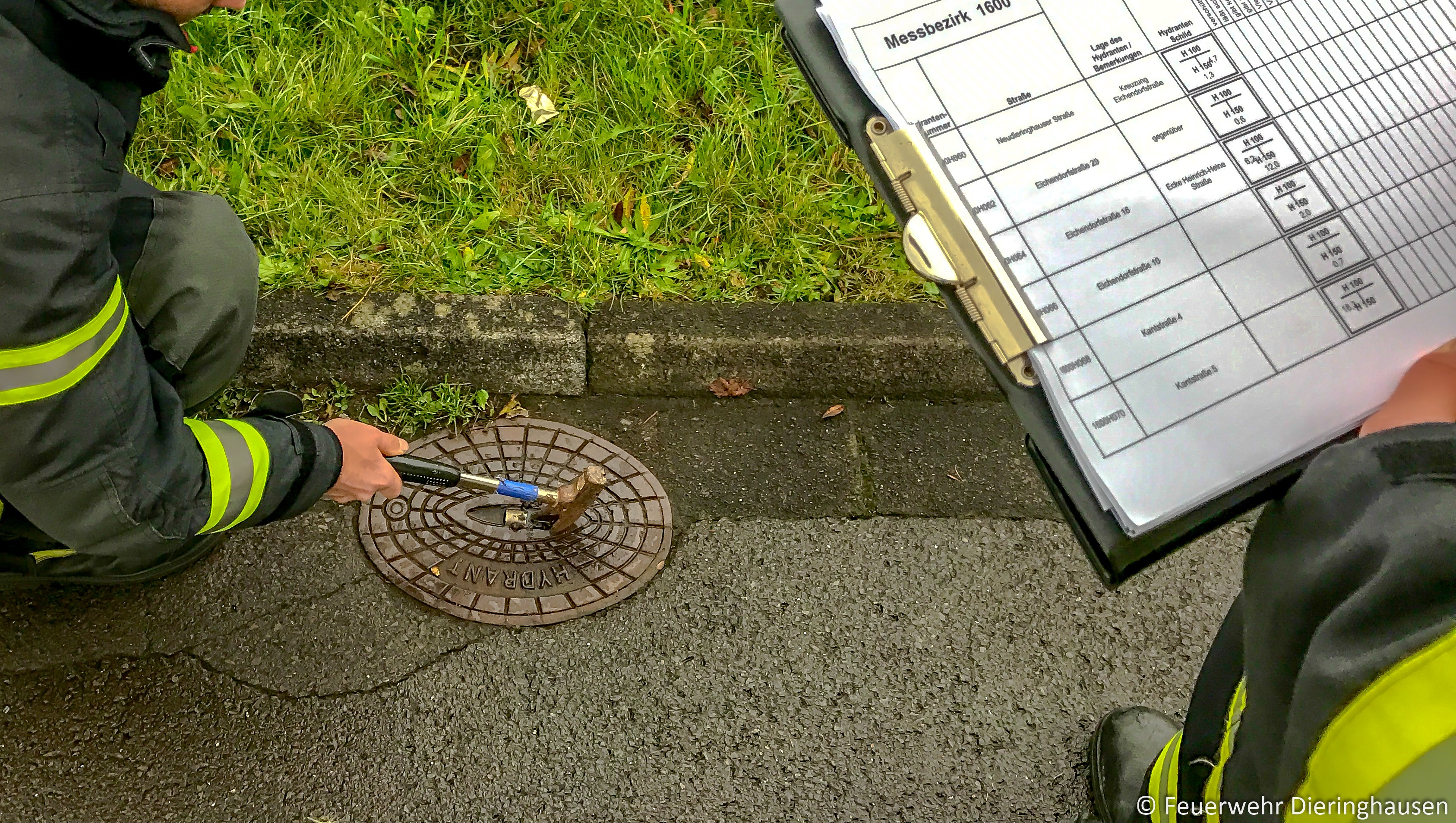 310 Unterflurhydranten gibt es im Einsatzgebiet der Löschgruppe Dieringhausen. Jeden Herbst sieht man Kleingruppen von Feuerwehrleuten, welche jeden Unterflurhydranten einzeln ablaufen, um die jährliche Pflege durchzuführen.
