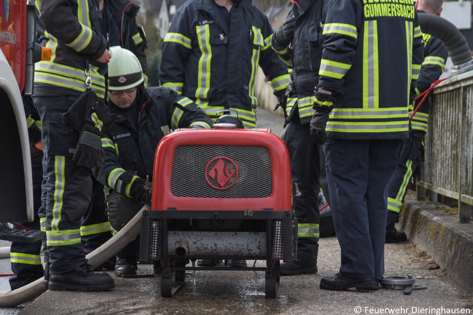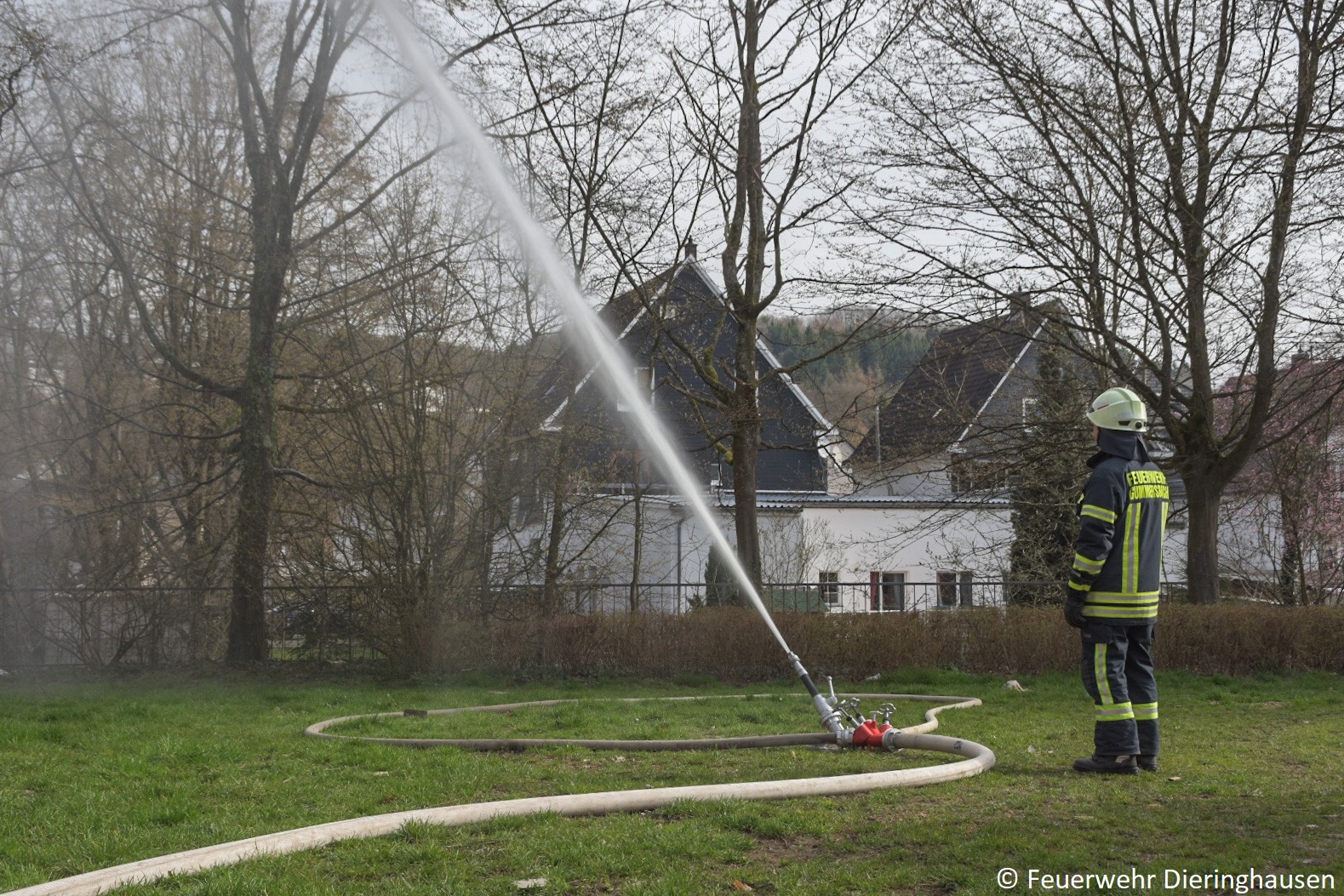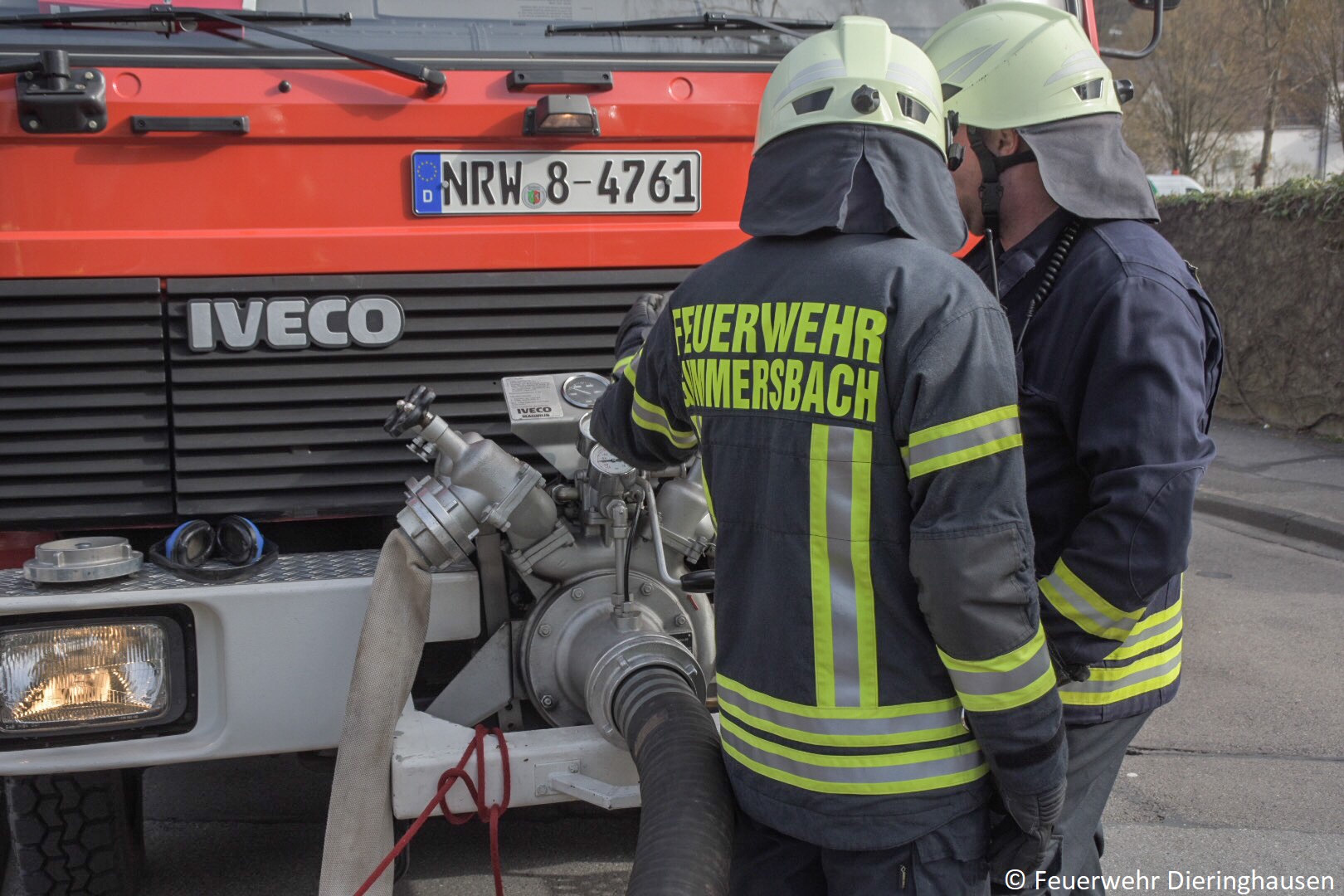 Es galt eine Wasserentnahmestelle mit dem Löschgruppenfahrzeug einzurichten und von dort aus eine Löschwasserversorgung zum Hilfeleistungslöschfahrzeug aufzubauen. Um einen realistischen Verbrauch von Löschwasser zu simulieren, wurde ein Wasserwerfer aufgebaut. Die Maschinisten waren bei der Bedienung unserer Feuerlöschkreiselpumpen gefordert. Auch die erschwerte Wasserentnahme von der Aggerbrücke aus war für die Pumpe des Löschgruppenfahrzeugs kein Problem. Stetiges Training im Umgang mit den Feuerlöschkreiselpumpen ist wichtig, damit im Einsatz jeder Handgriff sitzt.