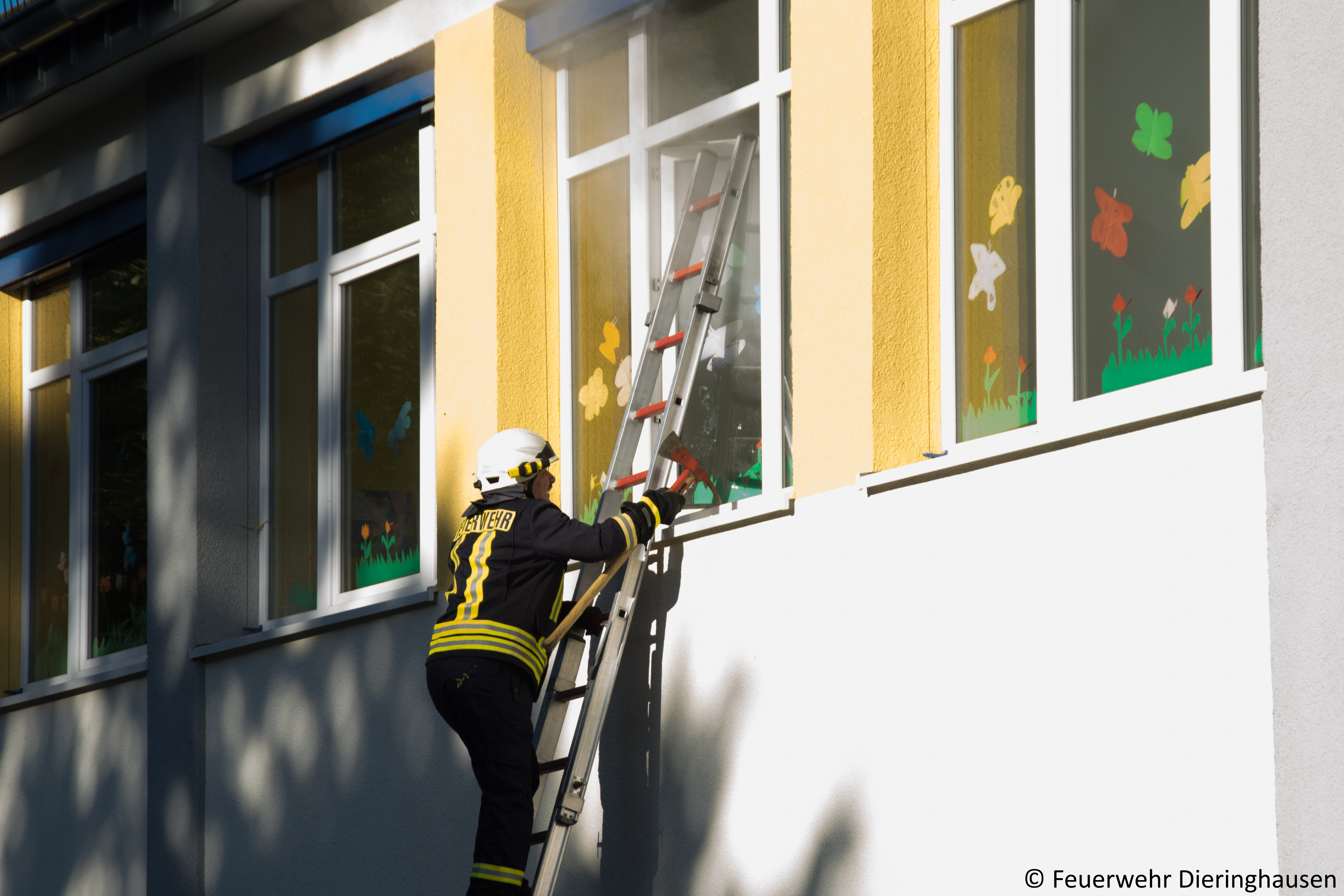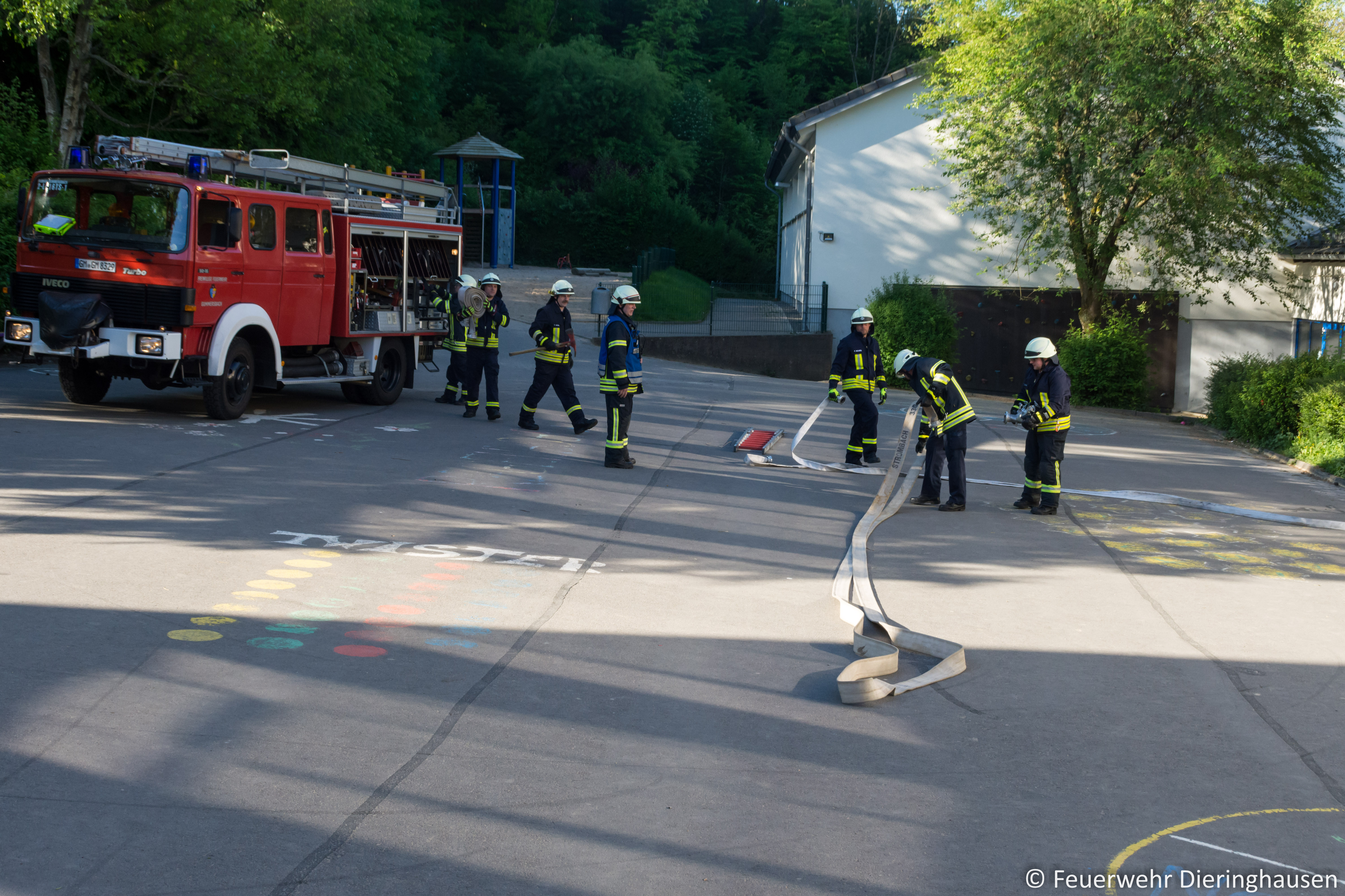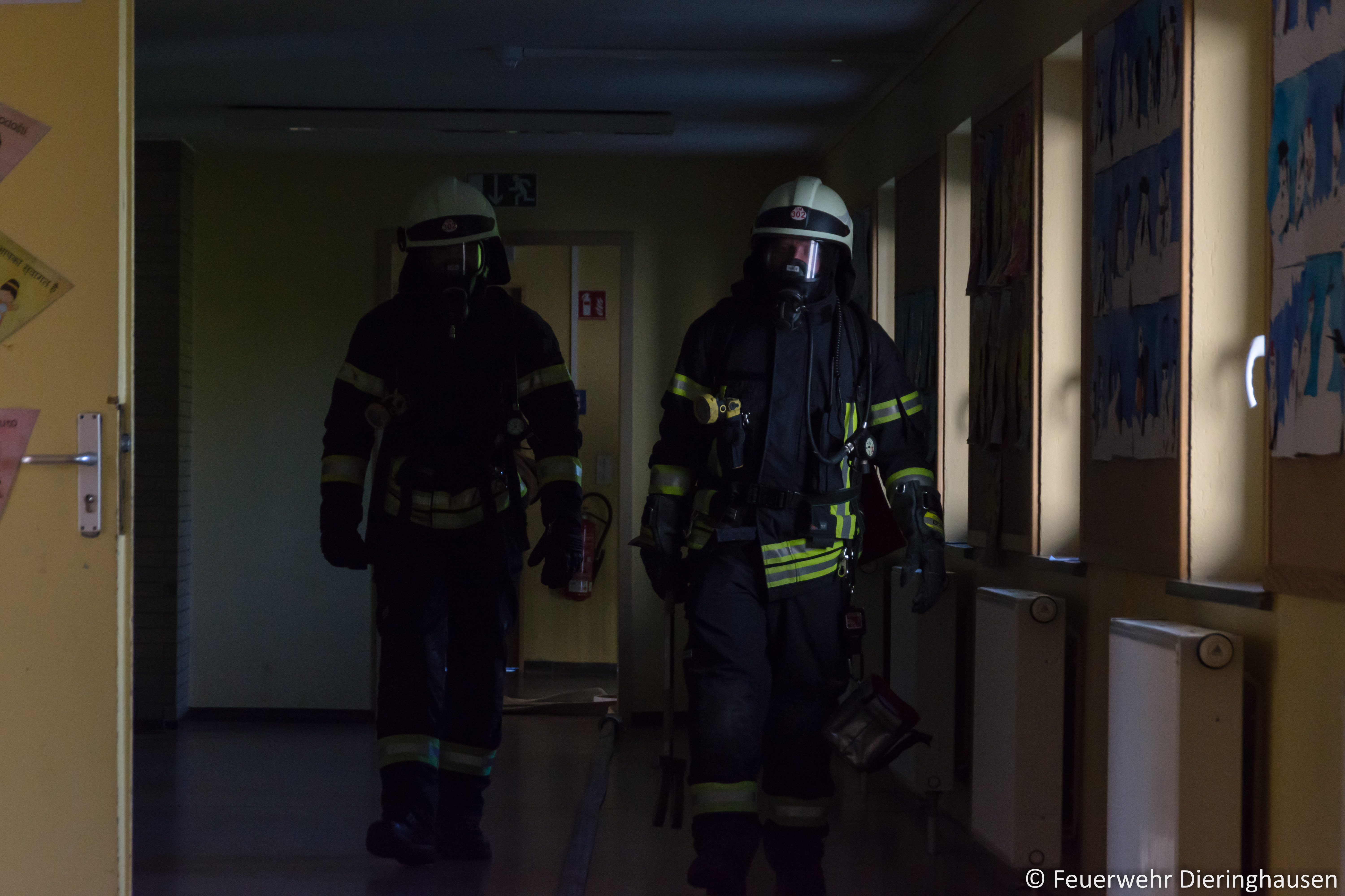 Ein Hausmeister der Schule empfing die Einsatzkräfte am Haupteingang und berichtete von einer Rauchentwicklung aus dem Fenster im ersten Obergeschoss. Bei der Erkundung durch den Gruppenführer bestätigte sich die Lage. Glücklicherweise fand zur Zeit des Brandausbruchs kein Unterricht statt, sodass sich keine Schüler im Gebäude aufhielten. Unverzüglich ging ein Trupp unter Atemschutz zur Menschrettung und Brandbekämpfung in das Gebäude vor. Parallel wurde im Innenhof ein weiterer Zugangsweg über die Steckleiter vorbereitet. Schnell konnte eine Person aus dem brennenden Klassenzimmer gerettet und der Brand gelöscht werden.