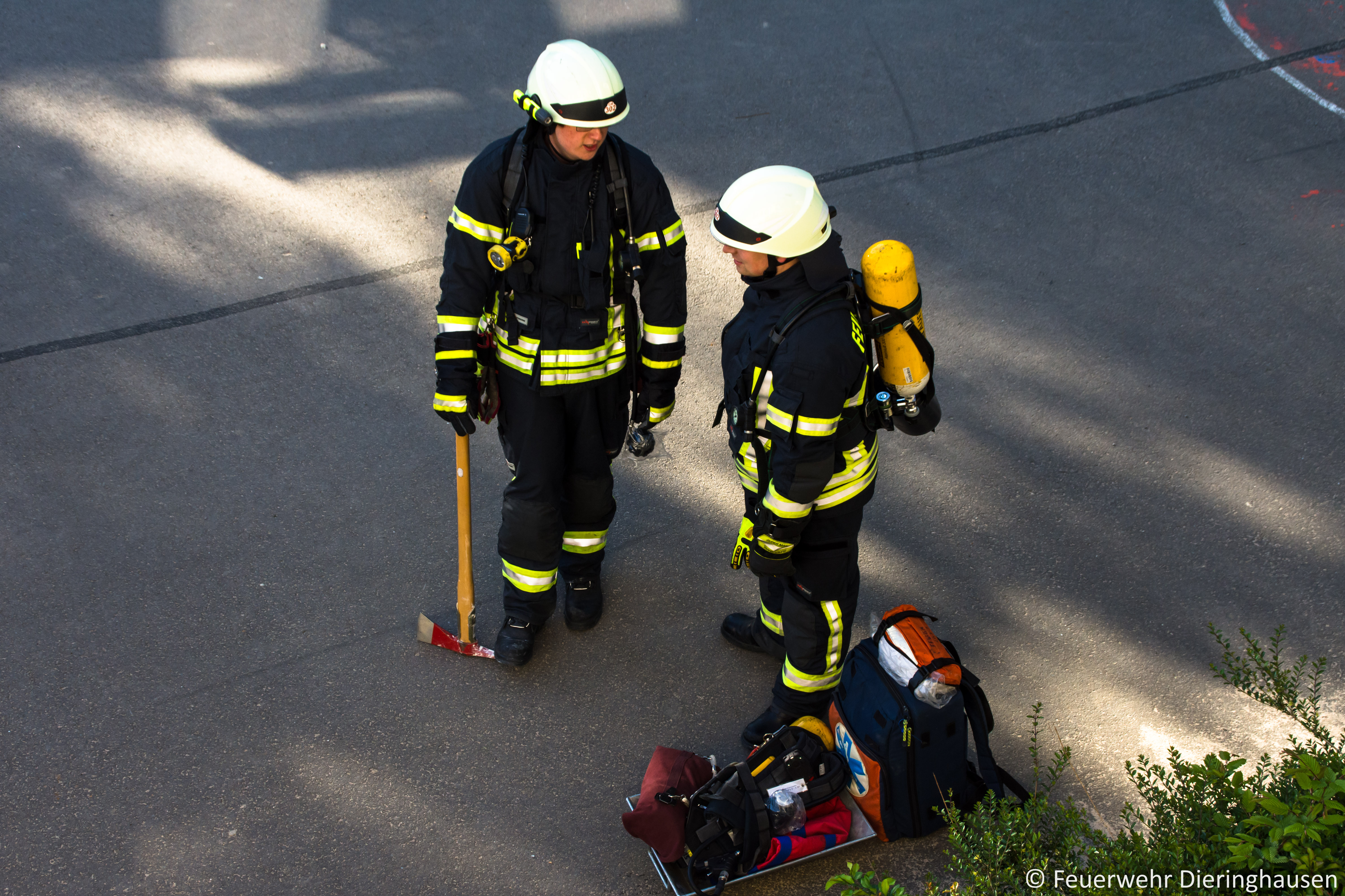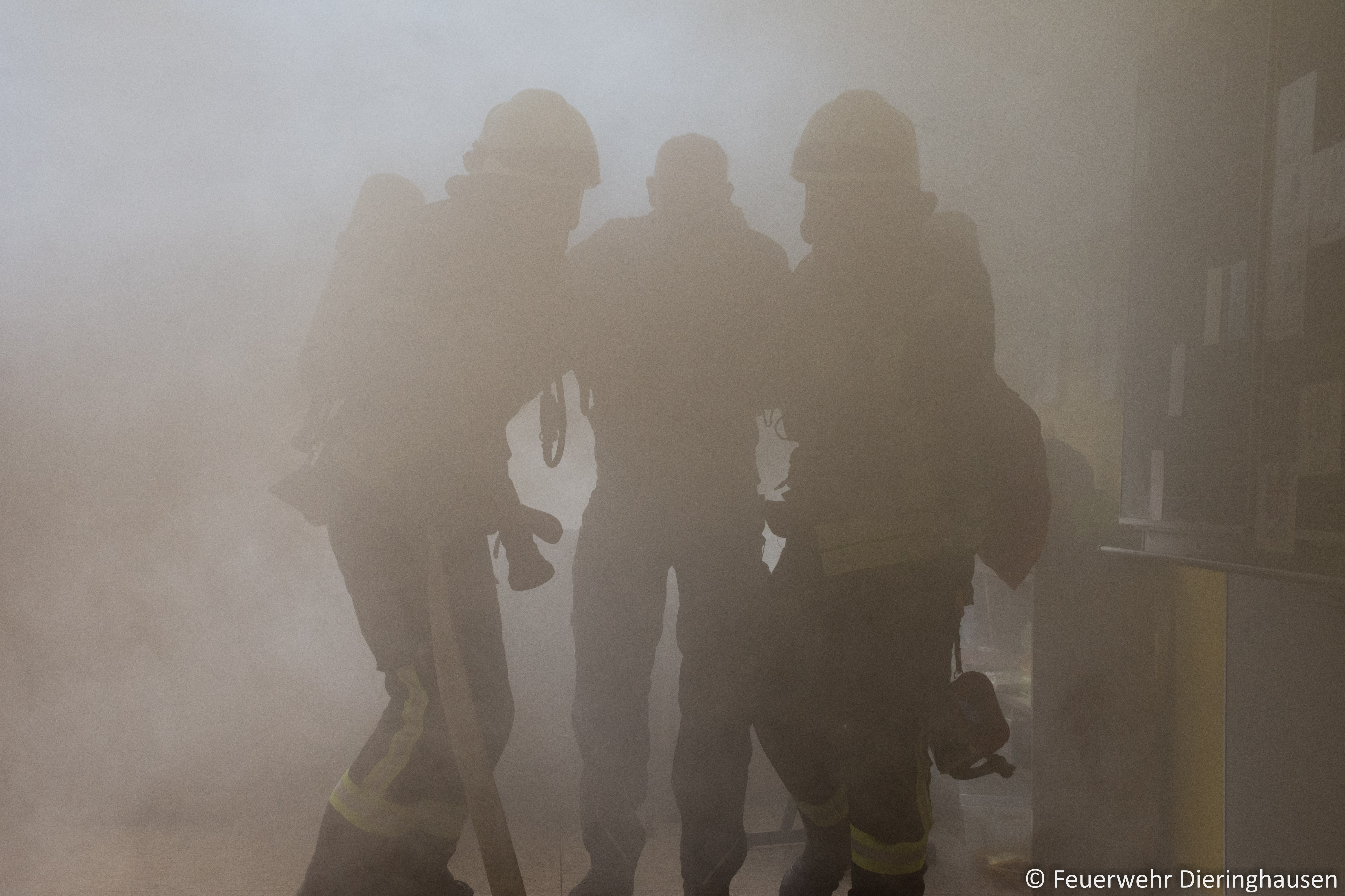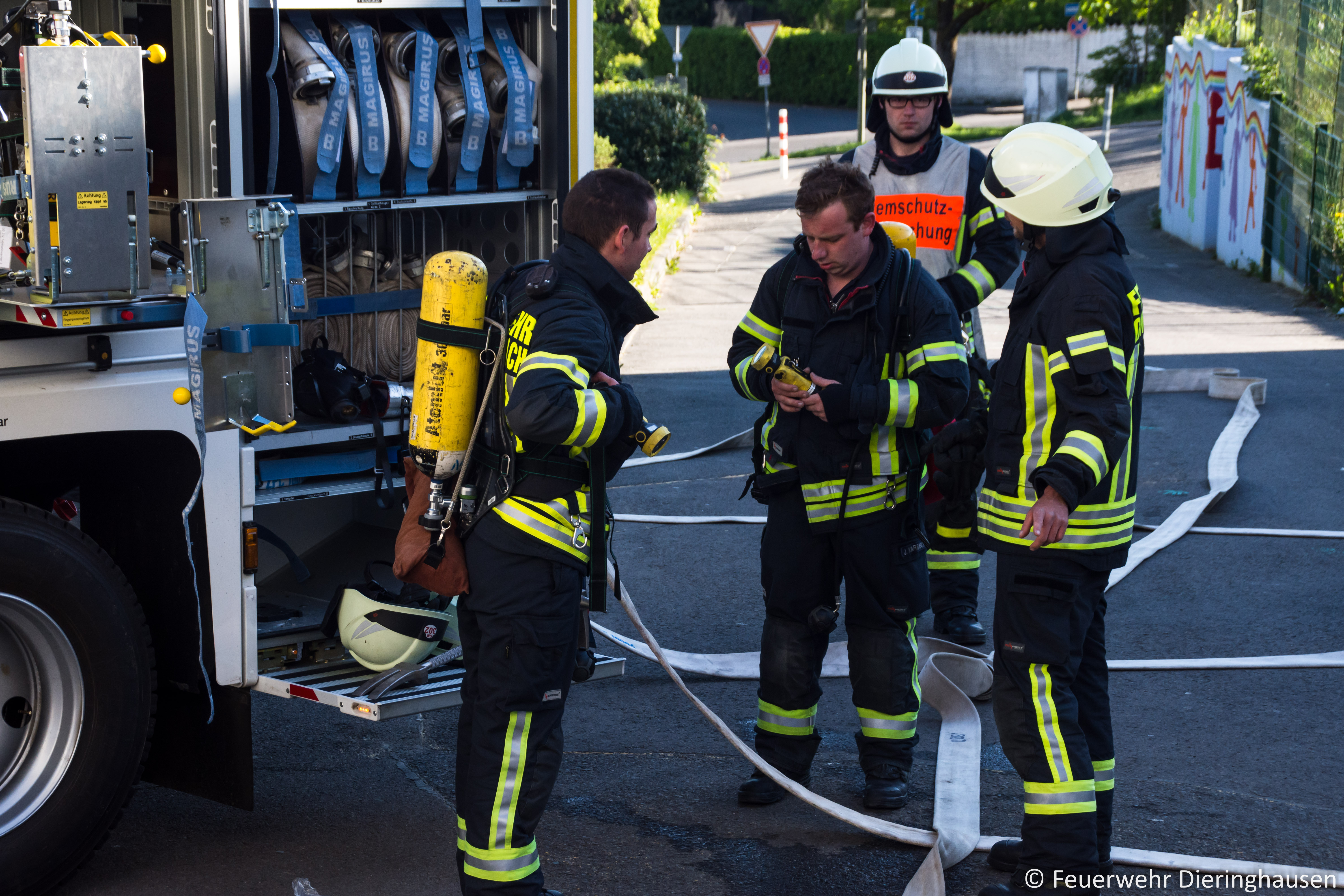 Ein Hausmeister der Schule empfing die Einsatzkräfte am Haupteingang und berichtete von einer Rauchentwicklung aus dem Fenster im ersten Obergeschoss. Bei der Erkundung durch den Gruppenführer bestätigte sich die Lage. Glücklicherweise fand zur Zeit des Brandausbruchs kein Unterricht statt, sodass sich keine Schüler im Gebäude aufhielten. Unverzüglich ging ein Trupp unter Atemschutz zur Menschrettung und Brandbekämpfung in das Gebäude vor. Parallel wurde im Innenhof ein weiterer Zugangsweg über die Steckleiter vorbereitet. Schnell konnte eine Person aus dem brennenden Klassenzimmer gerettet und der Brand gelöscht werden.