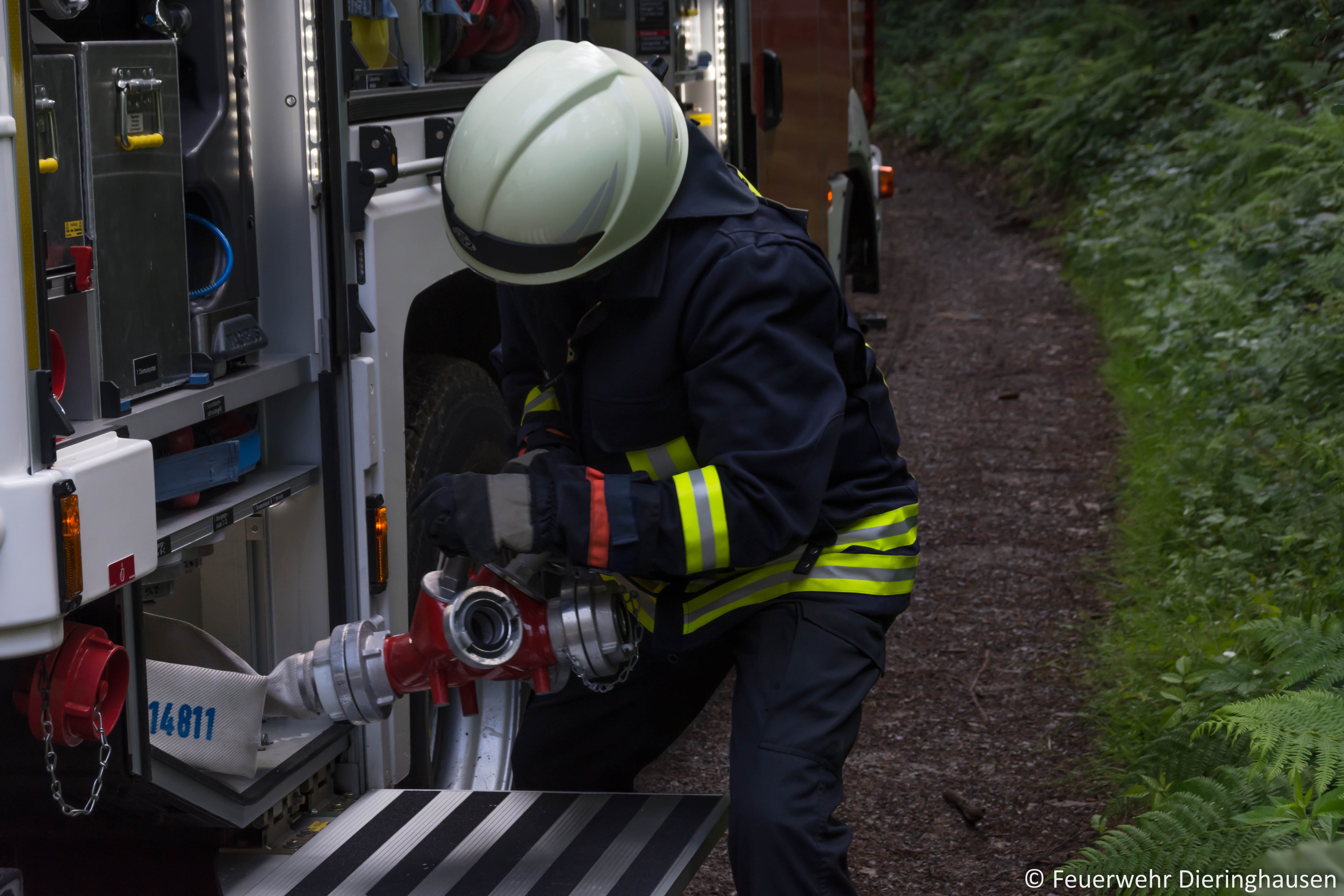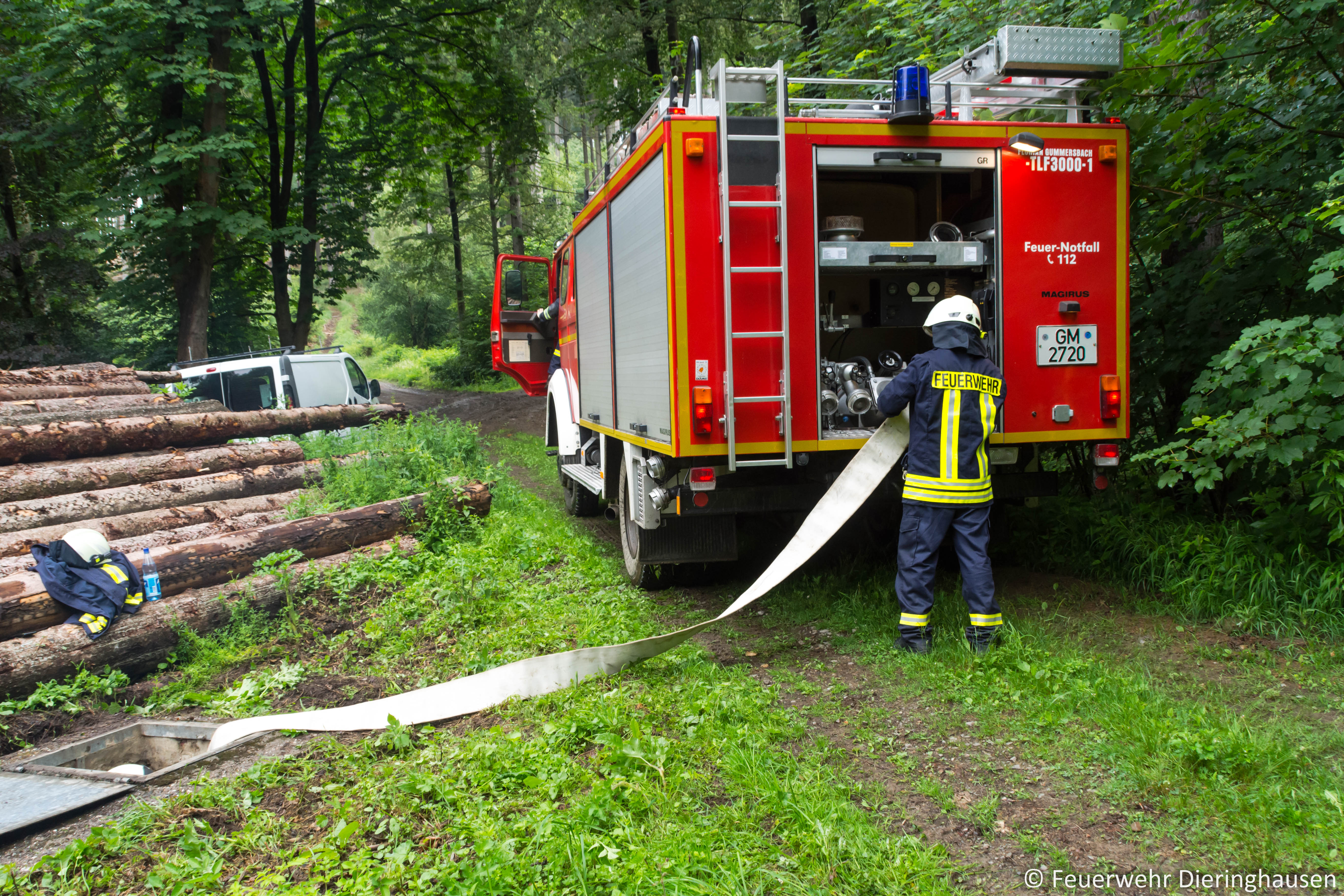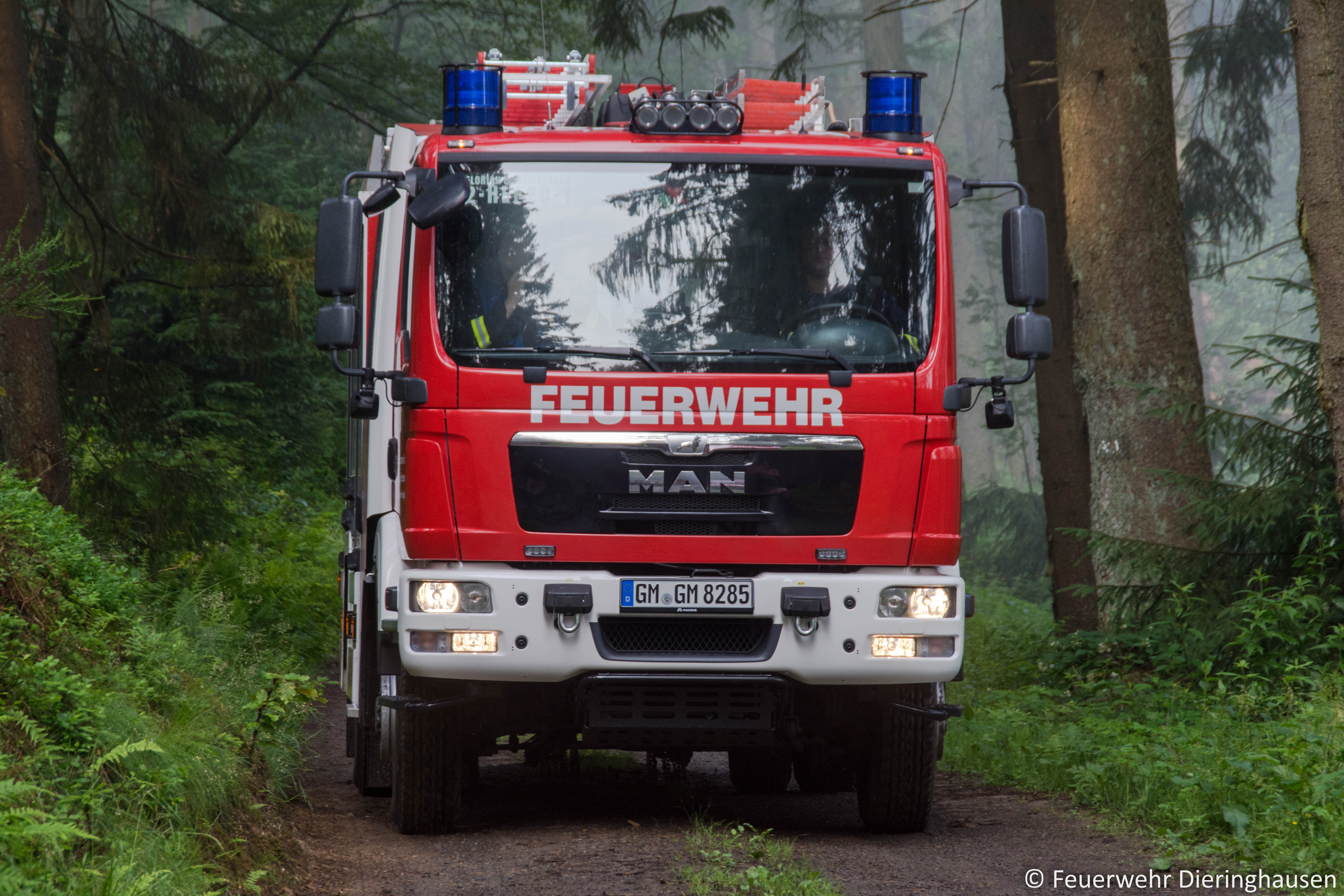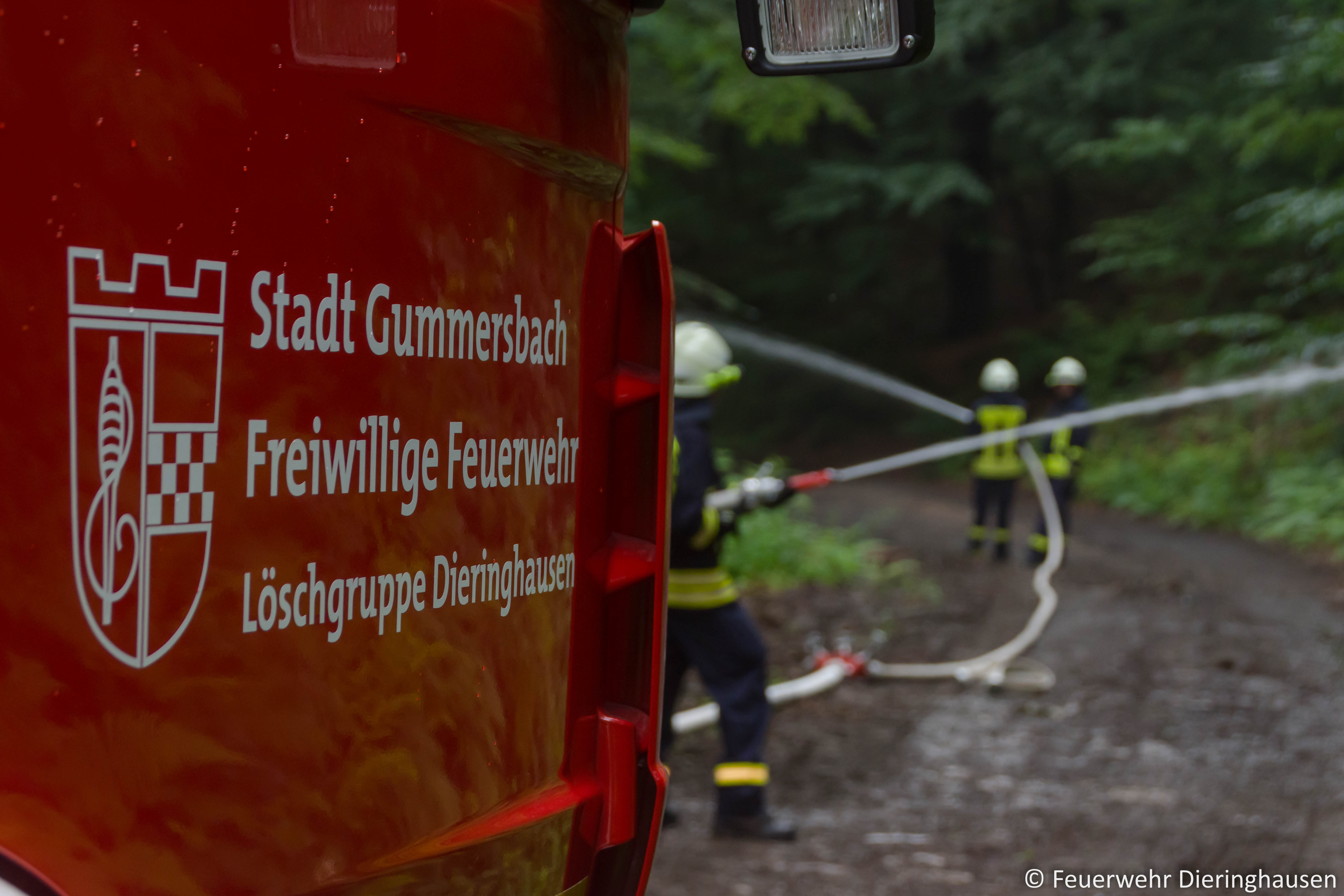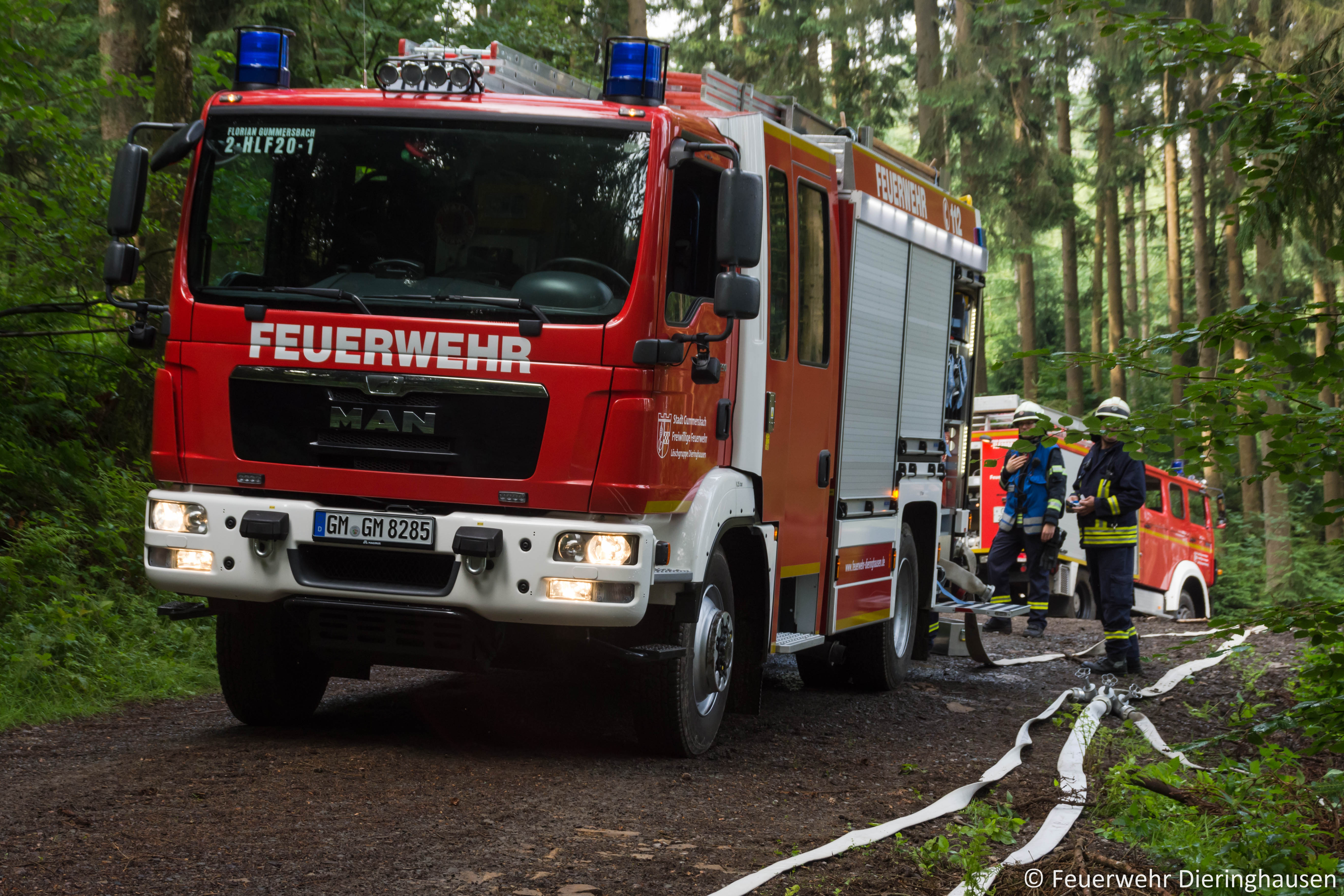 Aus dem Bereitstellungsraum an der Aggerhalle rückten die Einsatzkräfte des Löschzug 5 der Feuerwehr Gummersbach über vorgegebene Zufahrtswege ins Waldgebiet Meerhardt aus. Dort war es zu einem Waldbrand nahe Lobscheid gekommen. Die Übung wurde aus dem Gerätewagen-Messtechnik, welcher als Einsatzleitwagen eingesetzt wurde, koordiniert. Anders als bei Einsätzen im Ort stellen die topographischen Gegebenheiten in unwegsamen Gelände eine besondere Herausforderung für die Einsatzkräfte dar. Geeignete Zufahrtswege müssen rasch gefunden und eine Löschwasserversorgung sichergestellt werden. Aus zwei Waldhydranten konnte das Löschwasser entnommen und über lange Schlauchleitungen querfeldein zum Brandort transportiert werden. Zudem wurde ein Pendelverkehr mit einem Tanklöschfahrzeug eingerichtet.