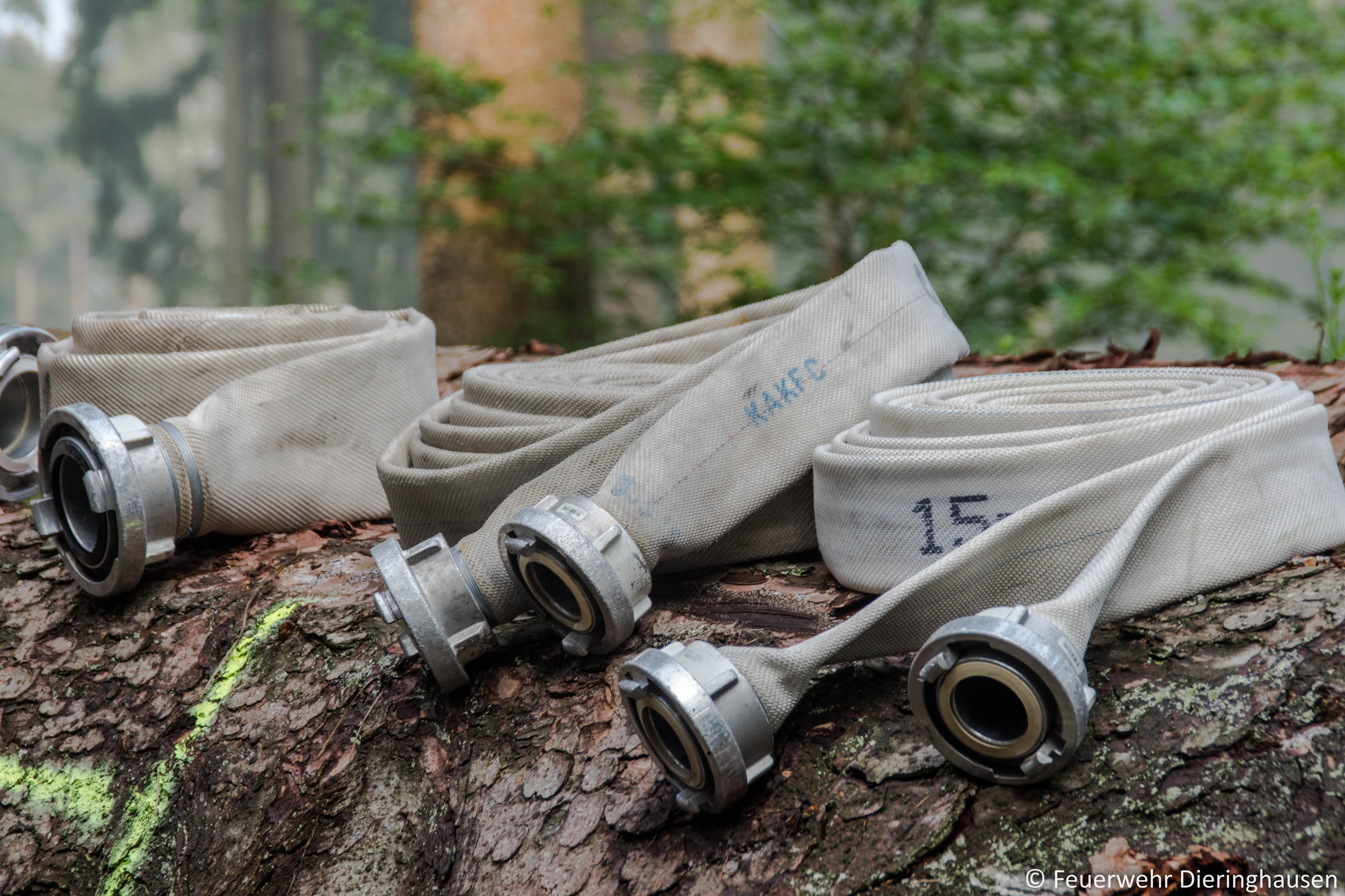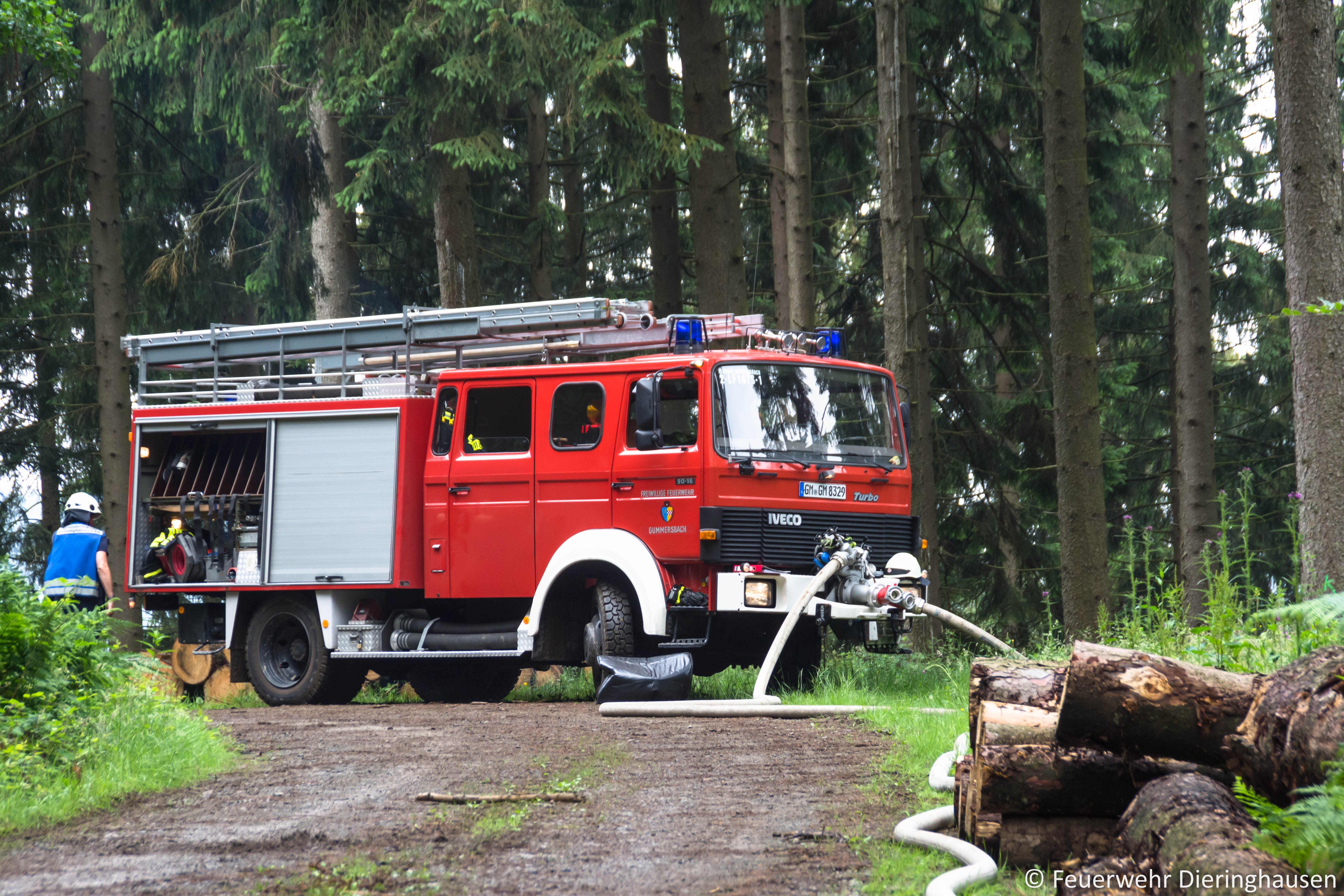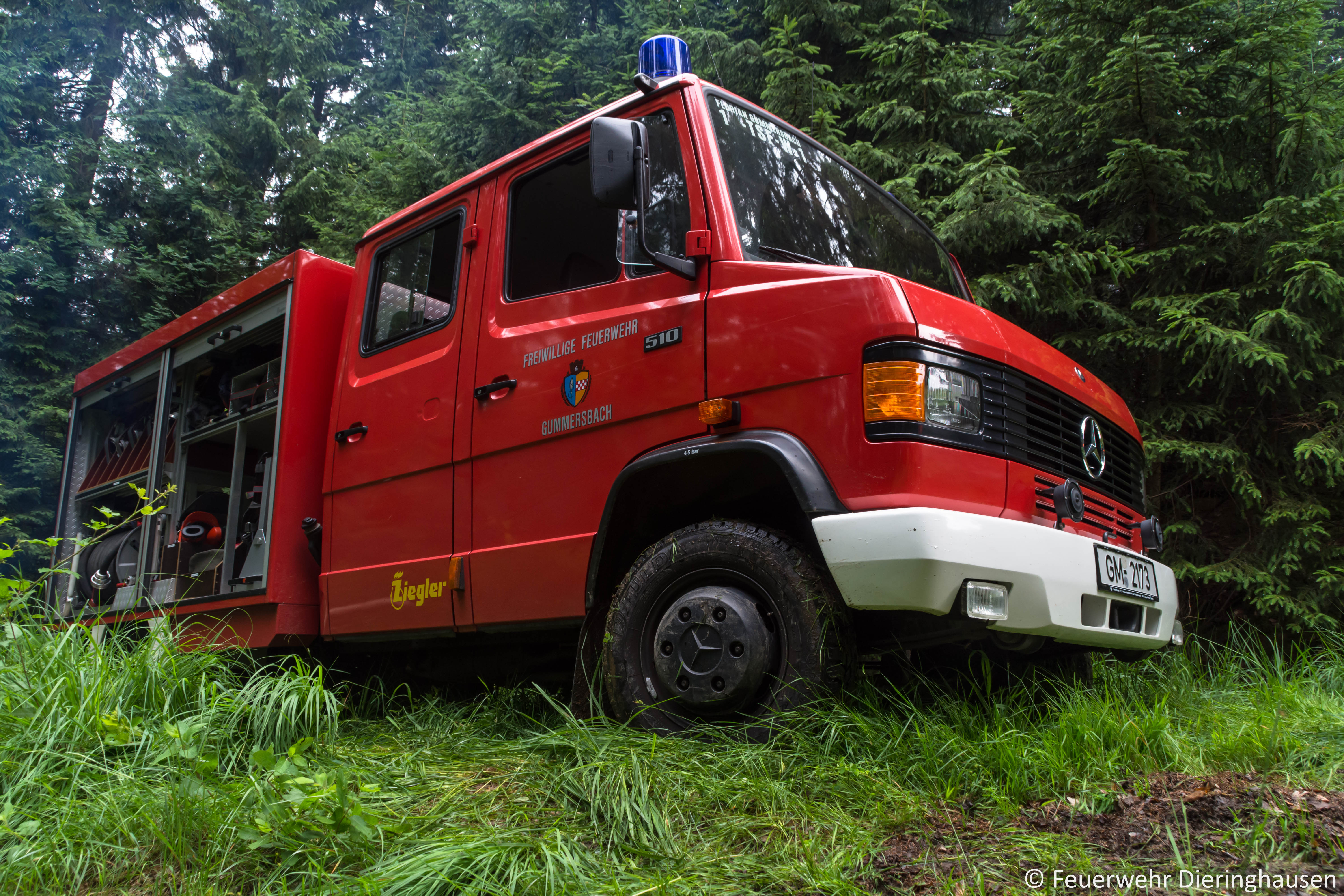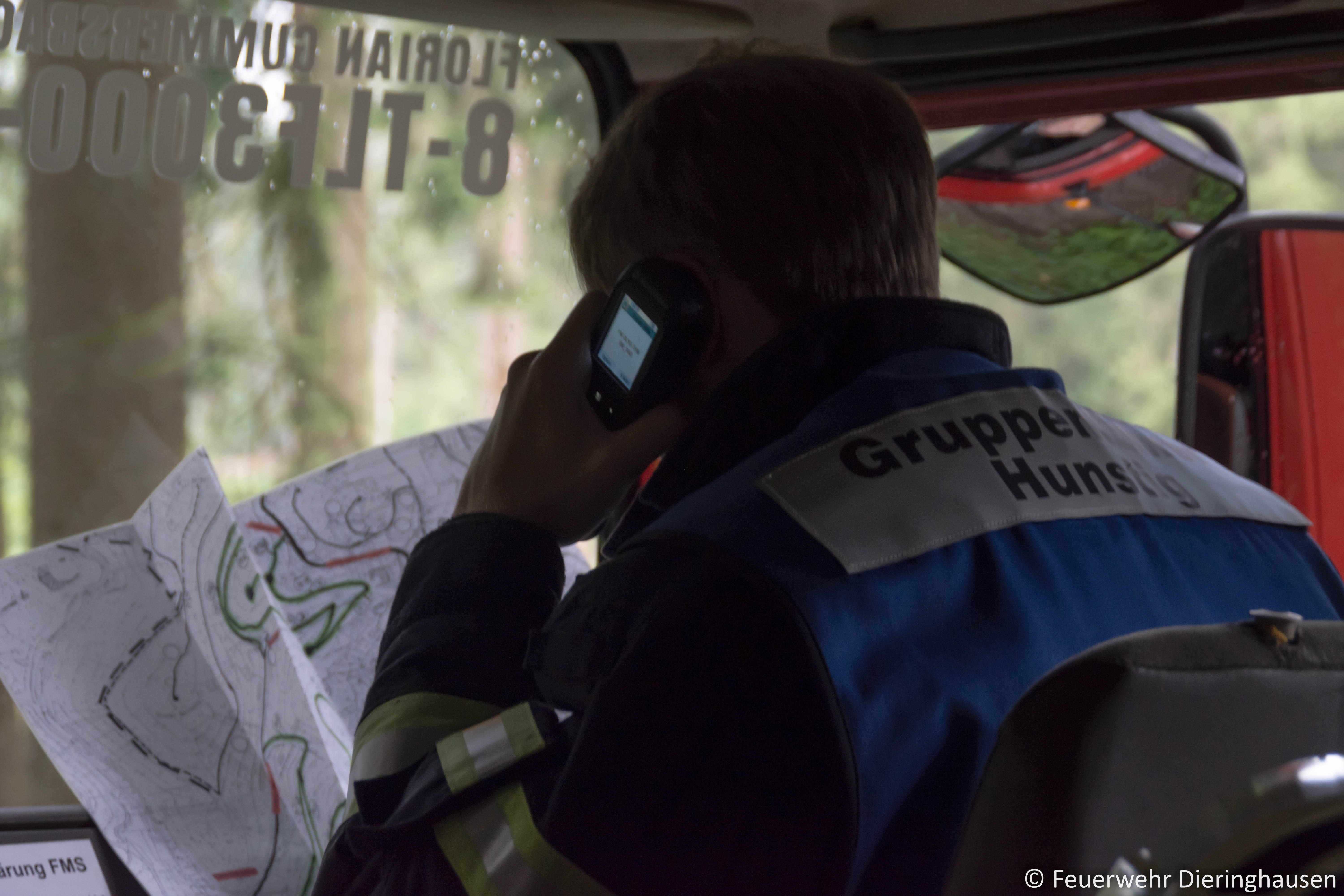 Aus dem Bereitstellungsraum an der Aggerhalle rückten die Einsatzkräfte des Löschzug 5 der Feuerwehr Gummersbach über vorgegebene Zufahrtswege ins Waldgebiet Meerhardt aus. Dort war es zu einem Waldbrand nahe Lobscheid gekommen. Die Übung wurde aus dem Gerätewagen-Messtechnik, welcher als Einsatzleitwagen eingesetzt wurde, koordiniert. Anders als bei Einsätzen im Ort stellen die topographischen Gegebenheiten in unwegsamen Gelände eine besondere Herausforderung für die Einsatzkräfte dar. Geeignete Zufahrtswege müssen rasch gefunden und eine Löschwasserversorgung sichergestellt werden. Aus zwei Waldhydranten konnte das Löschwasser entnommen und über lange Schlauchleitungen querfeldein zum Brandort transportiert werden. Zudem wurde ein Pendelverkehr mit einem Tanklöschfahrzeug eingerichtet.