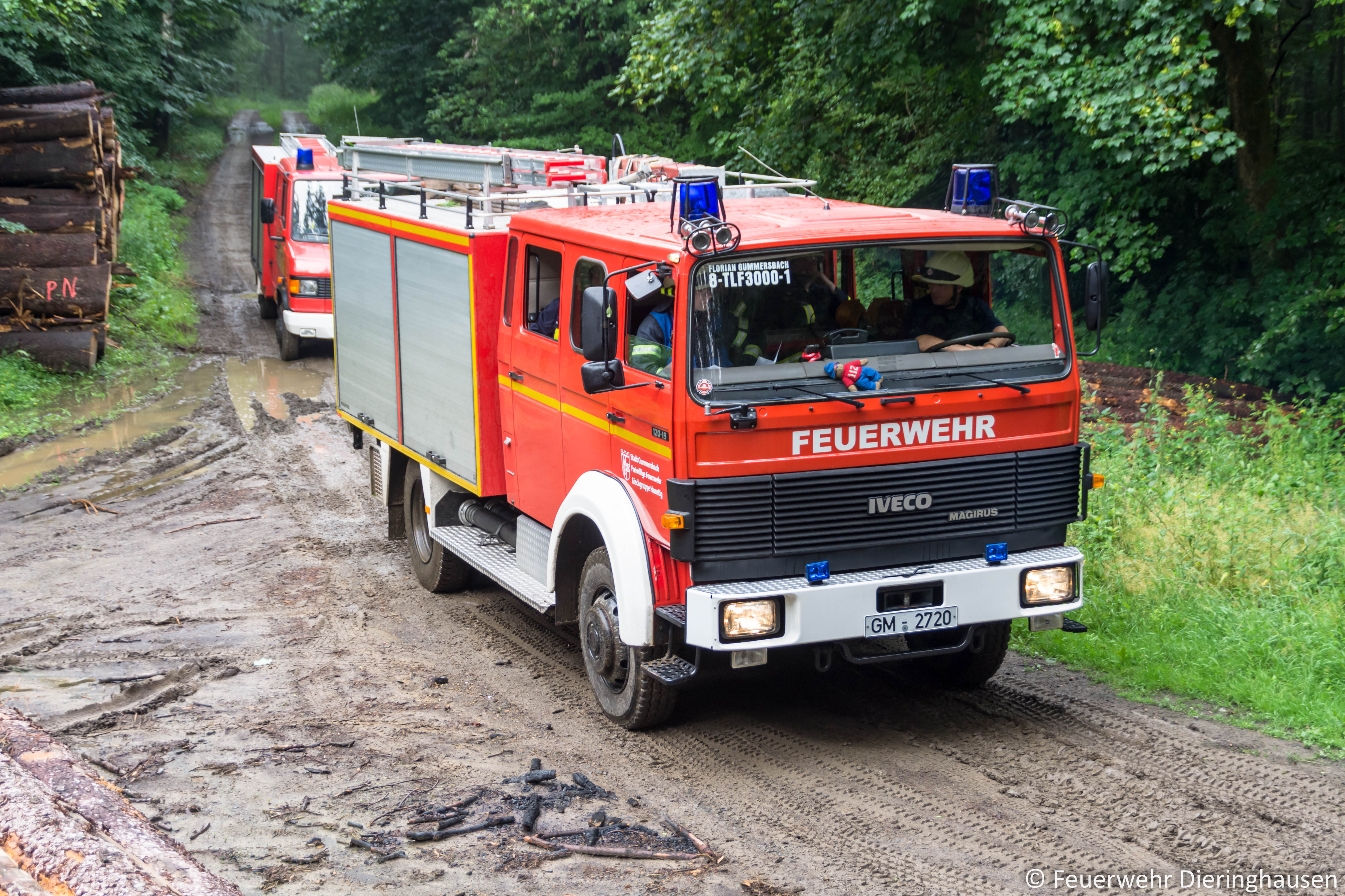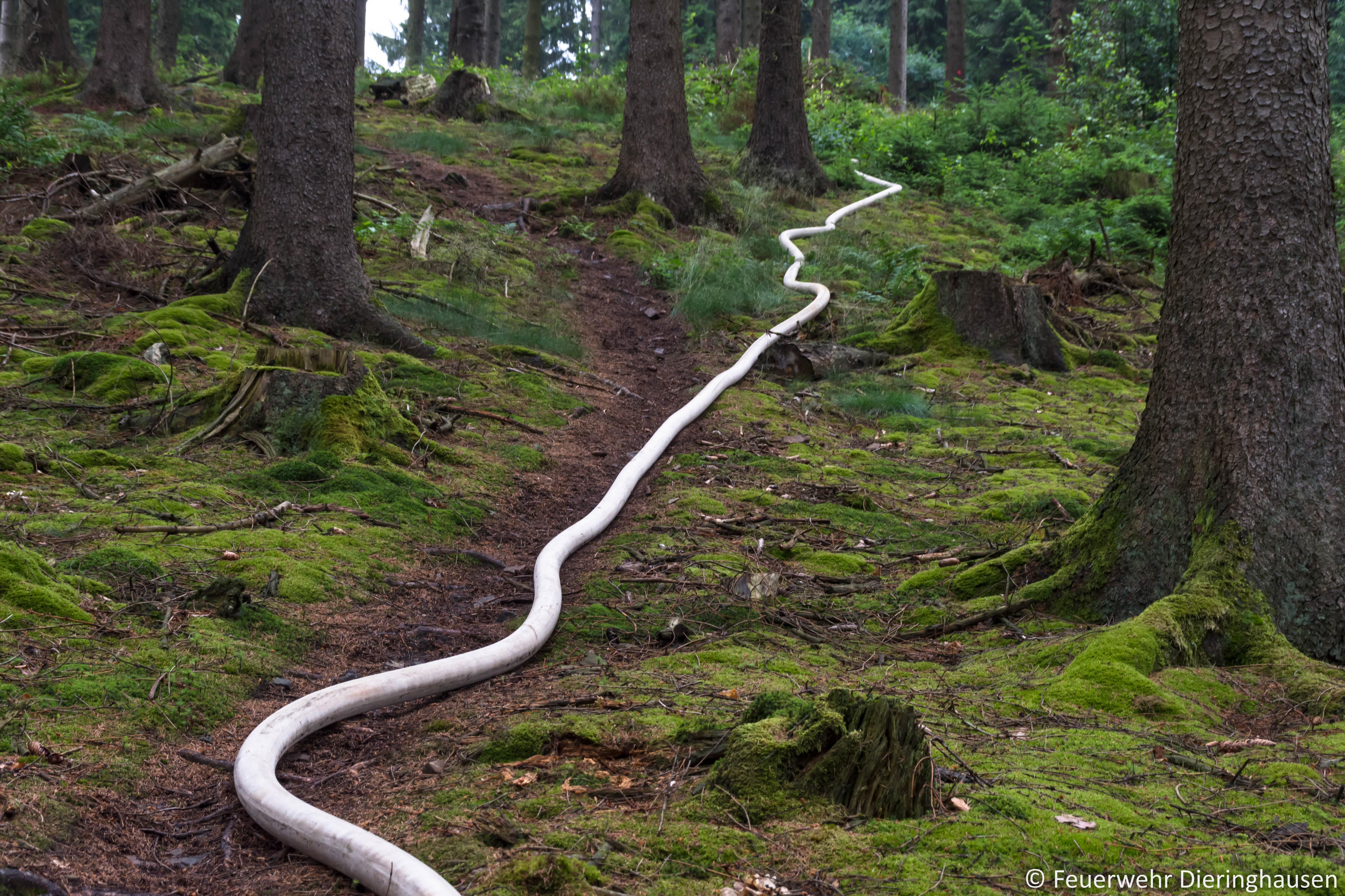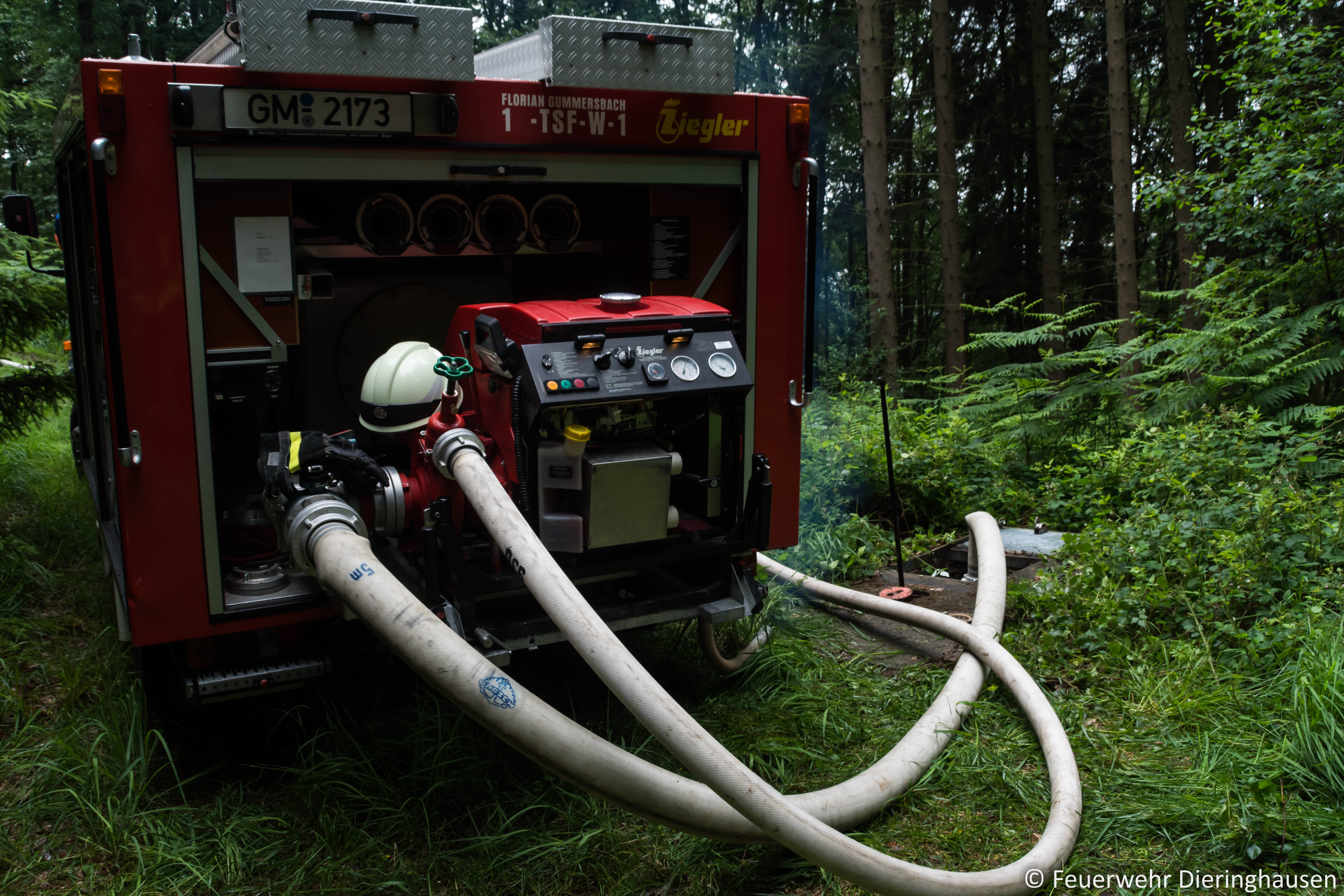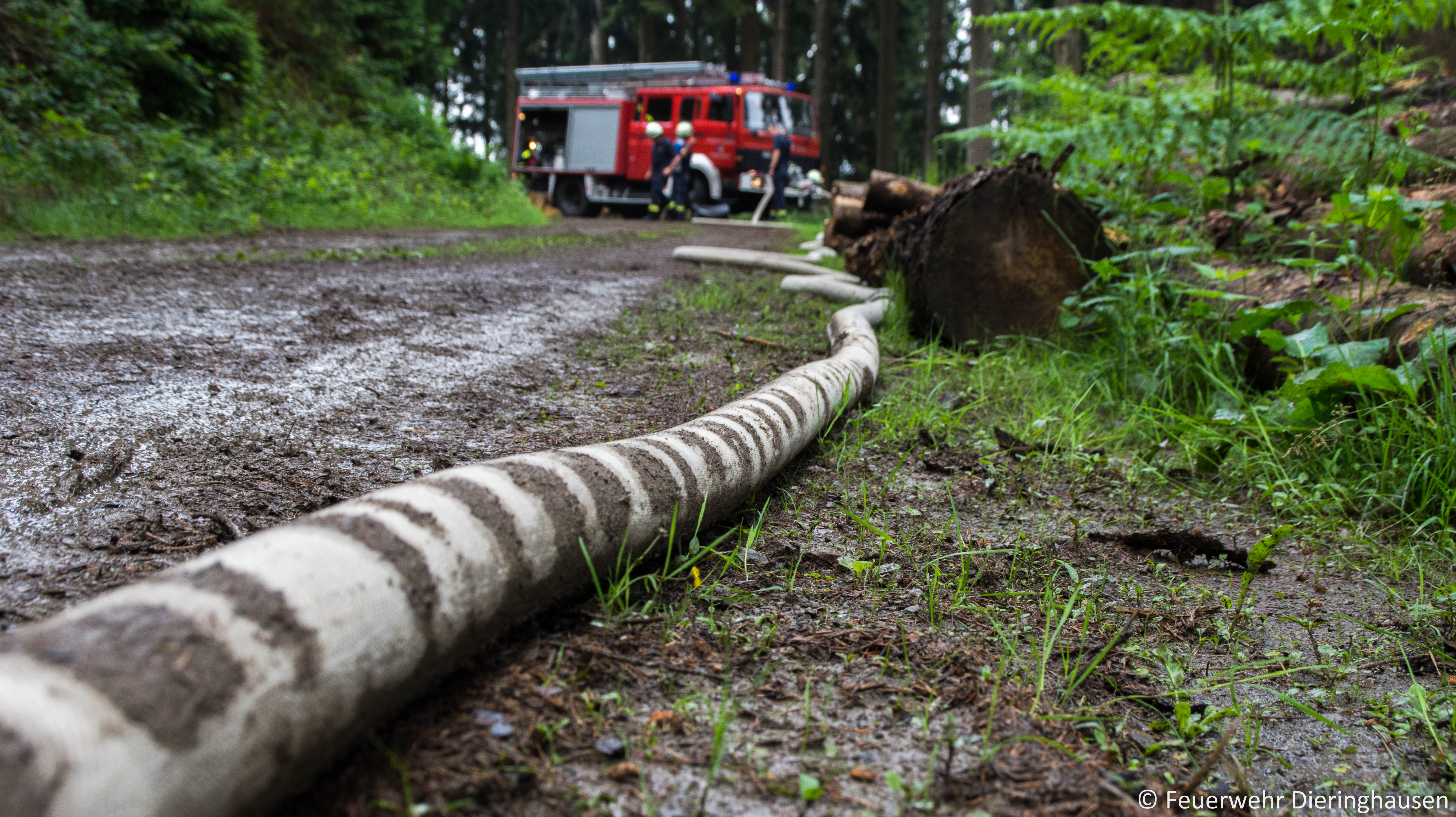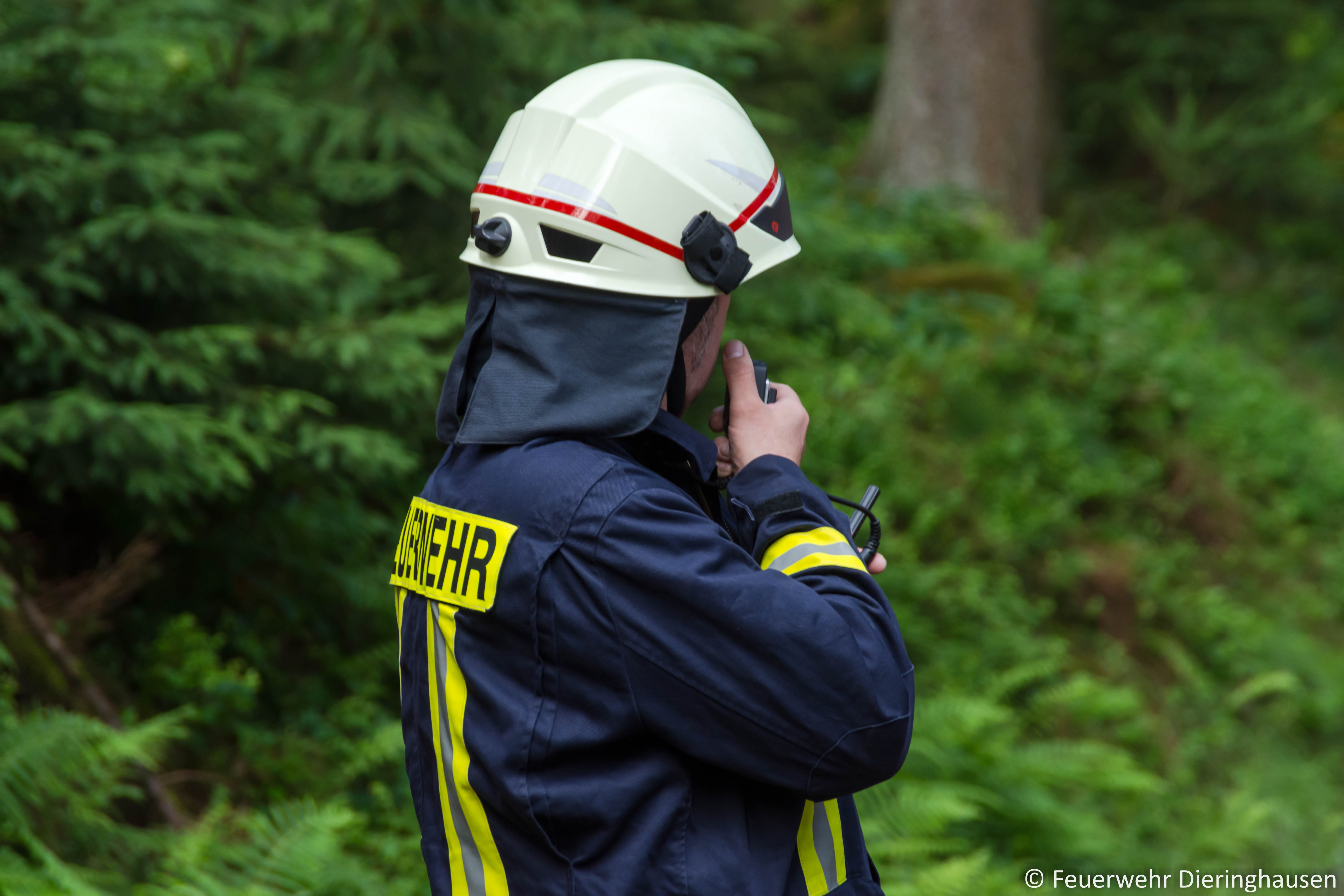 Aus dem Bereitstellungsraum an der Aggerhalle rückten die Einsatzkräfte des Löschzug 5 der Feuerwehr Gummersbach über vorgegebene Zufahrtswege ins Waldgebiet Meerhardt aus. Dort war es zu einem Waldbrand nahe Lobscheid gekommen. Die Übung wurde aus dem Gerätewagen-Messtechnik, welcher als Einsatzleitwagen eingesetzt wurde, koordiniert. Anders als bei Einsätzen im Ort stellen die topographischen Gegebenheiten in unwegsamen Gelände eine besondere Herausforderung für die Einsatzkräfte dar. Geeignete Zufahrtswege müssen rasch gefunden und eine Löschwasserversorgung sichergestellt werden. Aus zwei Waldhydranten konnte das Löschwasser entnommen und über lange Schlauchleitungen querfeldein zum Brandort transportiert werden. Zudem wurde ein Pendelverkehr mit einem Tanklöschfahrzeug eingerichtet.