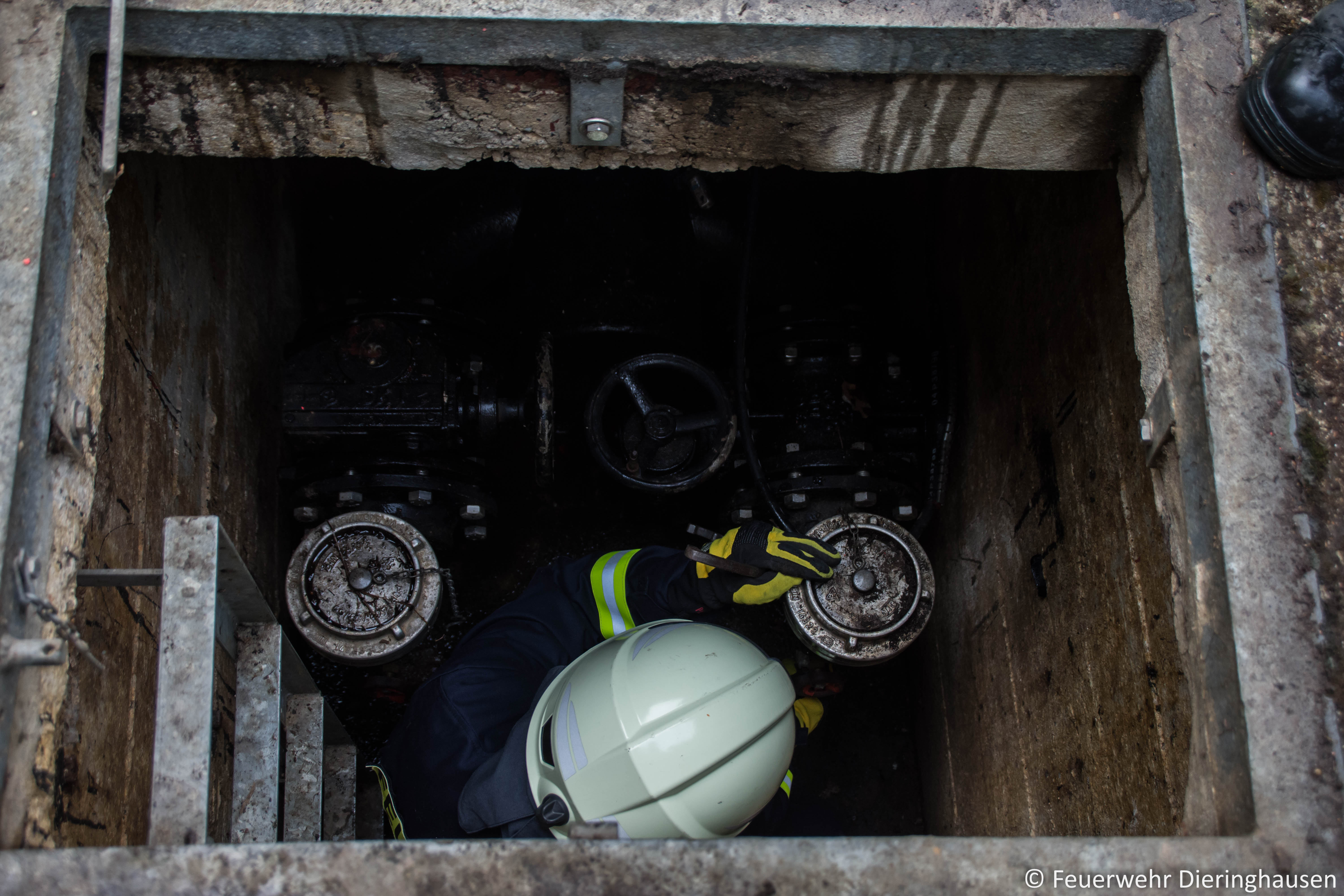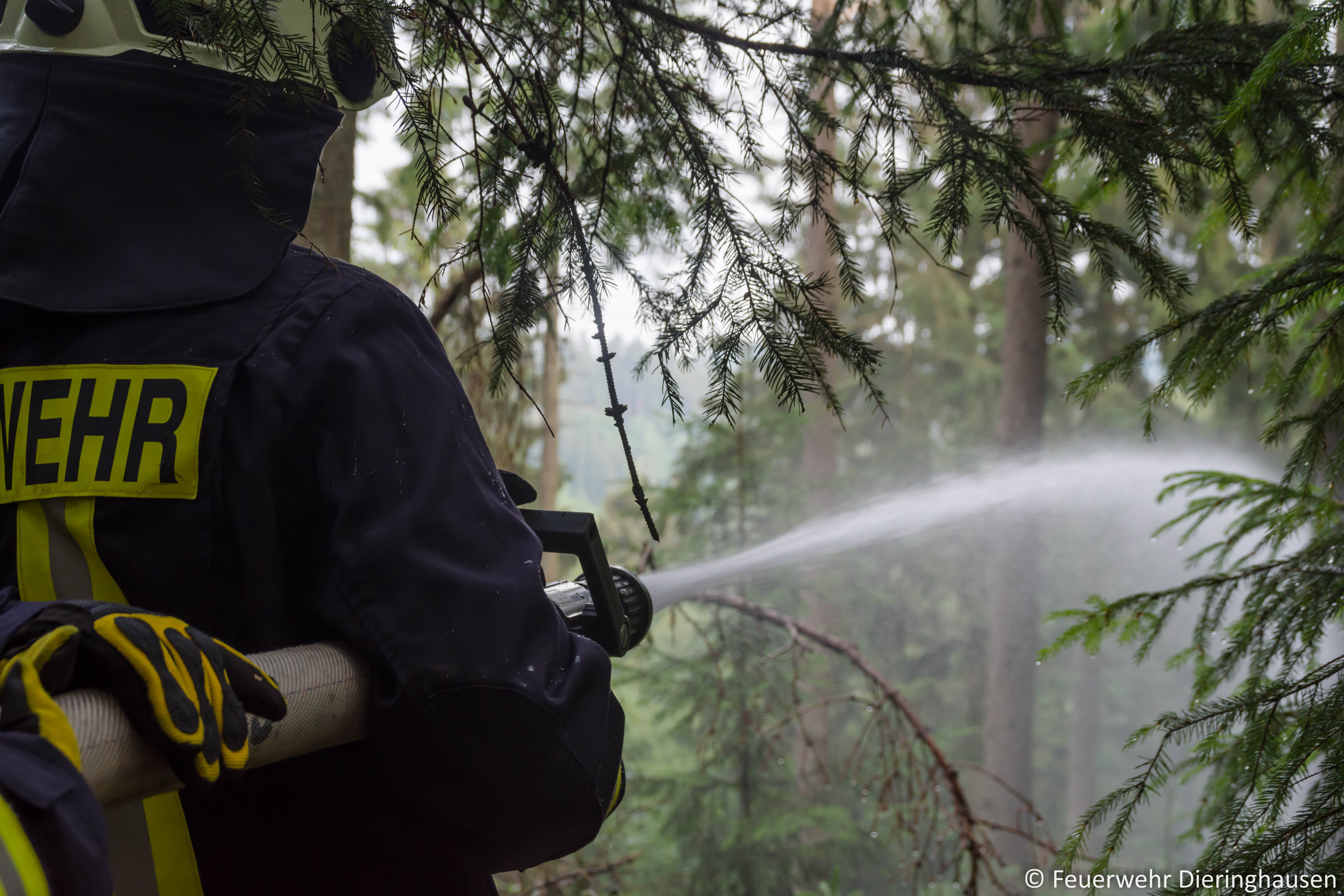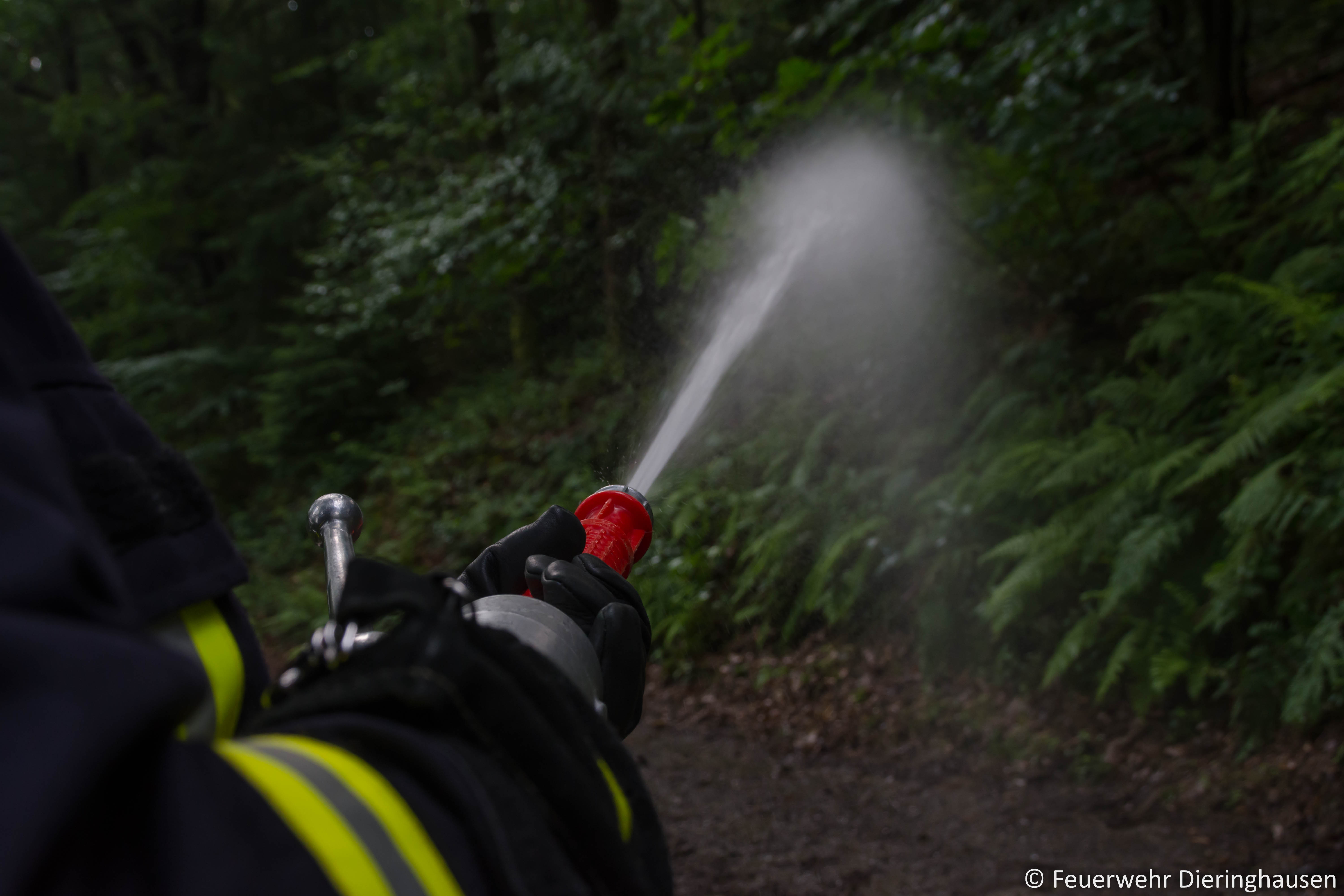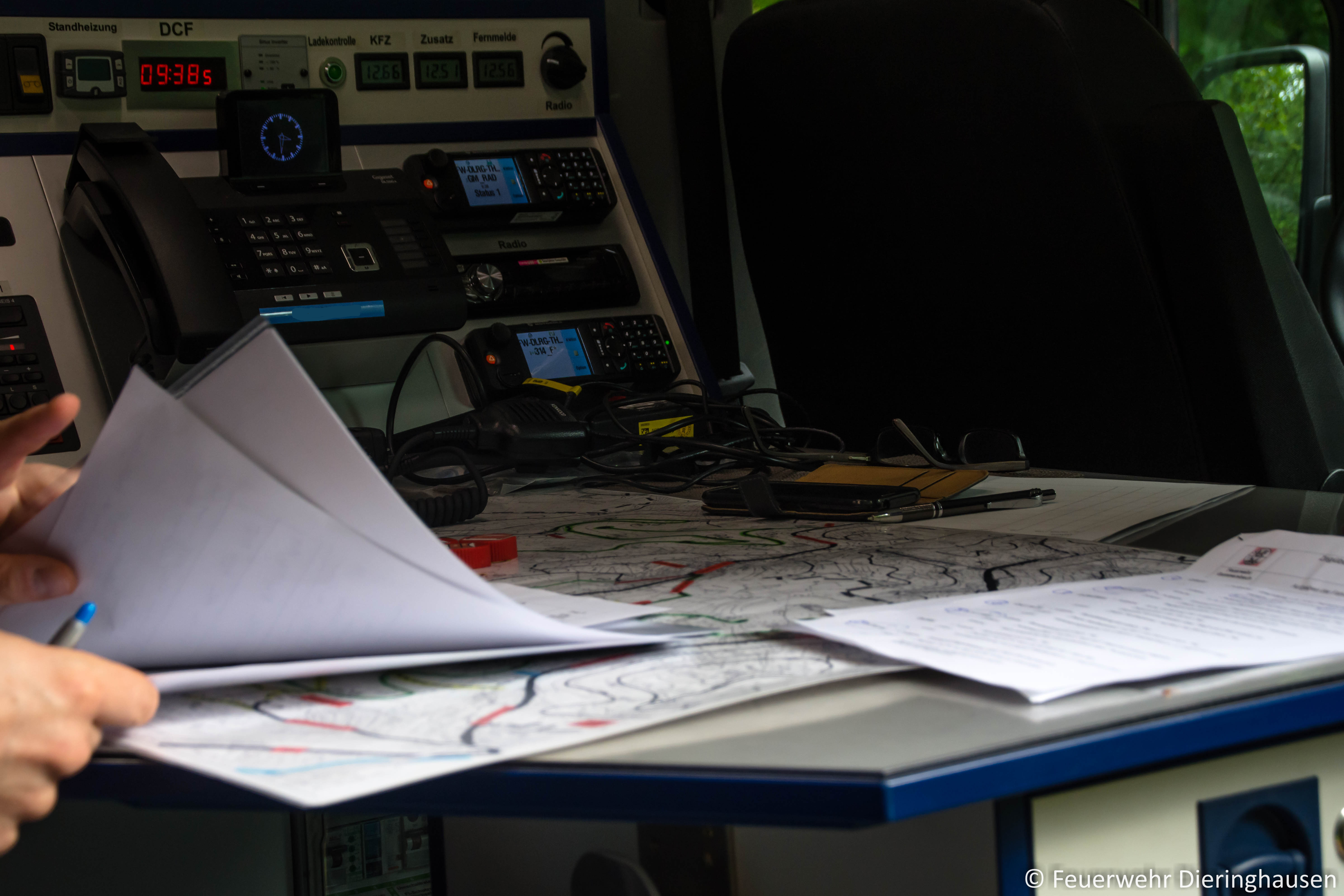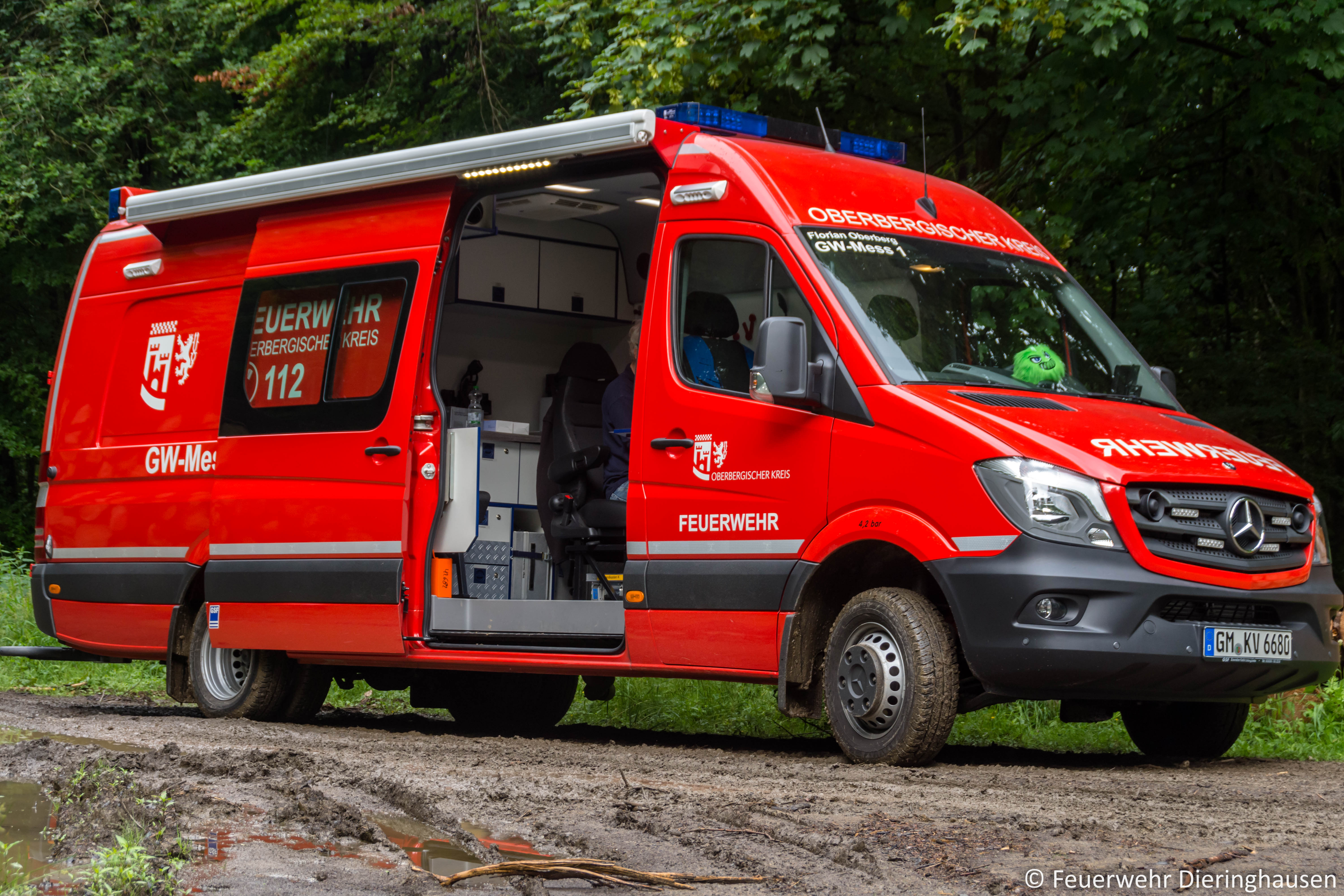 Aus dem Bereitstellungsraum an der Aggerhalle rückten die Einsatzkräfte des Löschzug 5 der Feuerwehr Gummersbach über vorgegebene Zufahrtswege ins Waldgebiet Meerhardt aus. Dort war es zu einem Waldbrand nahe Lobscheid gekommen. Die Übung wurde aus dem Gerätewagen-Messtechnik, welcher als Einsatzleitwagen eingesetzt wurde, koordiniert. Anders als bei Einsätzen im Ort stellen die topographischen Gegebenheiten in unwegsamen Gelände eine besondere Herausforderung für die Einsatzkräfte dar. Geeignete Zufahrtswege müssen rasch gefunden und eine Löschwasserversorgung sichergestellt werden. Aus zwei Waldhydranten konnte das Löschwasser entnommen und über lange Schlauchleitungen querfeldein zum Brandort transportiert werden. Zudem wurde ein Pendelverkehr mit einem Tanklöschfahrzeug eingerichtet.