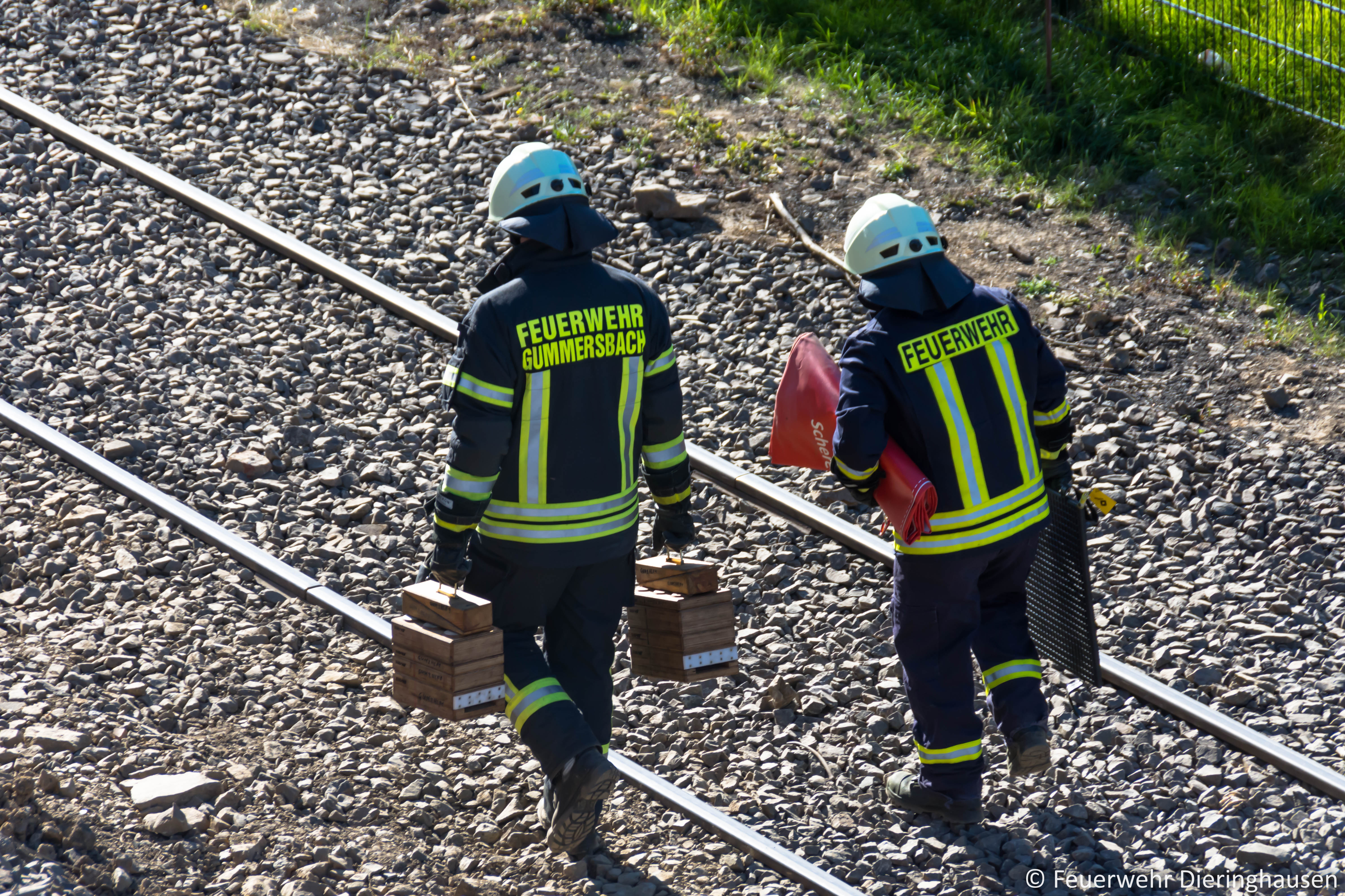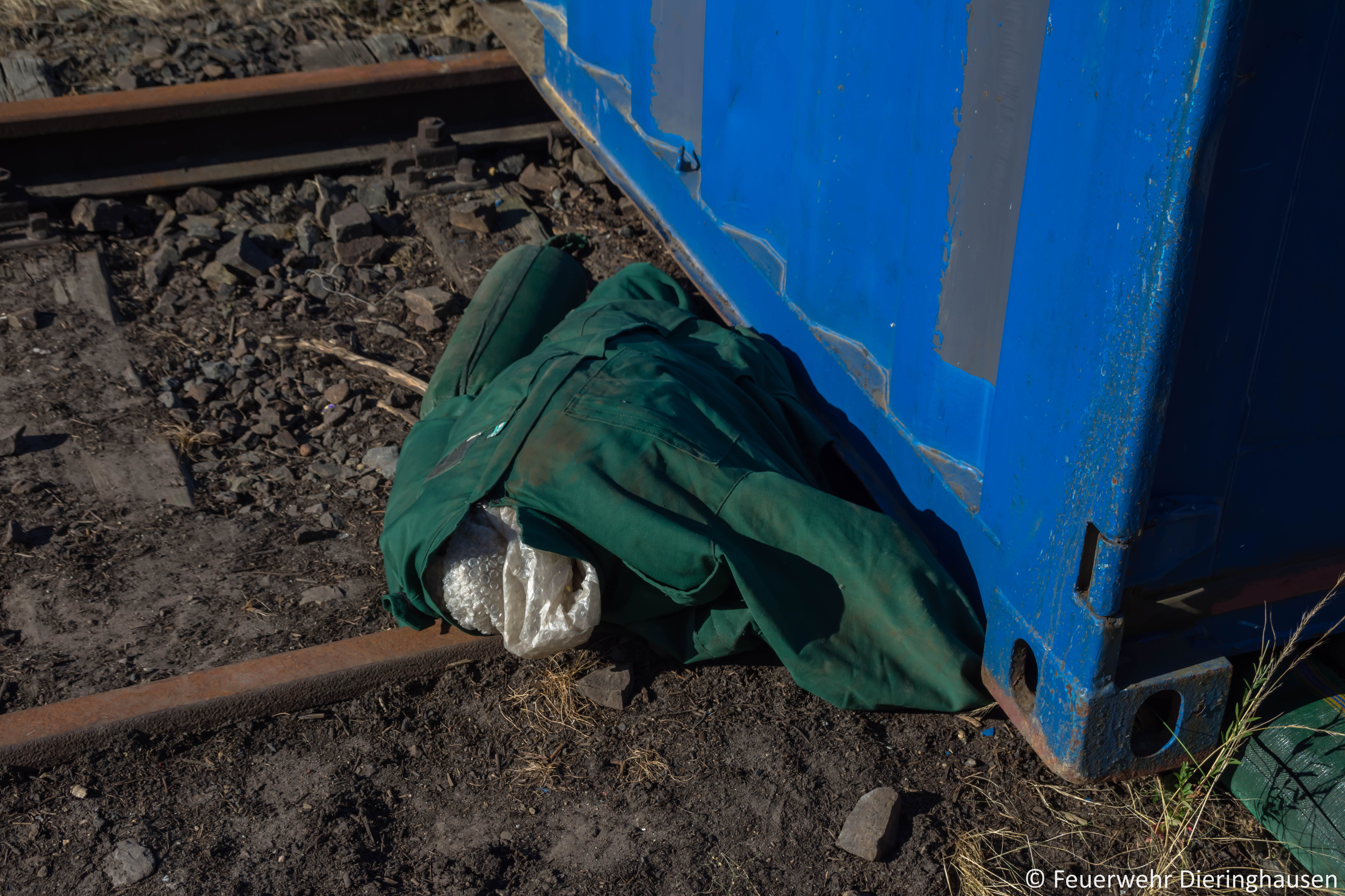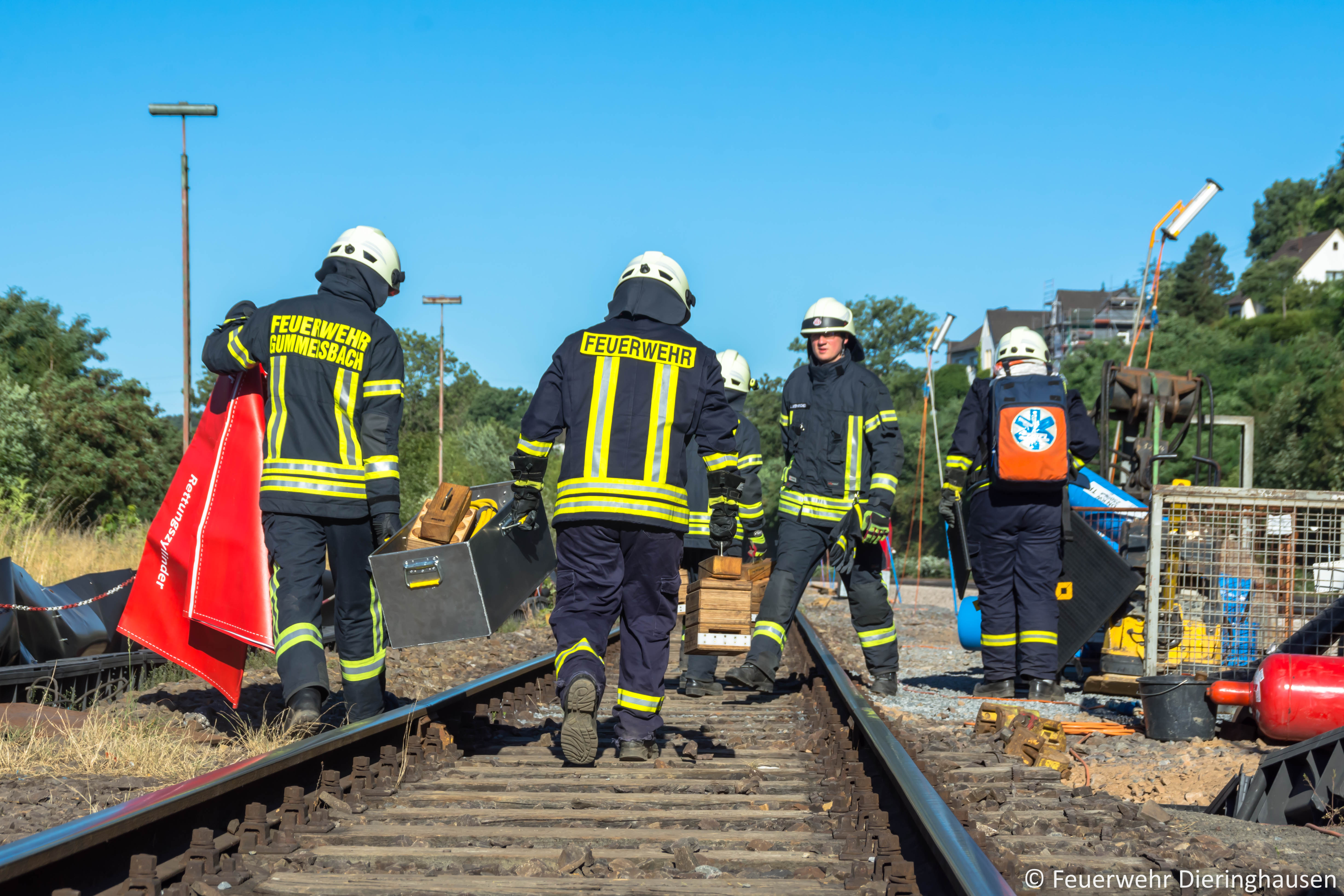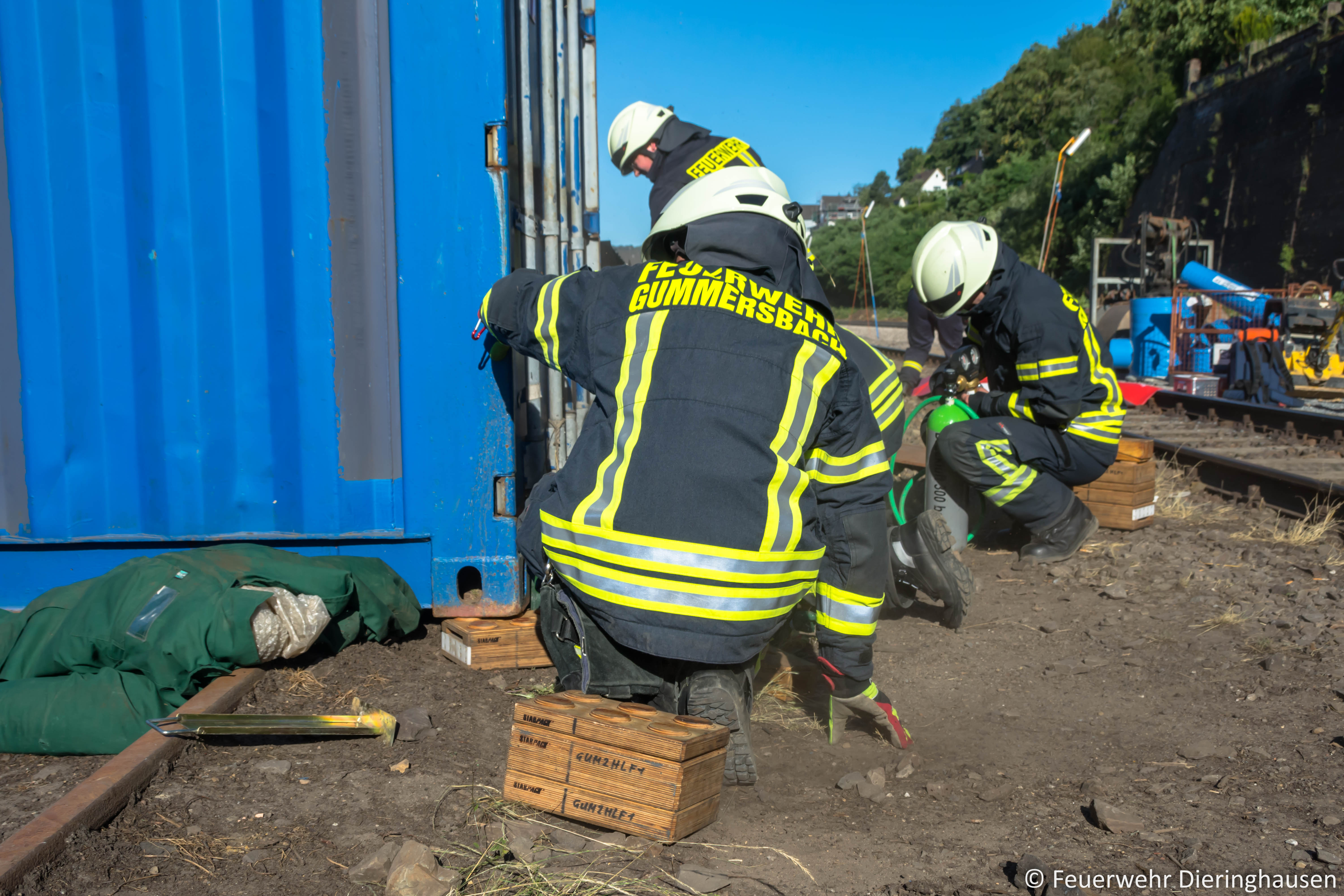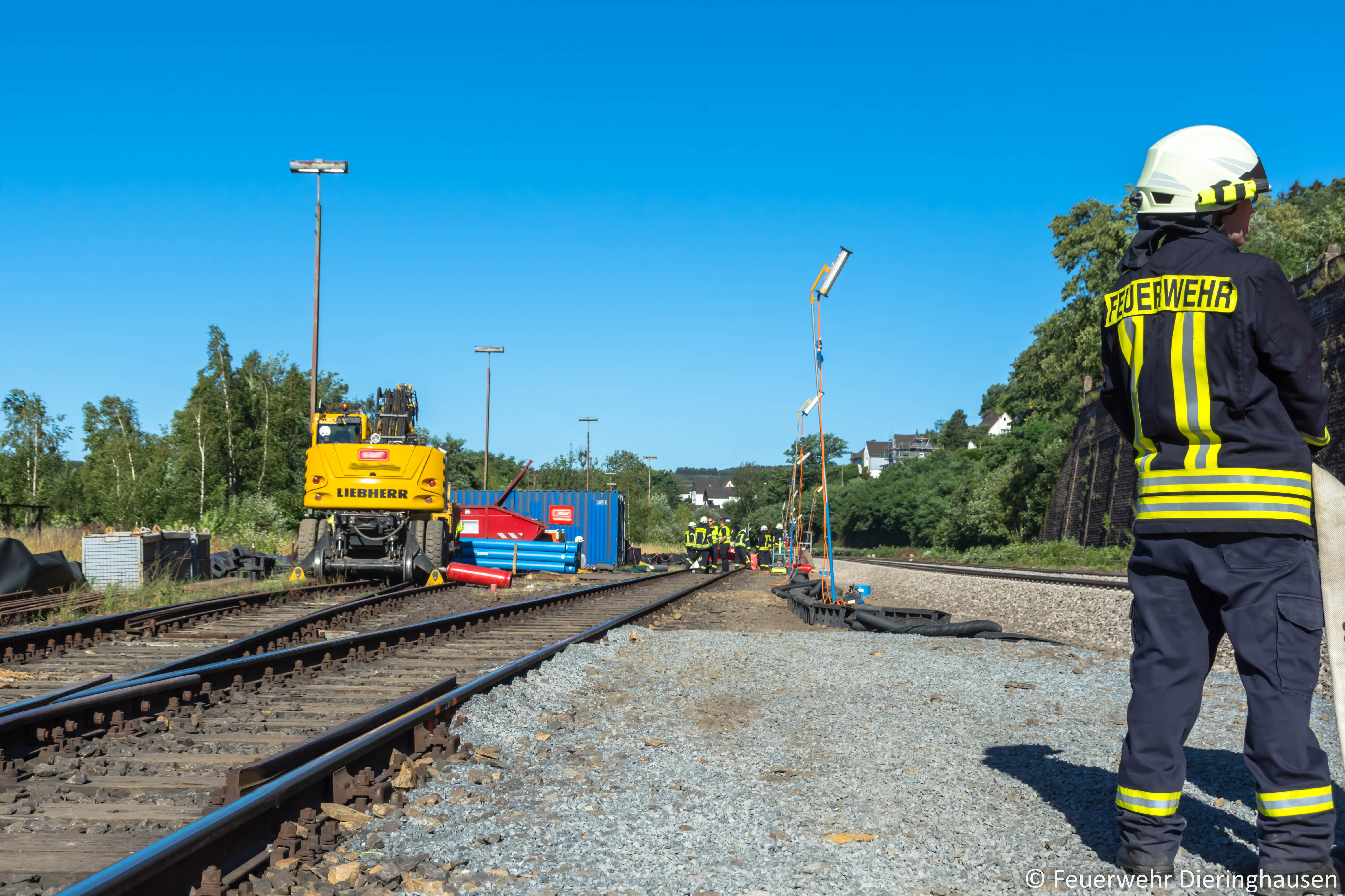 Die Einsatzkräfte mussten einen eingeklemmten Bauarbeiter unter einem Baucontainer mittels pneumatischer Hebekissen befreien. Währenddessen wurde ein brennender Bagger im Umfeld gelöscht. Problematisch stellte sich dabei der Zugangsweg von der Straße zur Gleisanlage dar. Zudem musste das Material zur technischen Rettung und Brandbekämpfung über lange Wege und unwegsames Gelände zur Einsatzstelle transportiert werden.