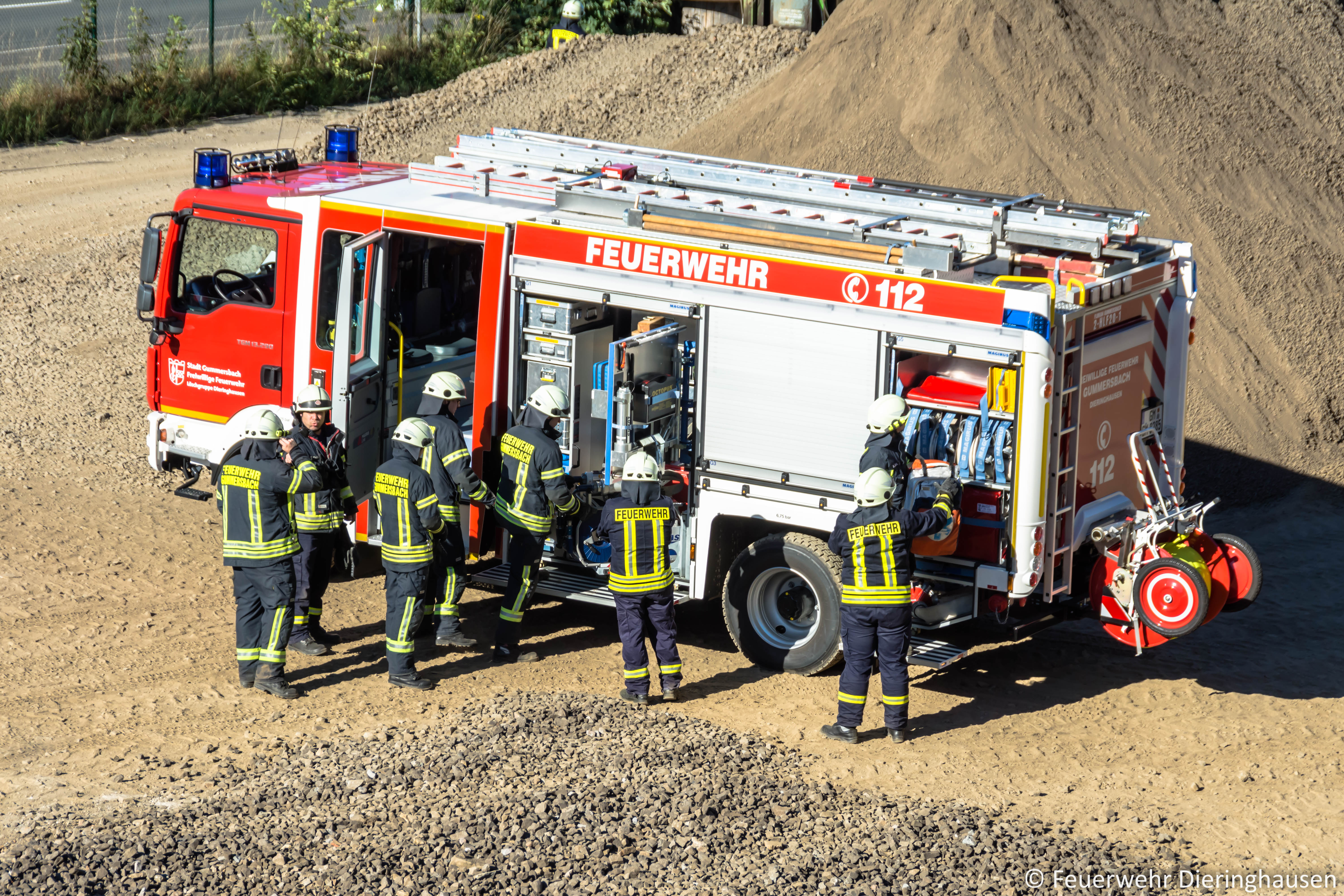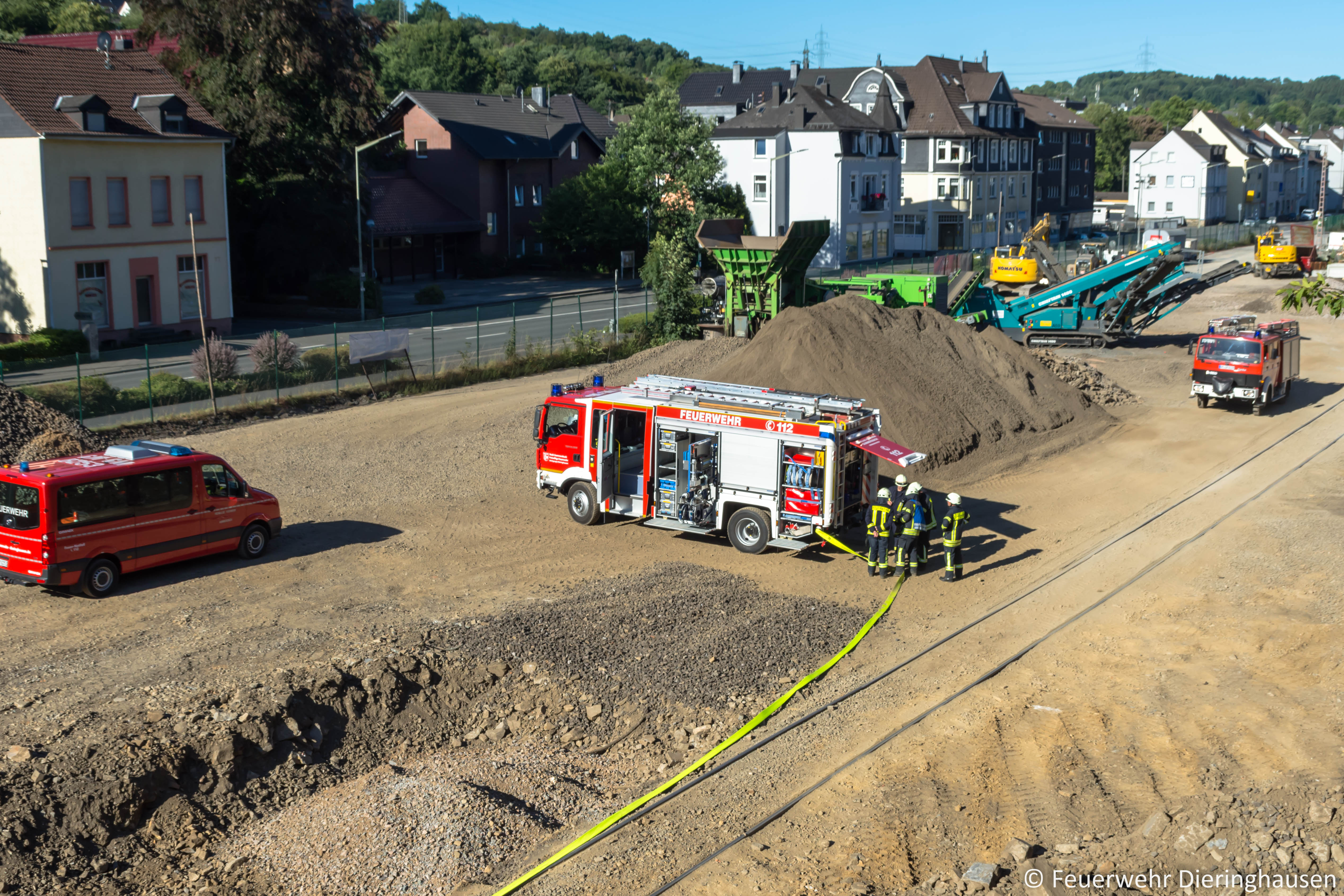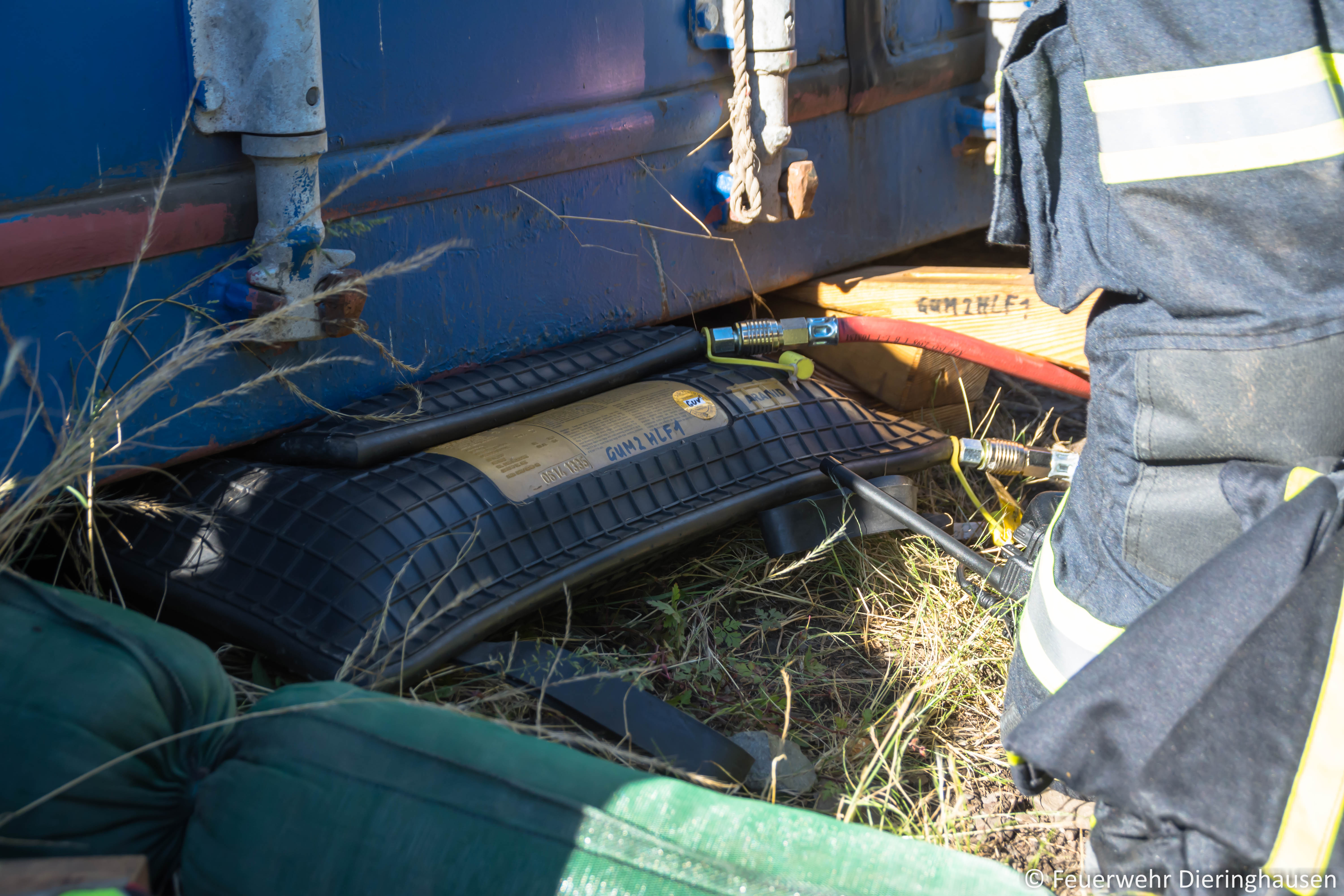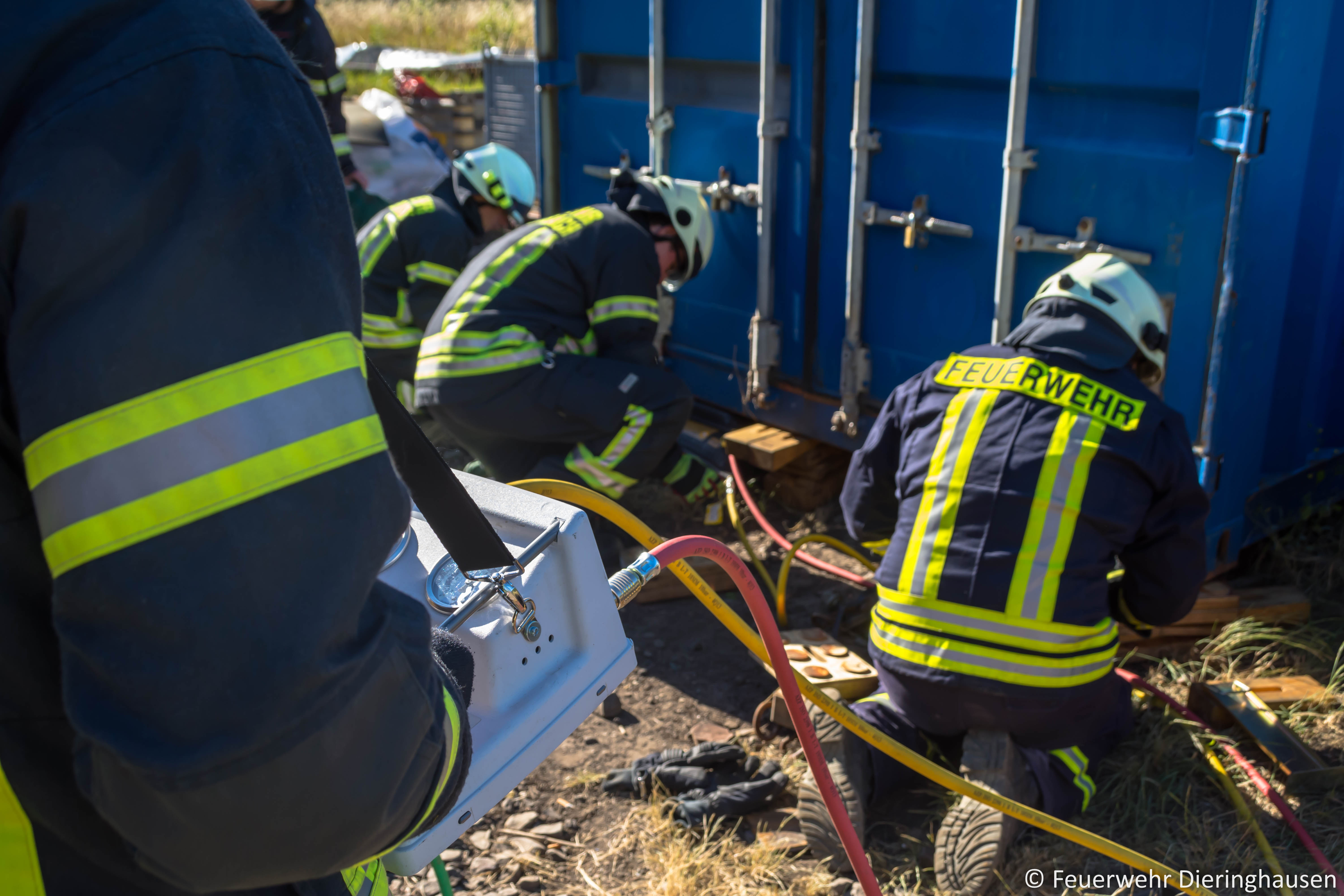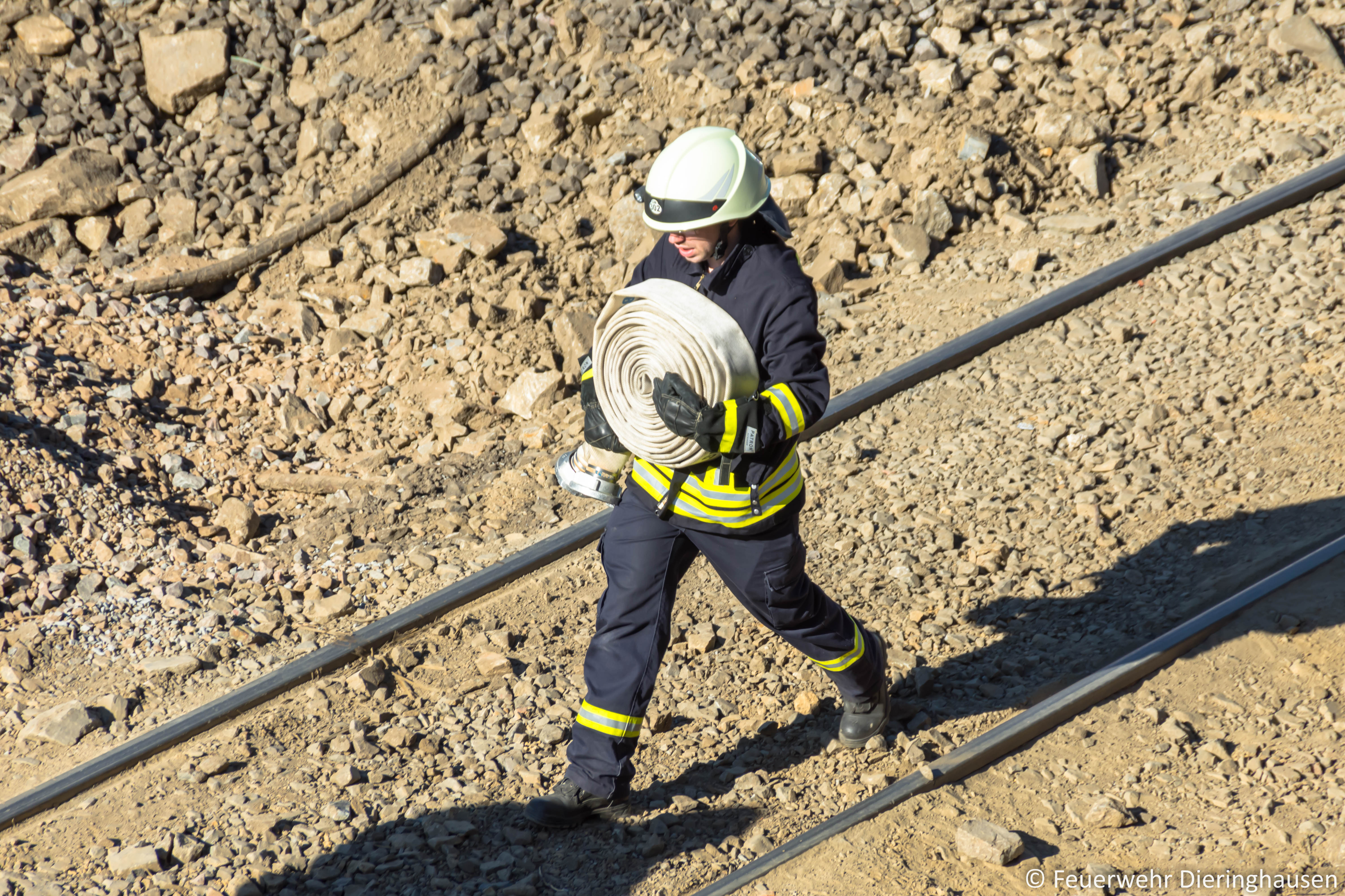 Die Einsatzkräfte mussten einen eingeklemmten Bauarbeiter unter einem Baucontainer mittels pneumatischer Hebekissen befreien. Währenddessen wurde ein brennender Bagger im Umfeld gelöscht. Problematisch stellte sich dabei der Zugangsweg von der Straße zur Gleisanlage dar. Zudem musste das Material zur technischen Rettung und Brandbekämpfung über lange Wege und unwegsames Gelände zur Einsatzstelle transportiert werden.