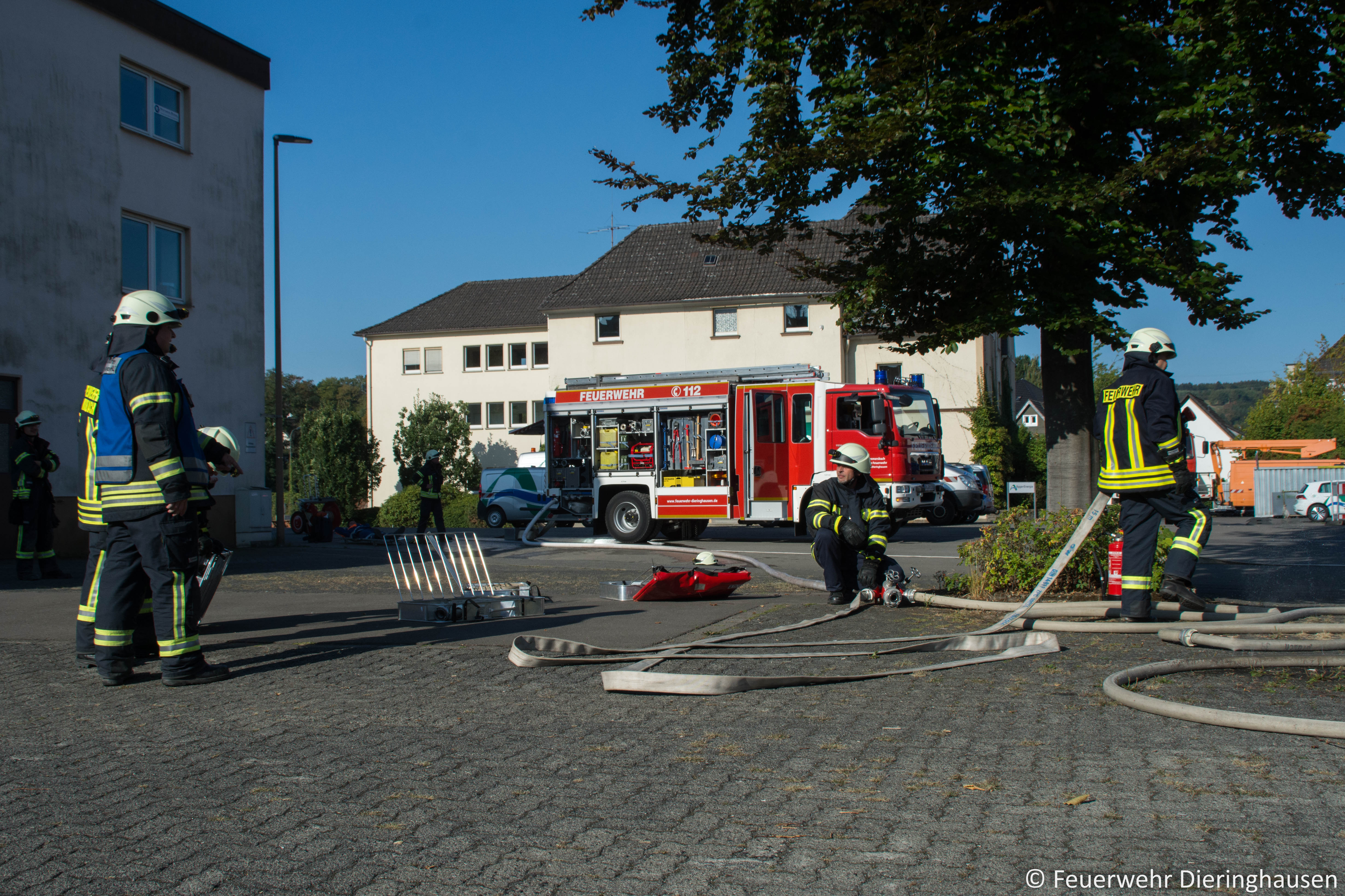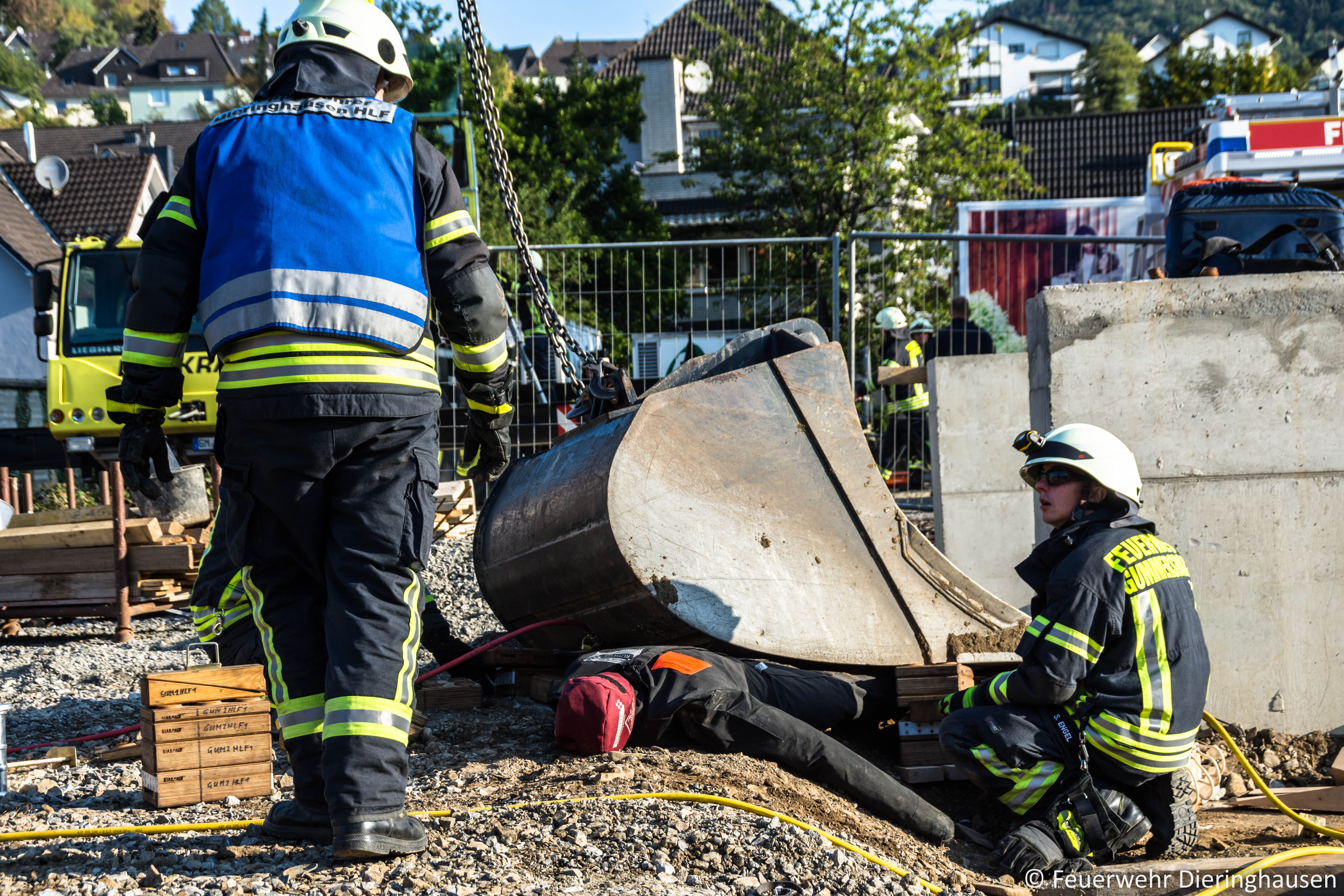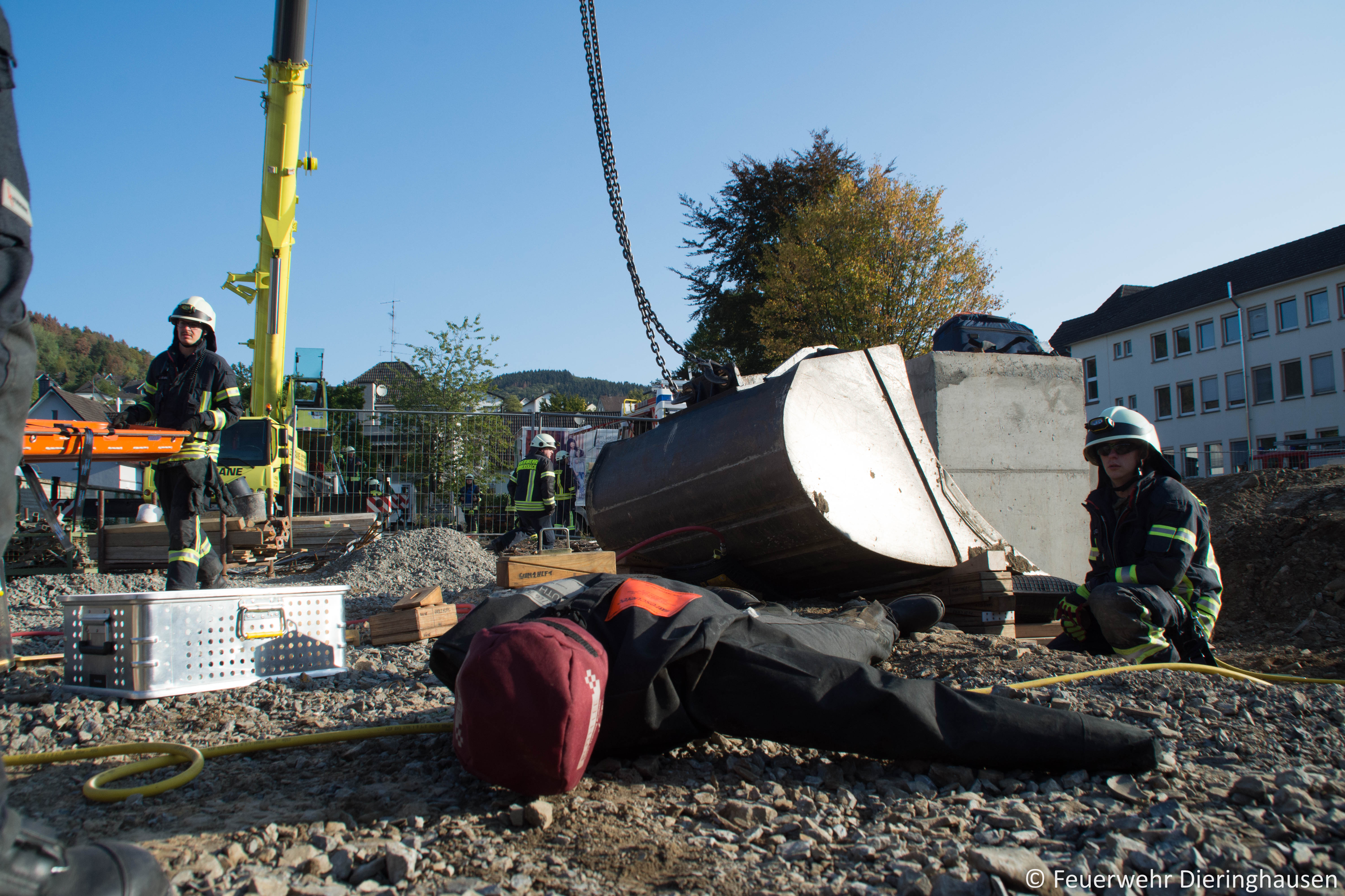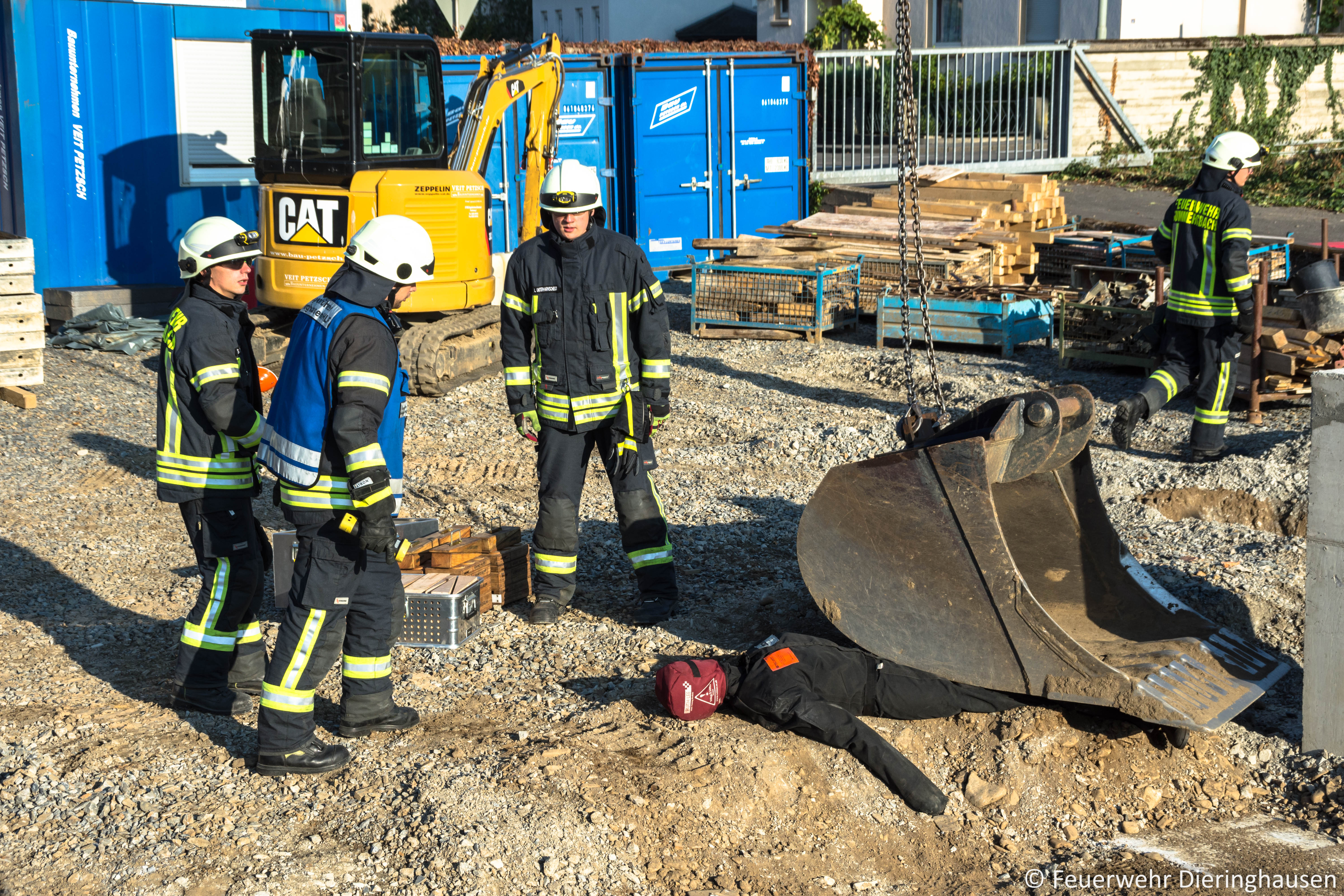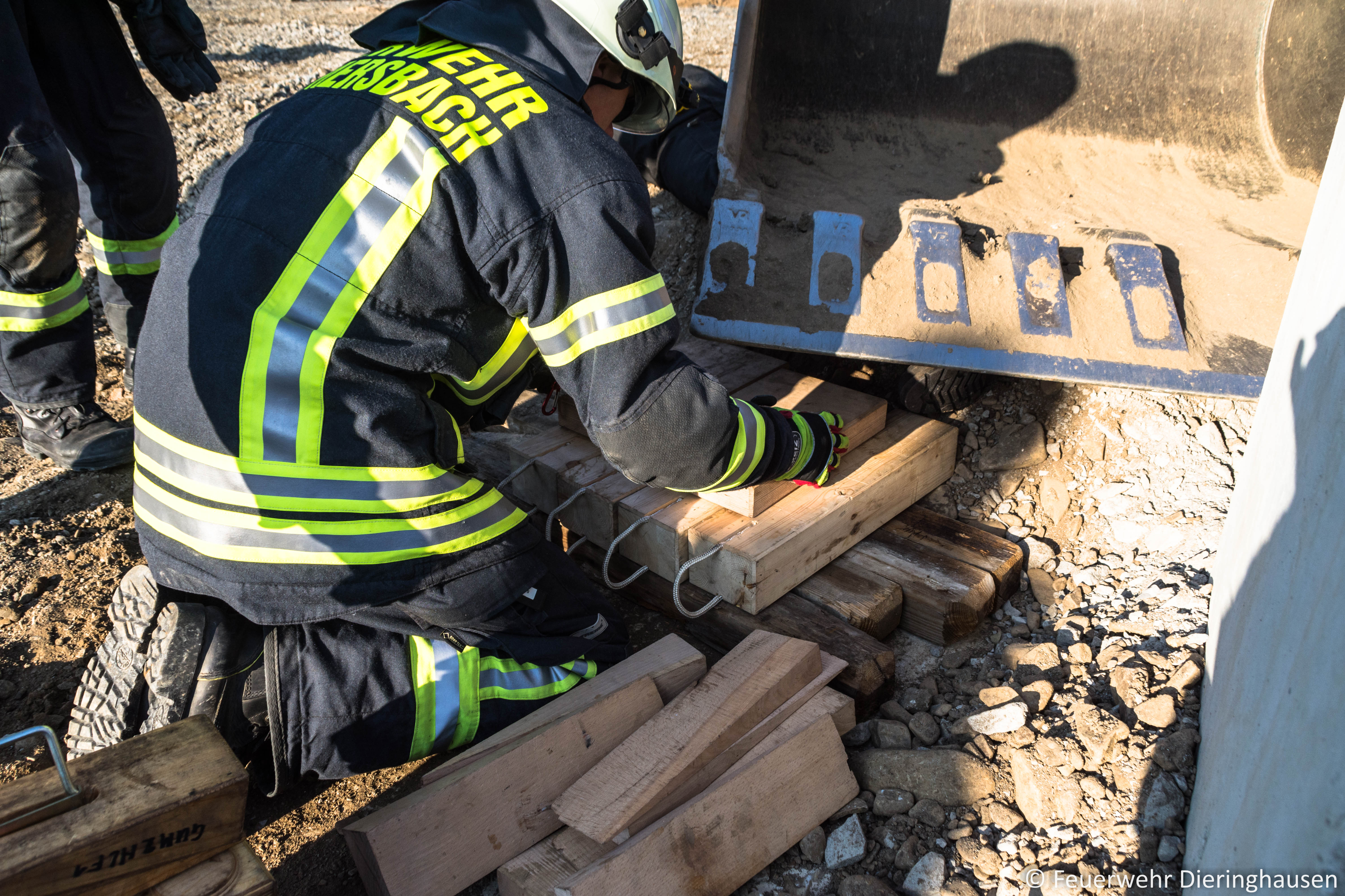 Auf einer Baustelle war es zunächst zu einem Arbeitsunfall mit einem Mobilkran gekommen. Der Maschinenführer des Krans erlitt einen internistischen Notfall. In Folge dessen wurde eine Person unter einer Baggerschaufel, welche am Kran hing, eingeklemmt. Zudem musste ein Kind in unmittelbarer Nähe des Unglücksortes von den Einsatzkräften betreut werden. Mit den pneumatischen Hebekissen gelang es den Kameraden schnell die eingeklemmte Person unter der Baggerschaufel zu befreien und dem Rettungsdienst zuzuführen. Der Maschinenführer konnte aufgrund seiner Erkrankung nicht mehr selbstständig den Führerstand seines Krans verlassen und musste parallel aus seiner Notlage gerettet werden. Da sich der Führerstand bei einem Mobilkran auf dem Unterwagen befindet, gelang die Rettung nur mit Hilfe von Leitern und Feuerwehrleinen.