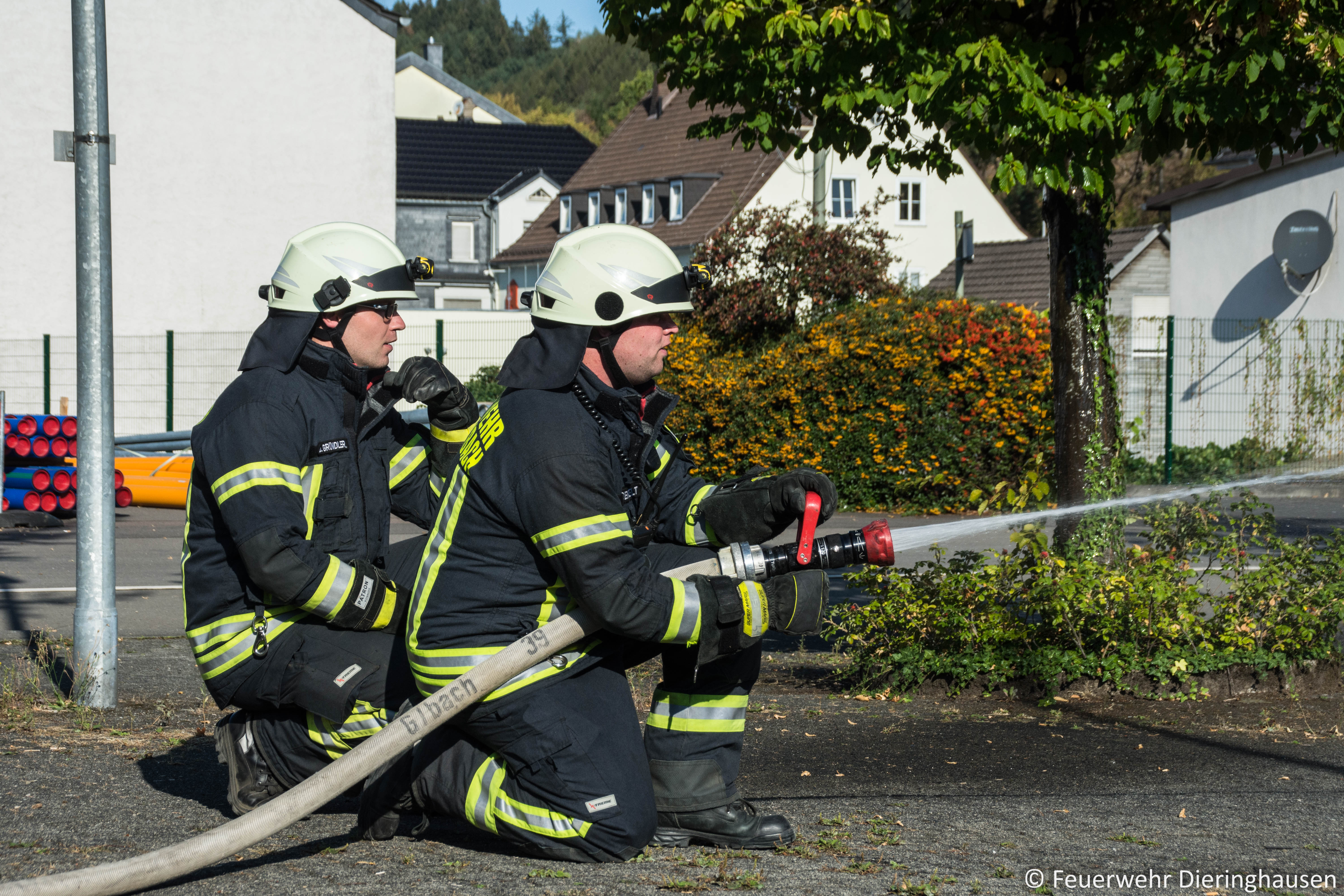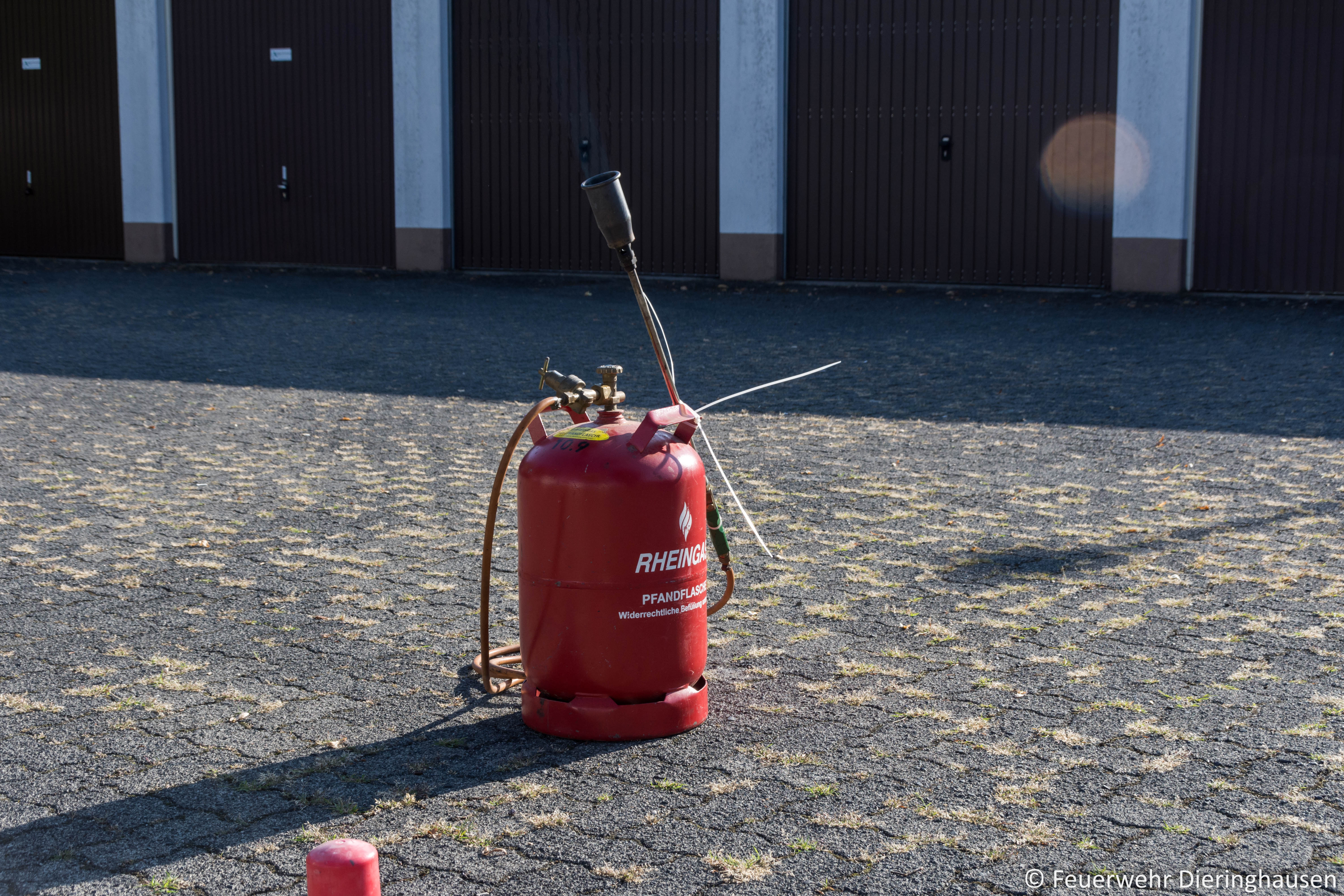 Beim nachfolgenden Übungszenario musste der Brand einer Propangasflasche gelöscht und eine verletzte Person aus dem unmittelbaren Gefahrenbereich gerettet werden.