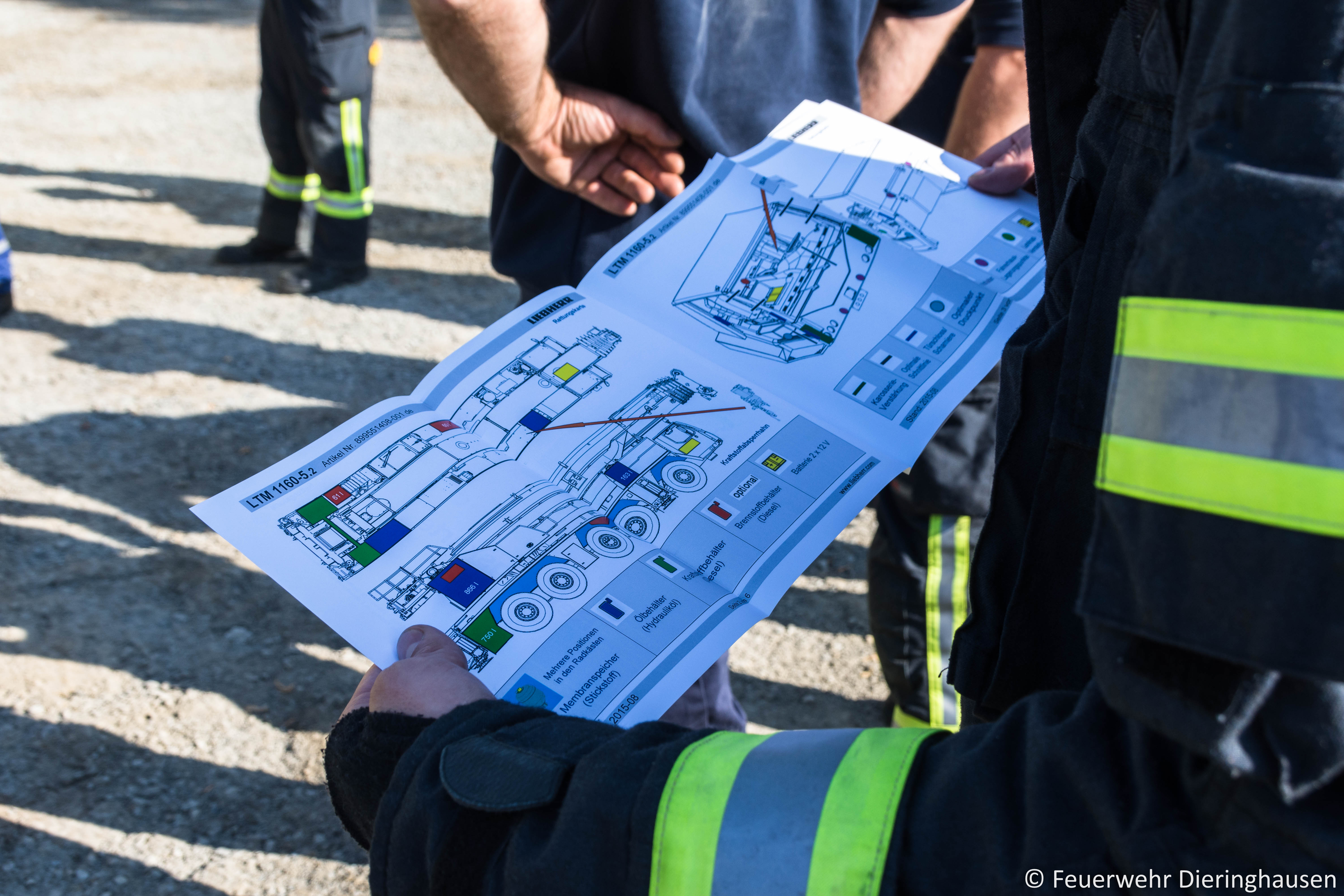 Abschließend besichtigten wir den Mobilkran. Ein fachkundiges Mitglied der Löschgruppe brachte uns die technischen Besonderheiten der Maschine näher. Außerdem stehen den Einsatzkräften im Falle eines Unfalls spezielle Rettungskarten vom Fahrzeughersteller zur Verfügung.