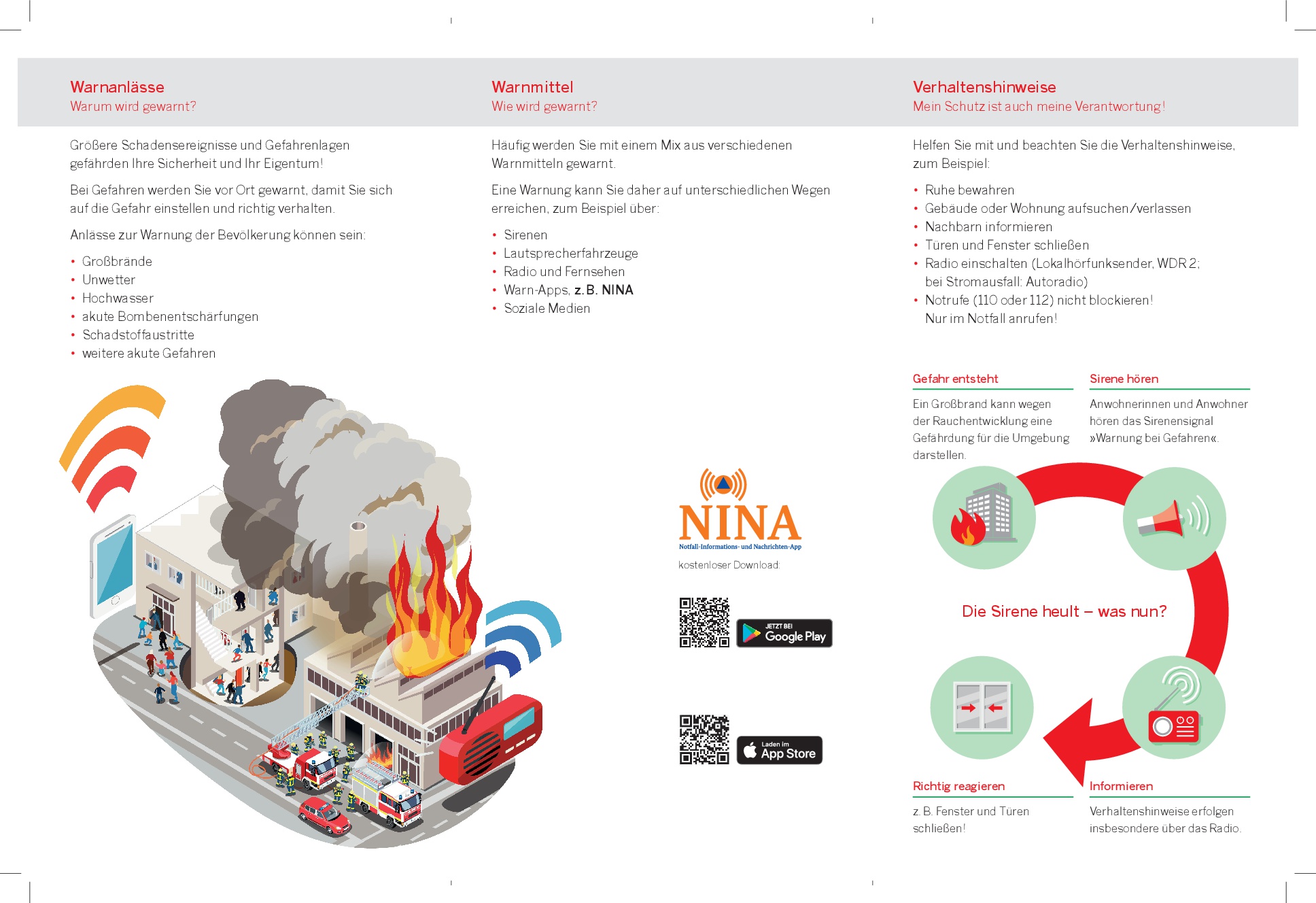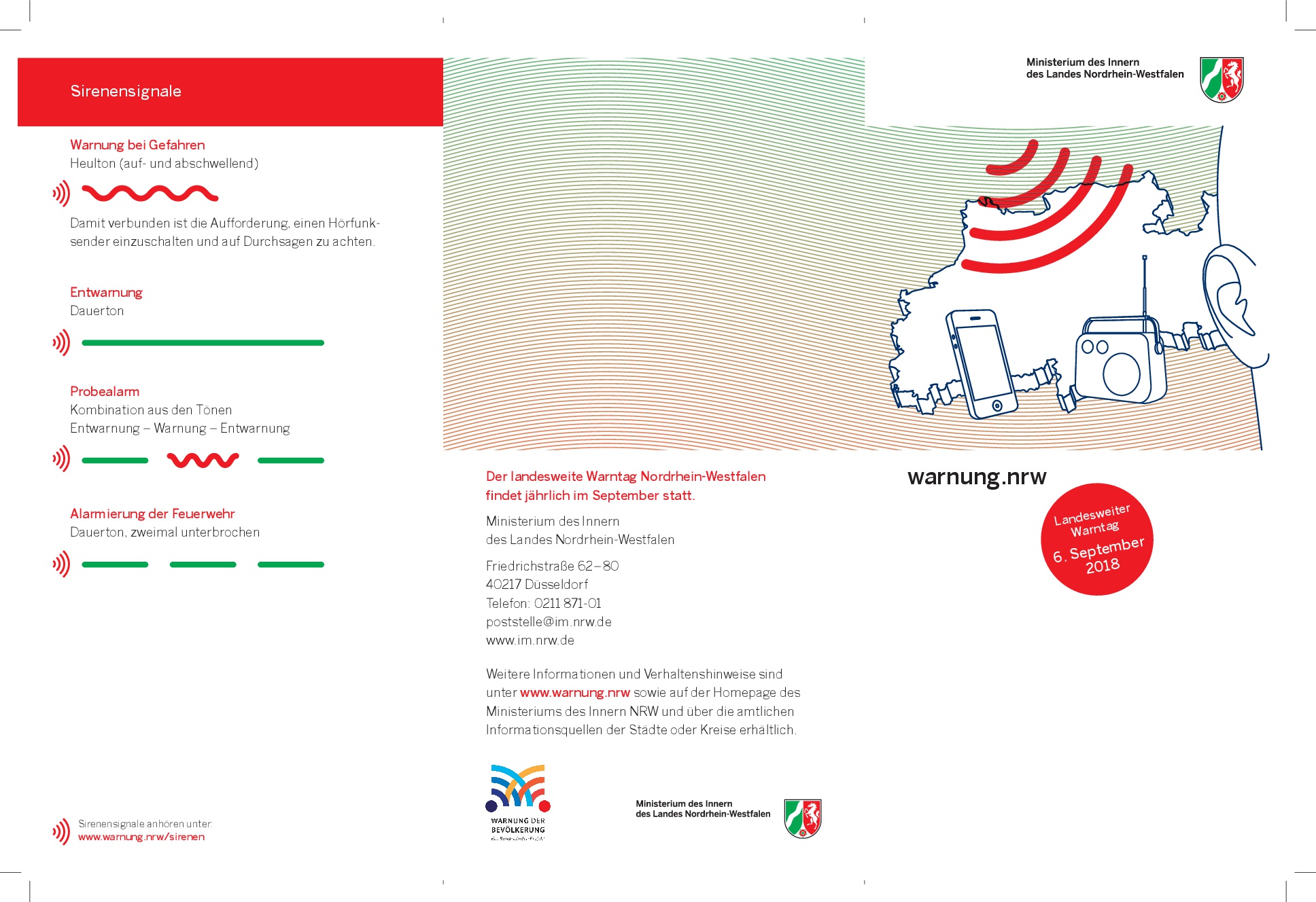 Am 6. September 2018 findet zum ersten Mal der landesweite Warntag statt. Dabei werden in ganz Nordrhein-Westfalen sämtliche Warnmittel erprobt. Um 10 Uhr werden zeitgleich in allen Kommunen die örtlichen Warnkonzepte getestet. Dazu zählen beispielsweise Sirenen. Mit der Warn-App „NINA“ (Notfall-Informations- und Nachrichten-App des Bundes) wird landesweit eine Probewarnmeldung versendet. Außerdem wird es Lautsprecherdurchsagen aus Warnfahrzeugen geben.