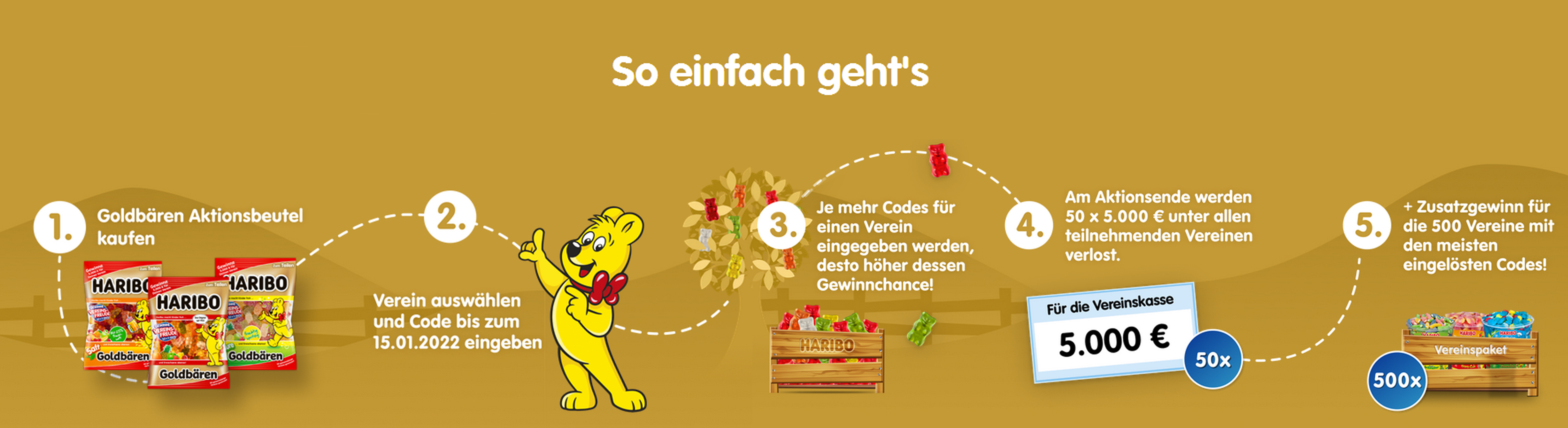 Fleißig die Aktionscodes aus den Haribo Goldbären Aktionsbeuteln sammeln und im Internet unter www.haribo.com/vereinsfreude für den Förderverein Freiwillige Fw. LG Dieringhausen eV einlösen. Jeder eingelöste Code zählt für unseren Förderverein und erhöht am Ende die Chance auf eine Gewinnausschüttung. Dieser kommt natürlich dem Löschzug Dieringhausen zu Gute.