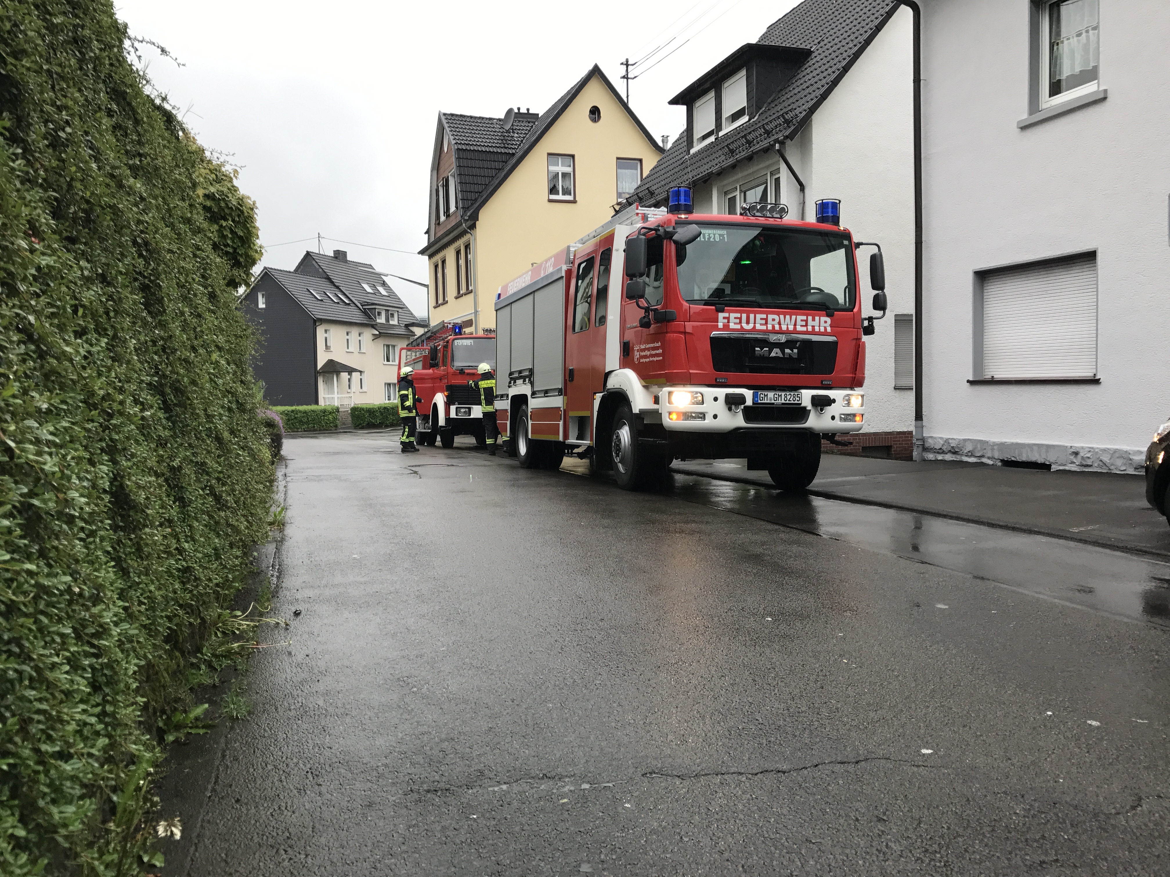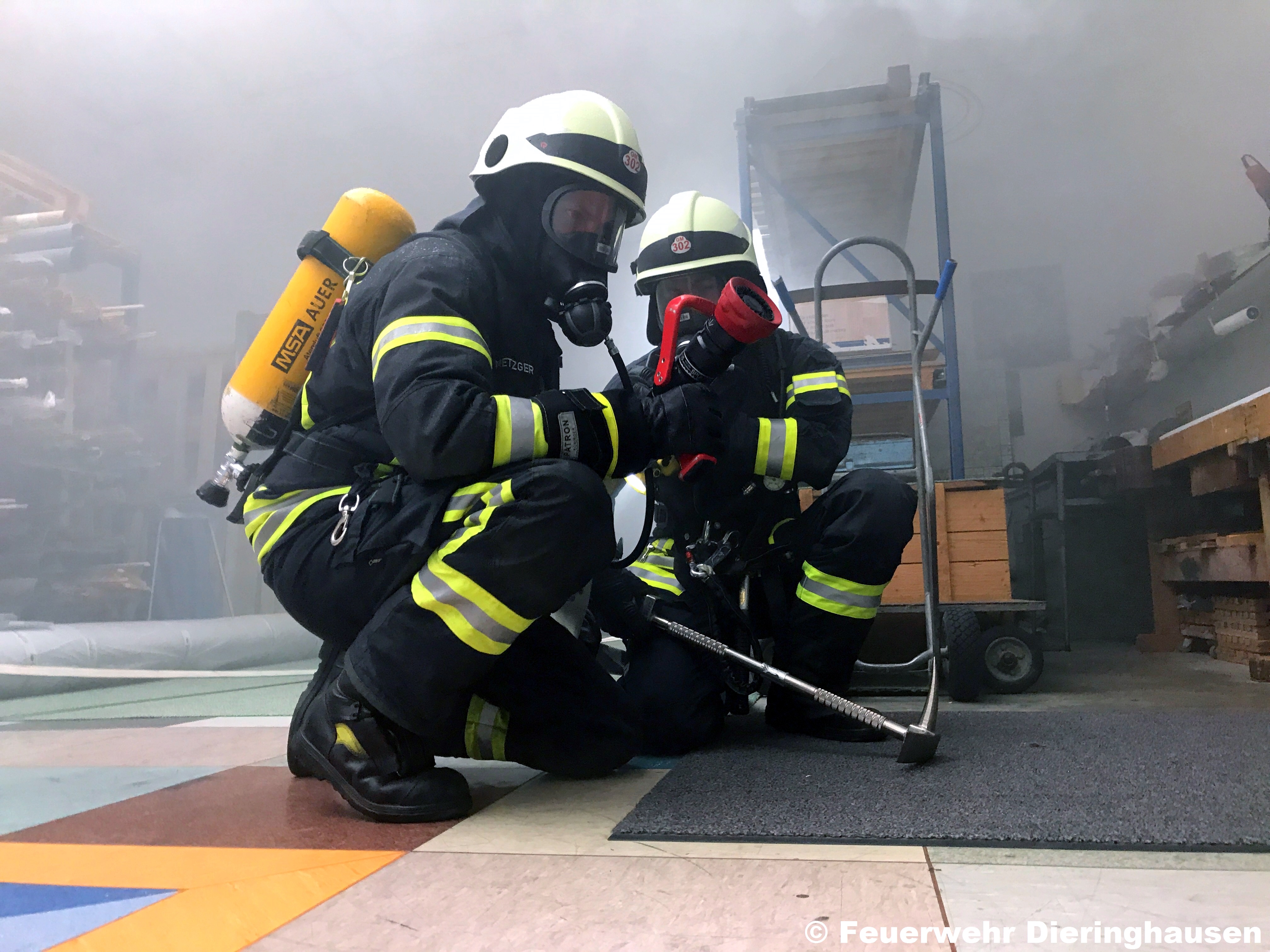 Firmeninhabers befanden sich noch zwei Personen im Gebäude, welche vom Feuer eingeschlossen waren. Umgehend durchsuchten zwei Trupps unter Atemschutz mit