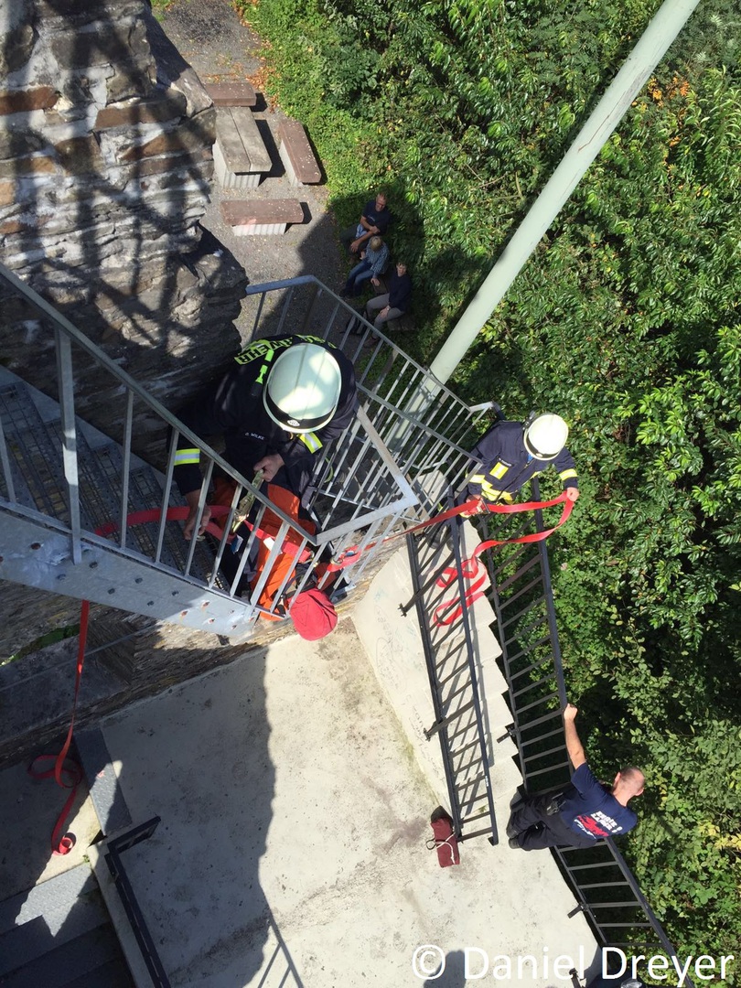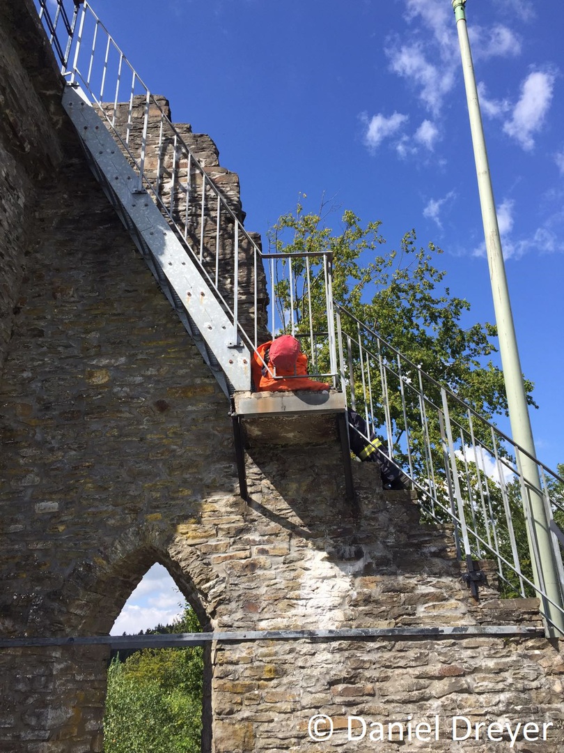 Nach der Erkundung durch den Einsatzleiter schaffte ein Trupp mit Hilfe von Spanngurten eine größere Öffnung zwischen den Streben im Treppengeländer. Die Person konnte schnell und mit einfachen Hilfsmitteln aus der Notlage befreit werden. Eine besondere Herausforderung waren die geringen Platzverhältnisse auf der engen Zugangstreppe.