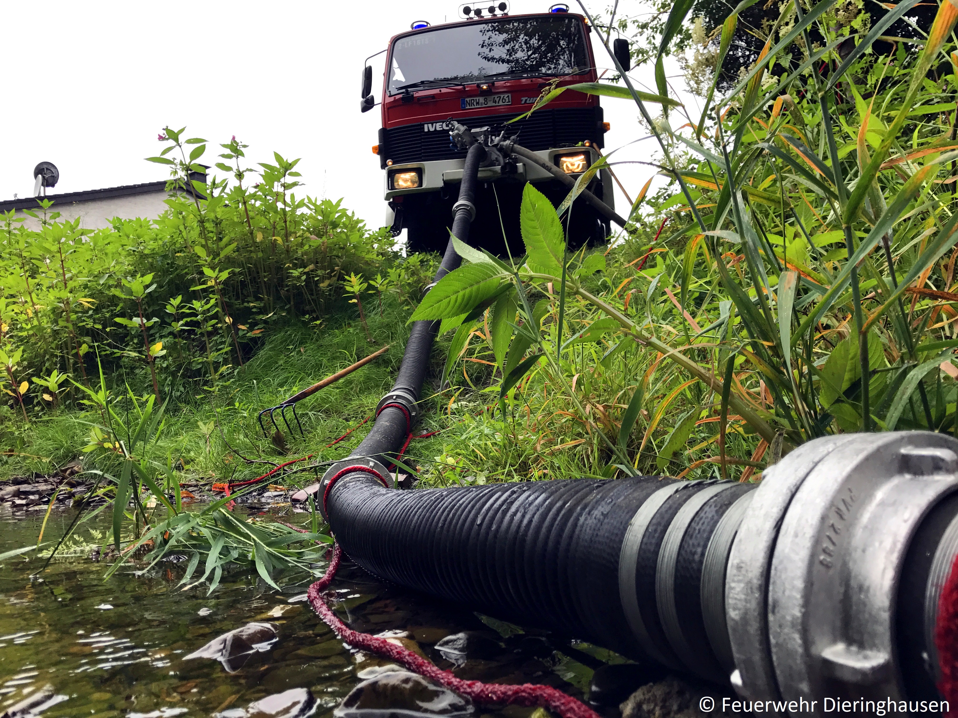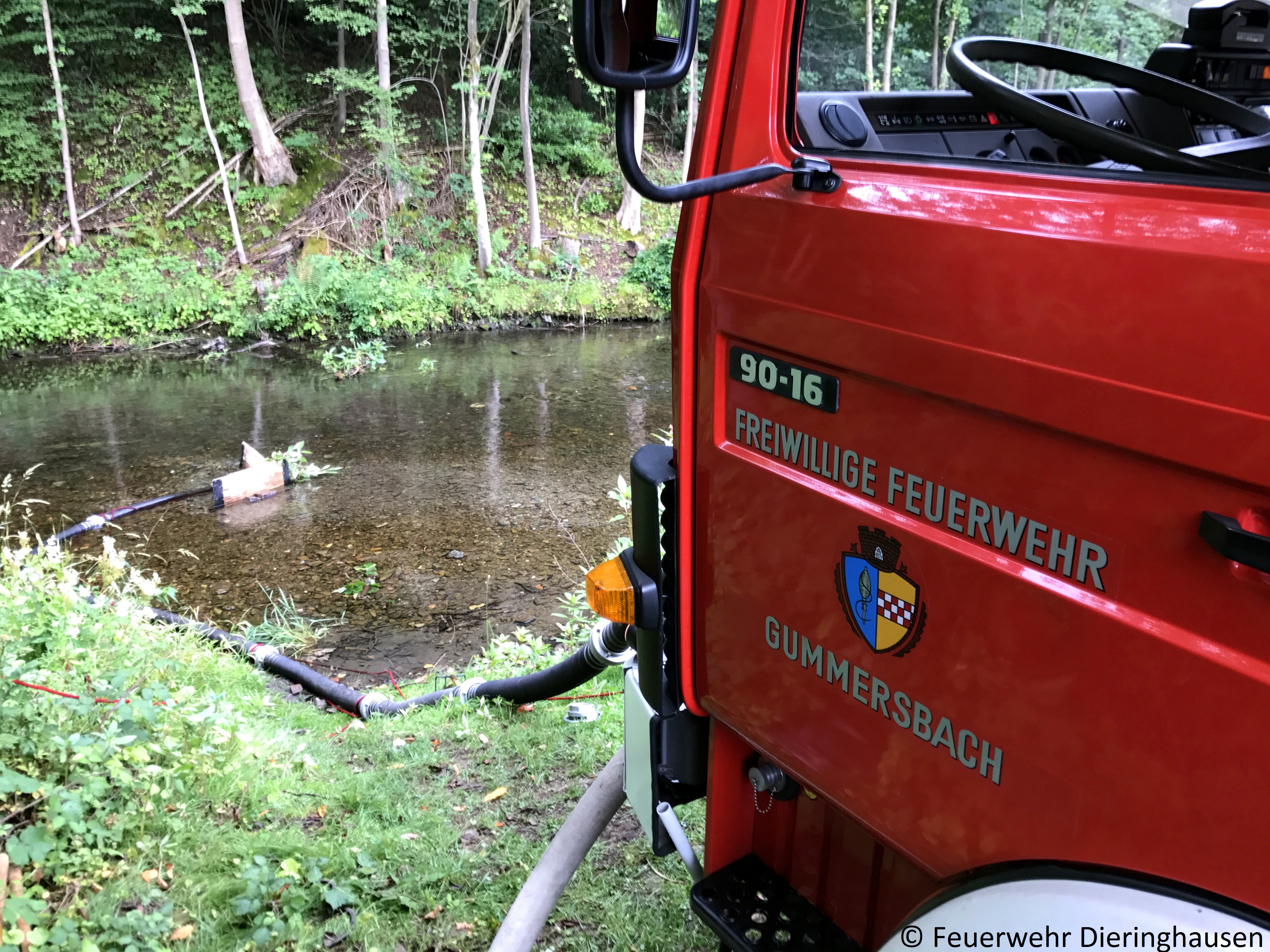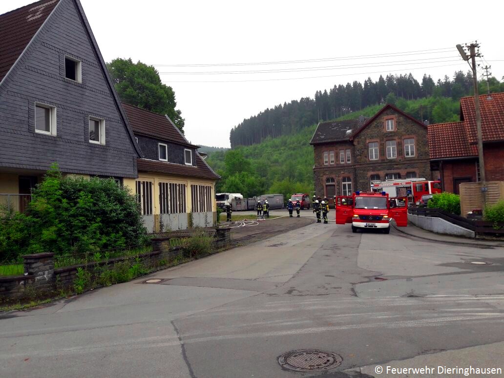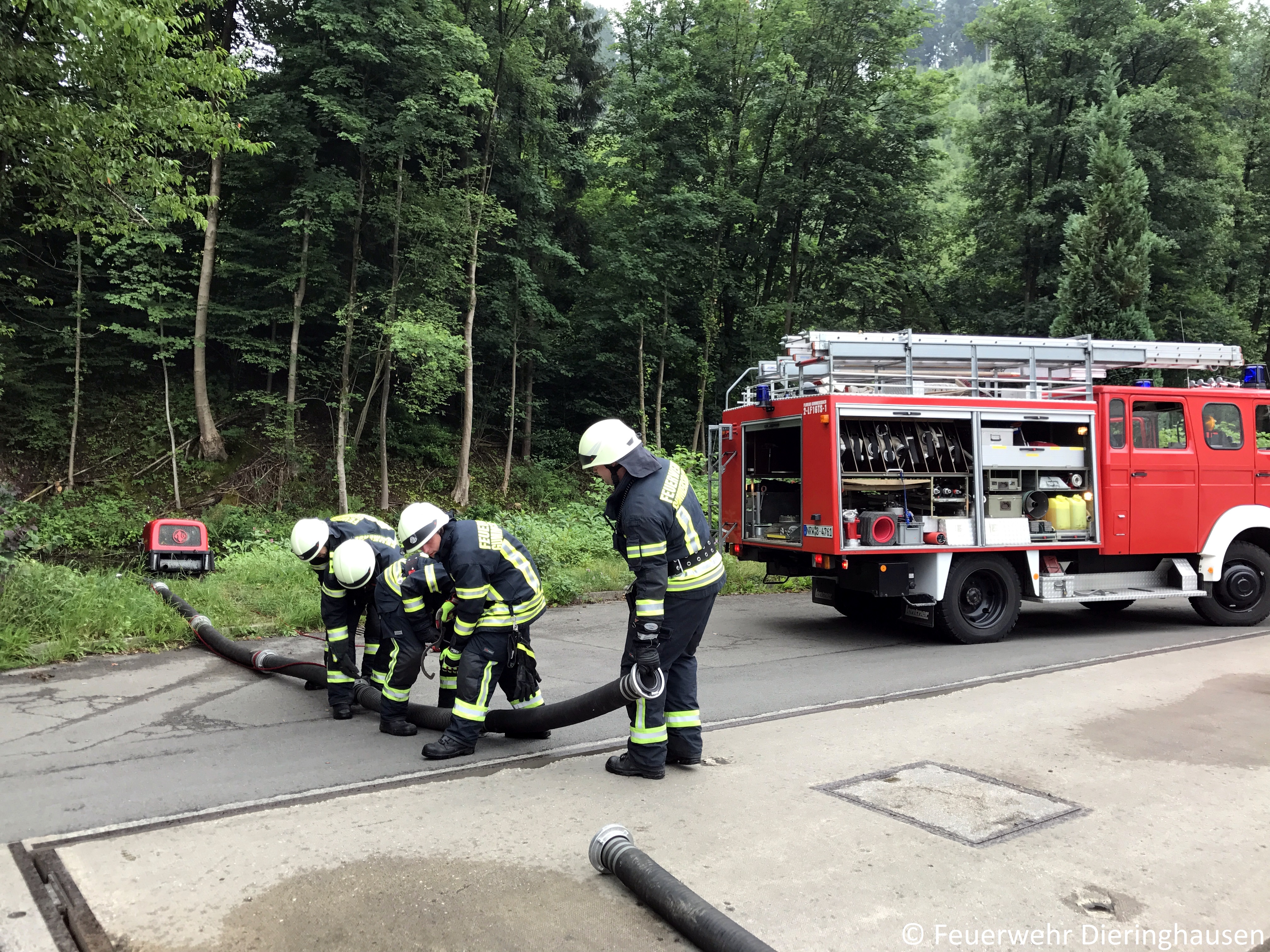 mehreren Atemschutztrupps aus ihrer bedrohlichen Lage gerettet werden. Wir unterstützten die zuerst eingetroffene Einheit Strombach/ Lobscheid bei den bereits eingeleiteten Maßnahmen. Es wurden mehrere Atemschutzgeräteträger der Löschgruppe Dieringhausen bereitgestellt und zum Einsatz gebracht. Außerdem wurde eine Löschwasserversorgung mit dem Löschgruppenfahrzeug aus der nahe gelegenen Agger aufgebaut. Die Zusammenarbeit der beiden Löschgruppen hat hervorragend funktioniert. Die Übung endete mit einem gemeinsamen Abschluss Gespräch zur durchgeführten Übung.