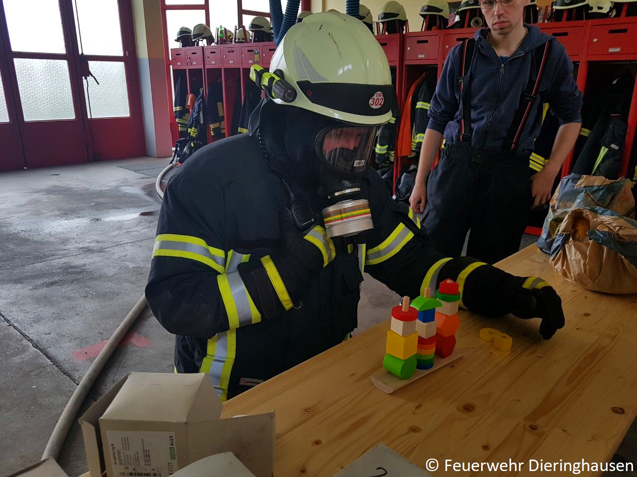 Deshalb trafen sich unsere Atemschutzgeräteträger zu einem Zwischenübungsdienst. Auf dem Plan standen die einsatztaktischen Grundlagen im Atemschutzeinsatz. Darüber hinaus wurde sich mit der Zusatzausrüstung für Atemschutzgeräteträger beschäftigt und die Kommunikation untereinander über Sprechfunk trainiert. Denn durch die angelegte Atemschutzmaske und Flammschutzhaube wird nicht nur das Sehfeld eingeschränkt, sondern auch die Verständigung untereinander.