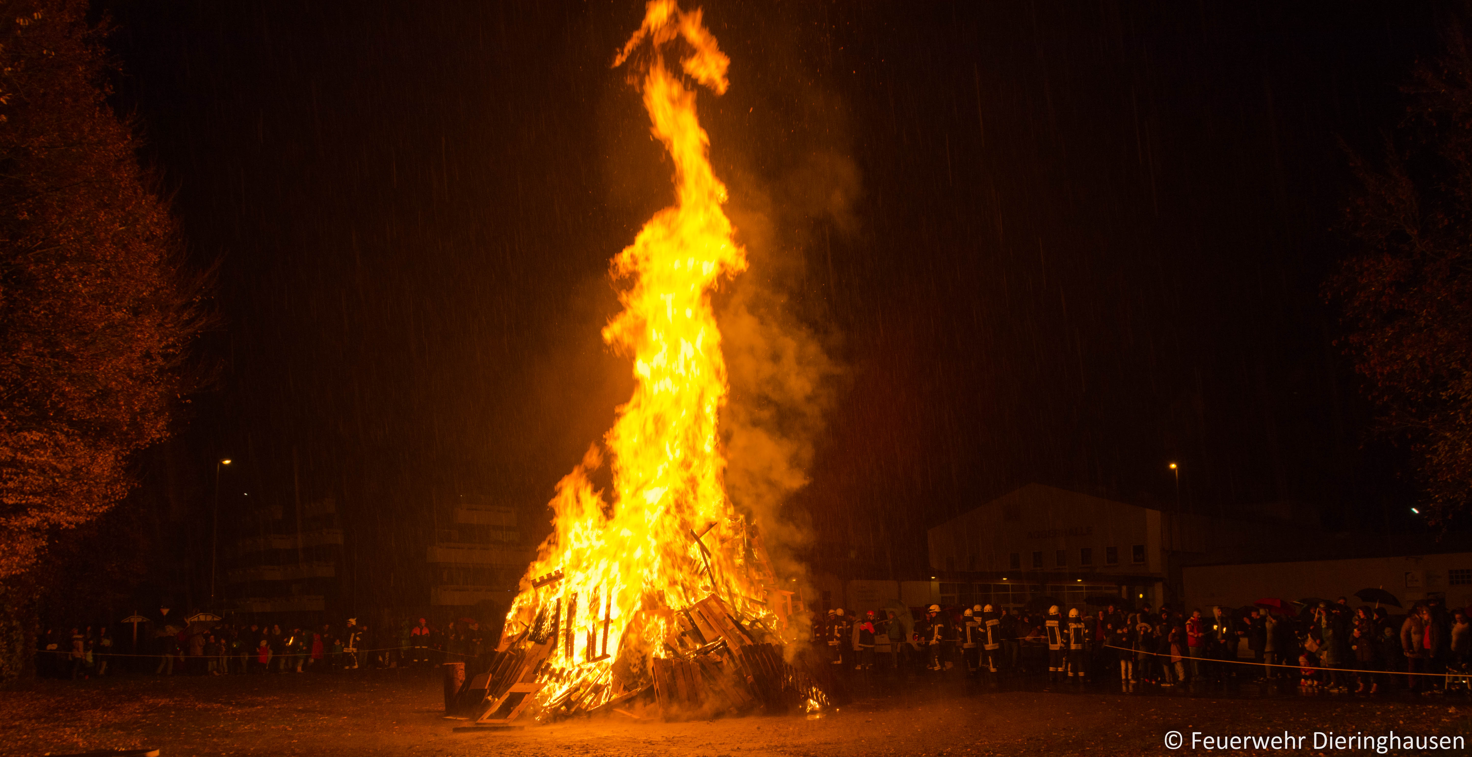 Trotz des schlechten Wetters zogen zahlreiche Besucher mit Sankt Martin auf seinem Pferd durch die Straßen von Dieringhausen. Anschließend wurde das große Martinsfeuer neben dem Feuerwehrhaus entfacht.
