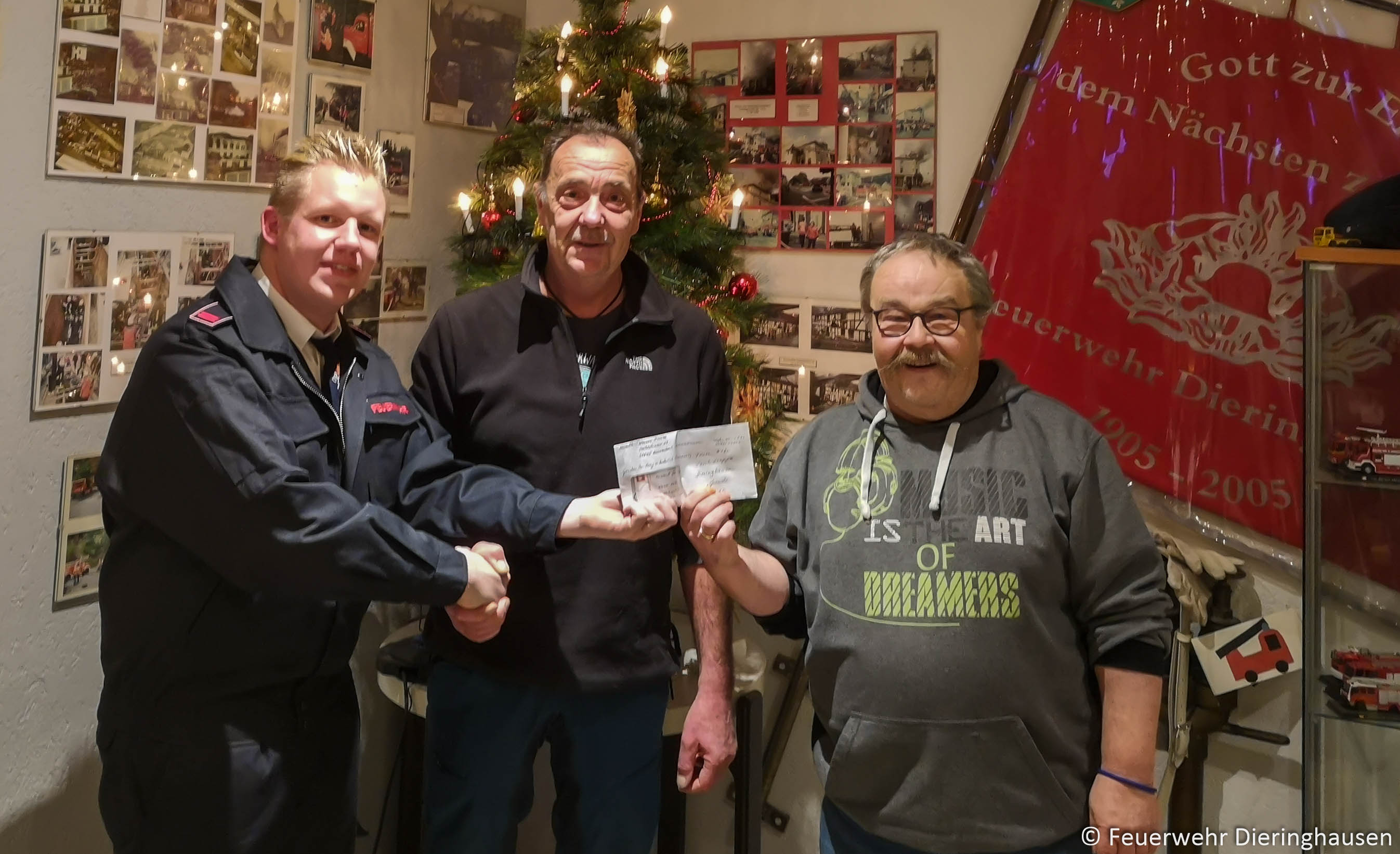 Am Abend überreichte Reiner Lange (Vorsitzender des MGV Brück) einen Spendencheck an den Förderverein der Löschgruppe Dieringhausen. Nach der Vereinsauflösung des MGV Brück kommt somit ein Teil aus dem Nachlass der ortsansässigen Feuerwehr zugute. Die Löschgruppe und der Förderverein bedanken sich ganz herzlich für die Spende.